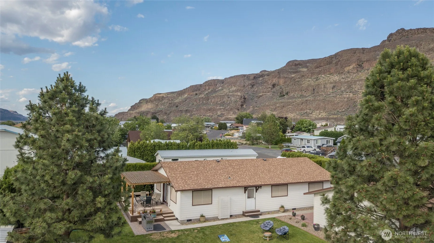 Rare! Beautiful home w/ detached garage on 2 lots in Sunland. Fully furnished, meticulously maintained 3 bed/2 bath home, w/ remodeled kitchen, quartz counters, new sinks and faucets and a large island for entertaining. Both baths appointed with new tiled walk-in showers, quartz counters, new cabinets/ fixtures. New ceiling fans, solid doors, blinds and baseboards. The back deck w/pergola has ample seating while enjoying views of the Basalt Mt. The combo of 2 lots creates a private fully fenced backyard, as well as front courtyard for morning coffee. Oversize garage w/workbench, tools, games, bev. fridge& freezer. Plenty of RV and boat parking. Great location, close to park, pool & store. 5 min to the Gorge Ampitheater 2 hrs from Seattle.