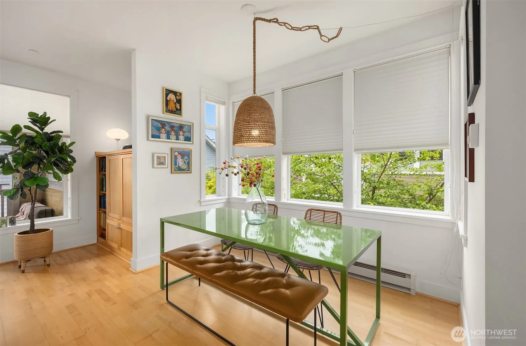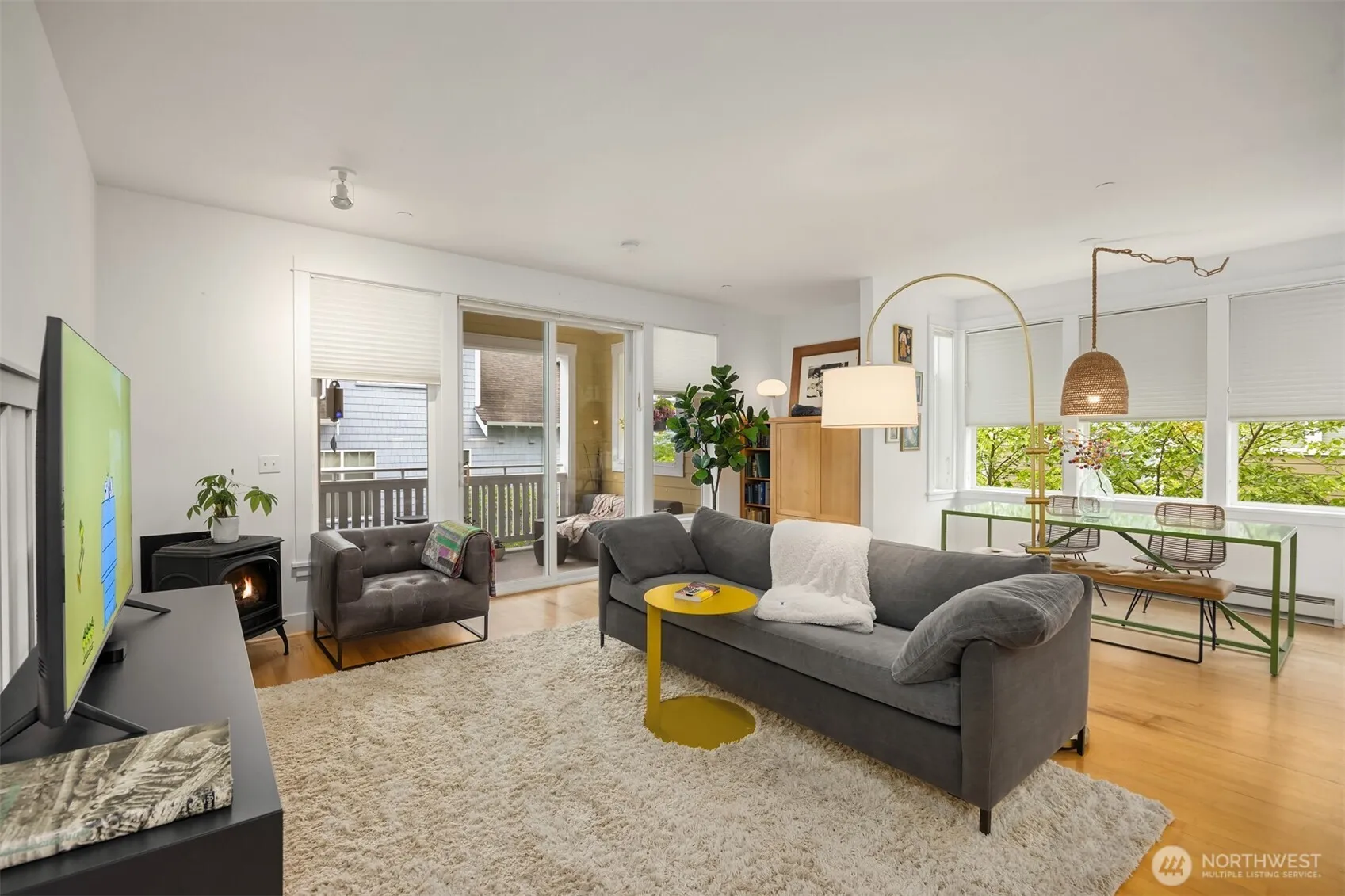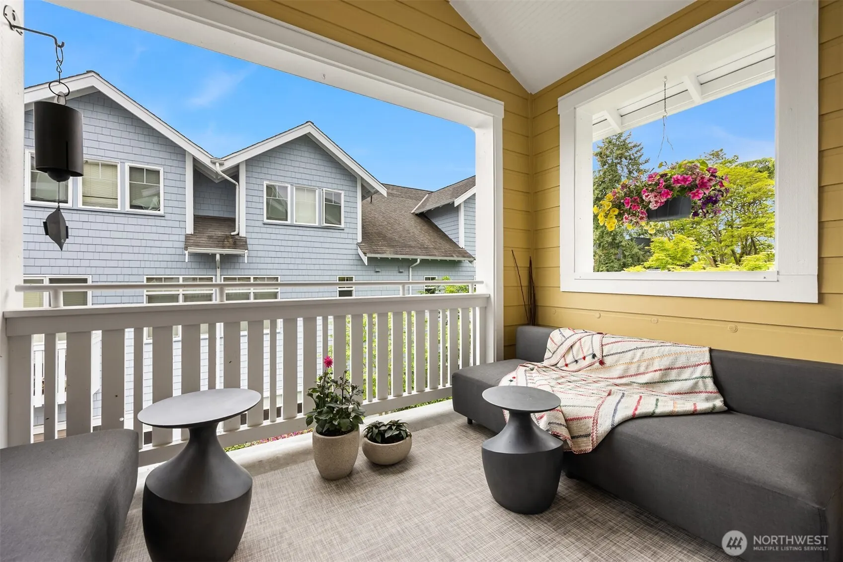 Convenience, Security, Serenity! Beautiful Second-Floor Madrone Village home with no shared walls! Easy access via secure elevator from the parking garage to the front door. Two bedrooms include a spacious primary suite with a large walk-in closet, travertine double sink vanity, shower, and tub. The second bedroom is served by a full bath. Maple floors blend with the maple built-in entertainment center and kitchen cabinets. The kitchen features granite tile counters, a dual fuel propane range, side-by-side fridge, stainless double sink, and dishwasher. Enjoy the covered balcony, a free-standing propane fireplace, and a private garage storage closet. Stroll to restaurants, markets, bakeries, Waterfront Park, the Marina and the Seattle Ferry!