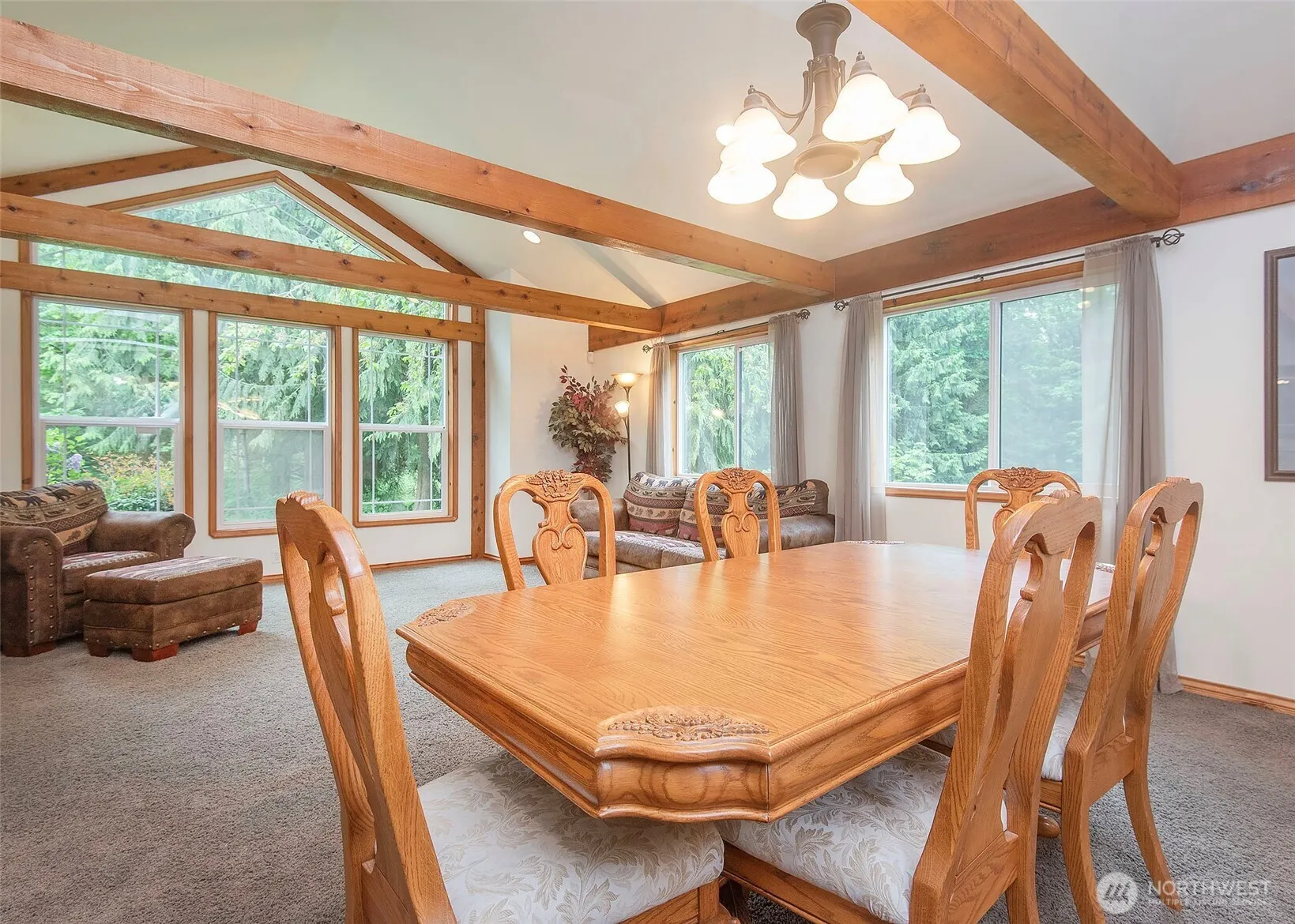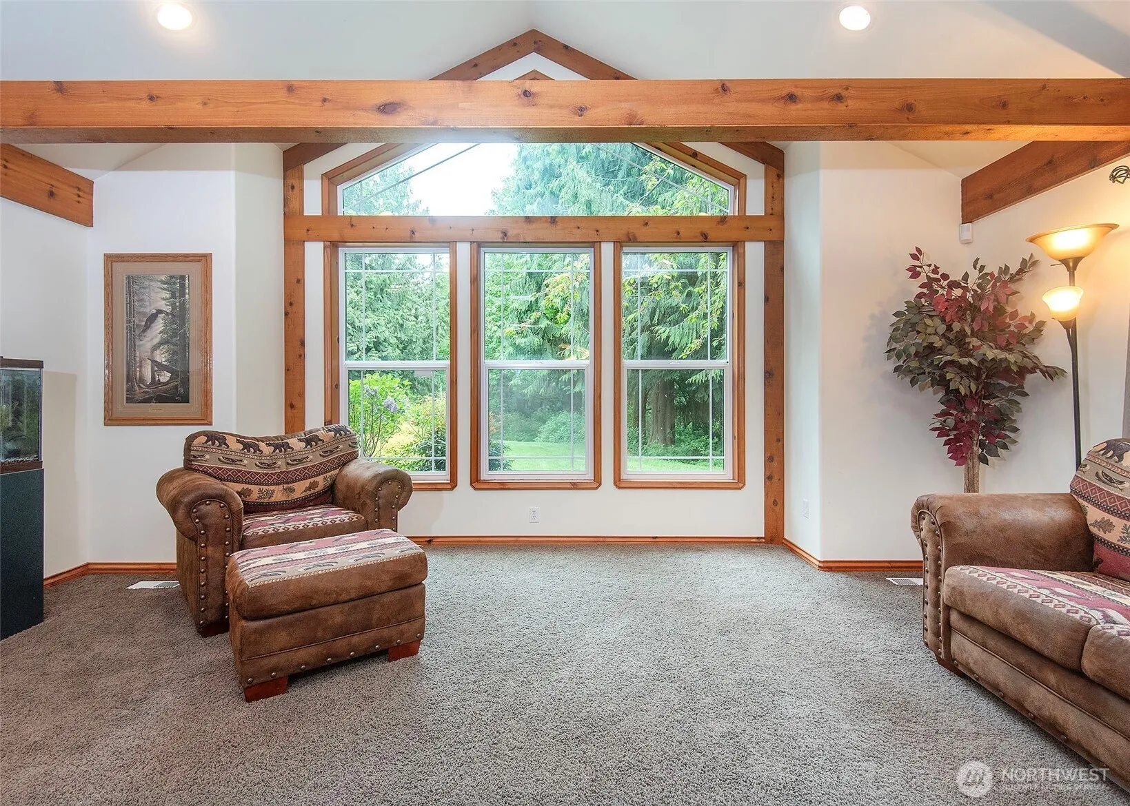 Nestled on 5 secluded, wooded acres, this well-maintained home offers ultimate privacy & peace. Peace of mind with a newer roof, gated driveway, & wired for generator. Privacy as this is the last home on 58th. You are greeted by open beams, vaulted pine ceilings & millwork. Walk into the light filled great room and enjoy the crackle of a wood burning fireplace. The island kitchen, features double ovens, & a walk-in pantry. Vaulted ceilings continues into the primary suite, which offers a luxurious 5-piece bath with tile, a jetted tub, and walk-in closet. The private back yard is integrated into the living area w/ access from the great room & primary suite. A three car attached garage, designated garden space & No HOA.