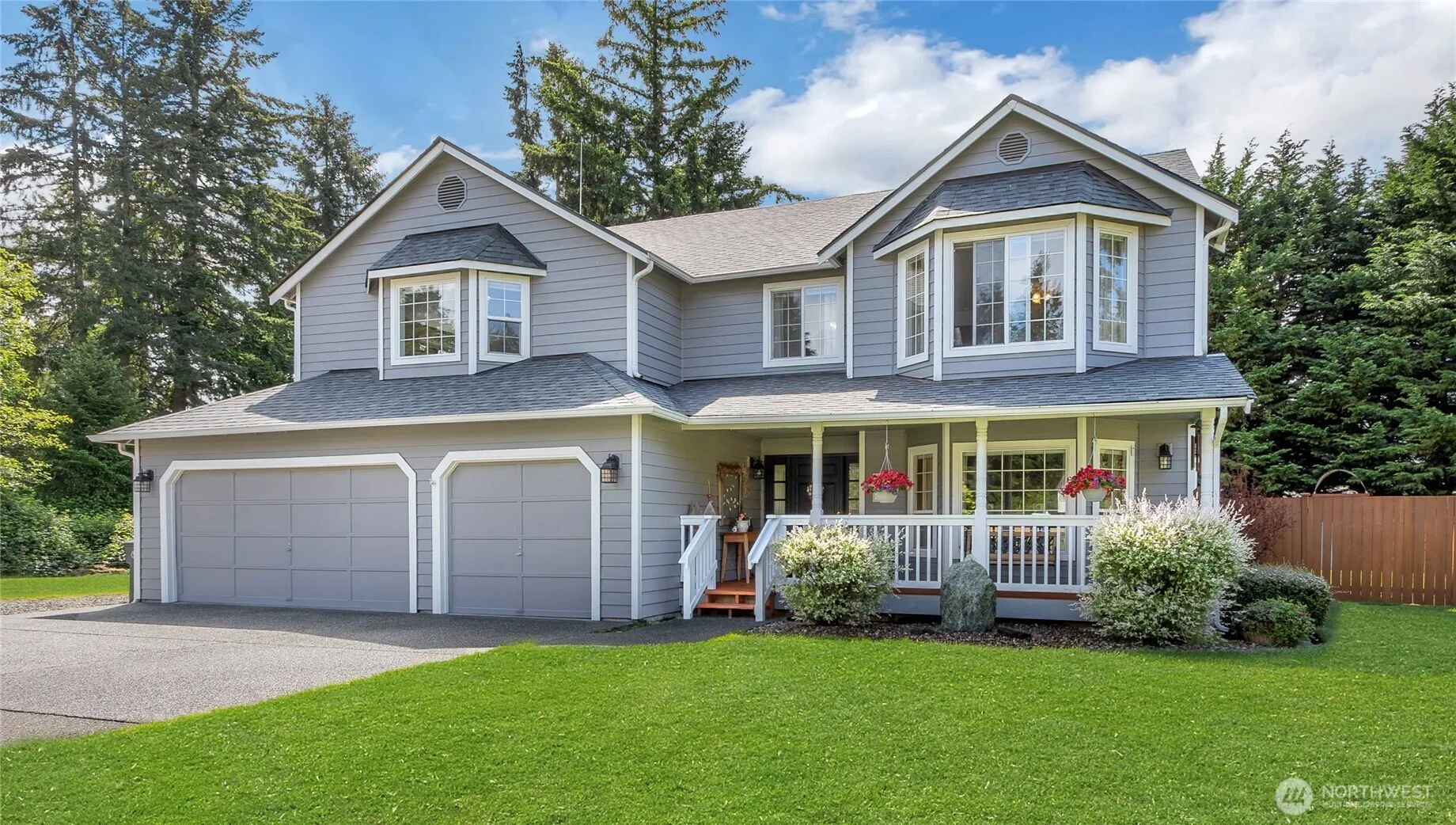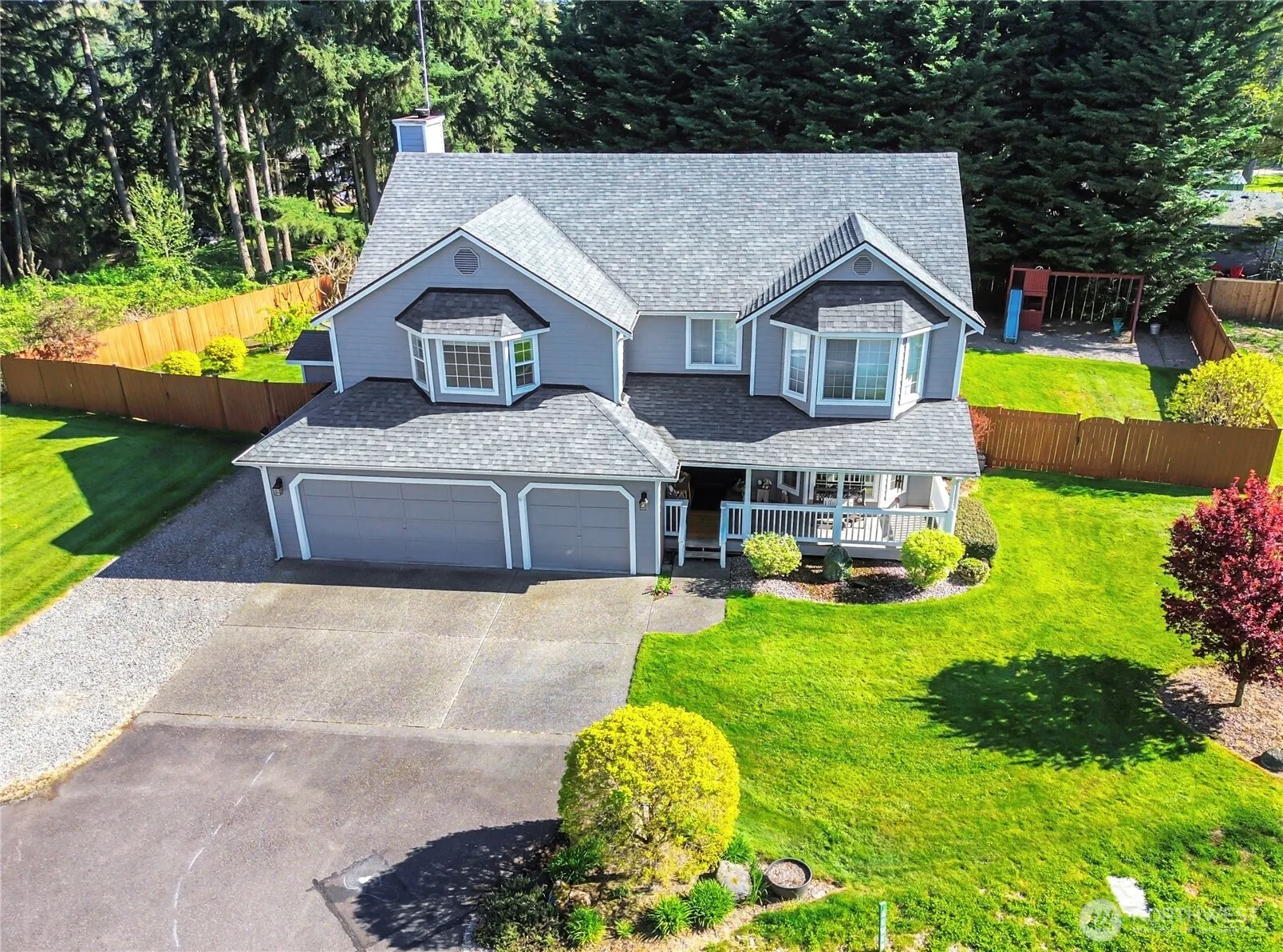 Shy half-acre lot w/serene partial views of Mt. Rainier! Offering 3,075sqft w/4 bd, bonus rm, 2.5bths, 3-car garage, & RV parking. Open living & dining areas ideal for entertaining plus large laundry rm for convenience. Kitchen features granite counters, stainless steel appliances, induction oven, & eating nook. Family rm of kitchen includes wood-burning fireplace. Primary suite has walk-in closet & luxury bath w/double sinks, soaking tub, separate shower, & heated floors. Private, fully fenced yard w/double gates, sprinkler systems front & back, mature landscaping, water features, stamped concrete patio w/gazebo, & storage shed. Extras include central vacuum, generator wiring, newer heat pump, water heater, roof, & more!