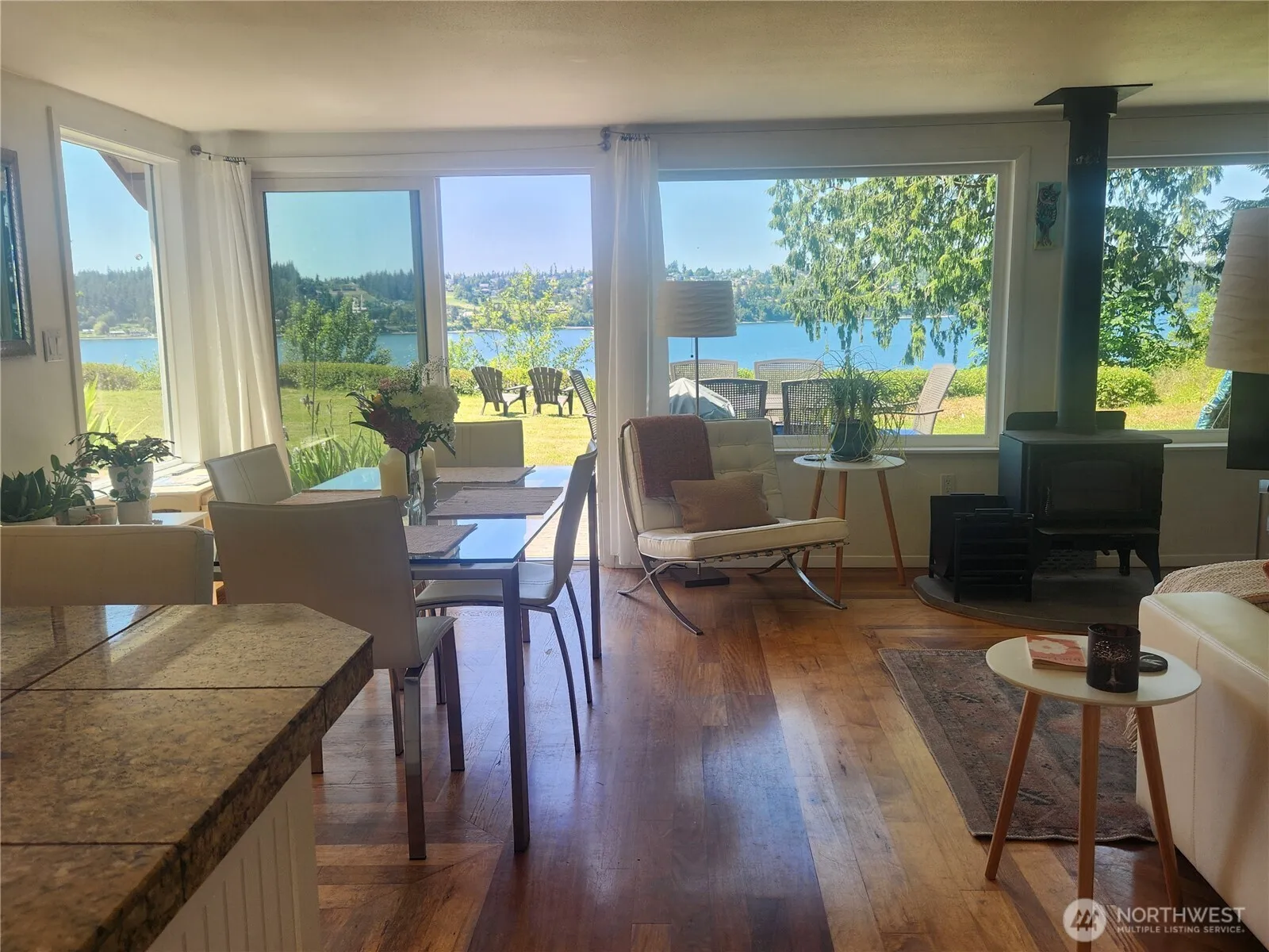 Amazing, must see opportunity! Total of almost 2200 sqft living space combined in two dwellings. Just over an acre of beautifully landscaped waterfront property located just 1+/- mile from all that downtown Freeland has to offer! Wind your way down the tree-lined drive way to this magical property with plenty of indoor and outdoor spaces for quintessential island living. Open concept layout and a cozy woodstove in the main house. Back deck and side patios for relaxing and/or entertaining with 73 feet of water frontage to take in the stunning sunset, mountain & water views! ADU has multiple flex rooms and studio spaces and was finished and power installed in 2015. No restrictions/CC&Rs. This is the one!