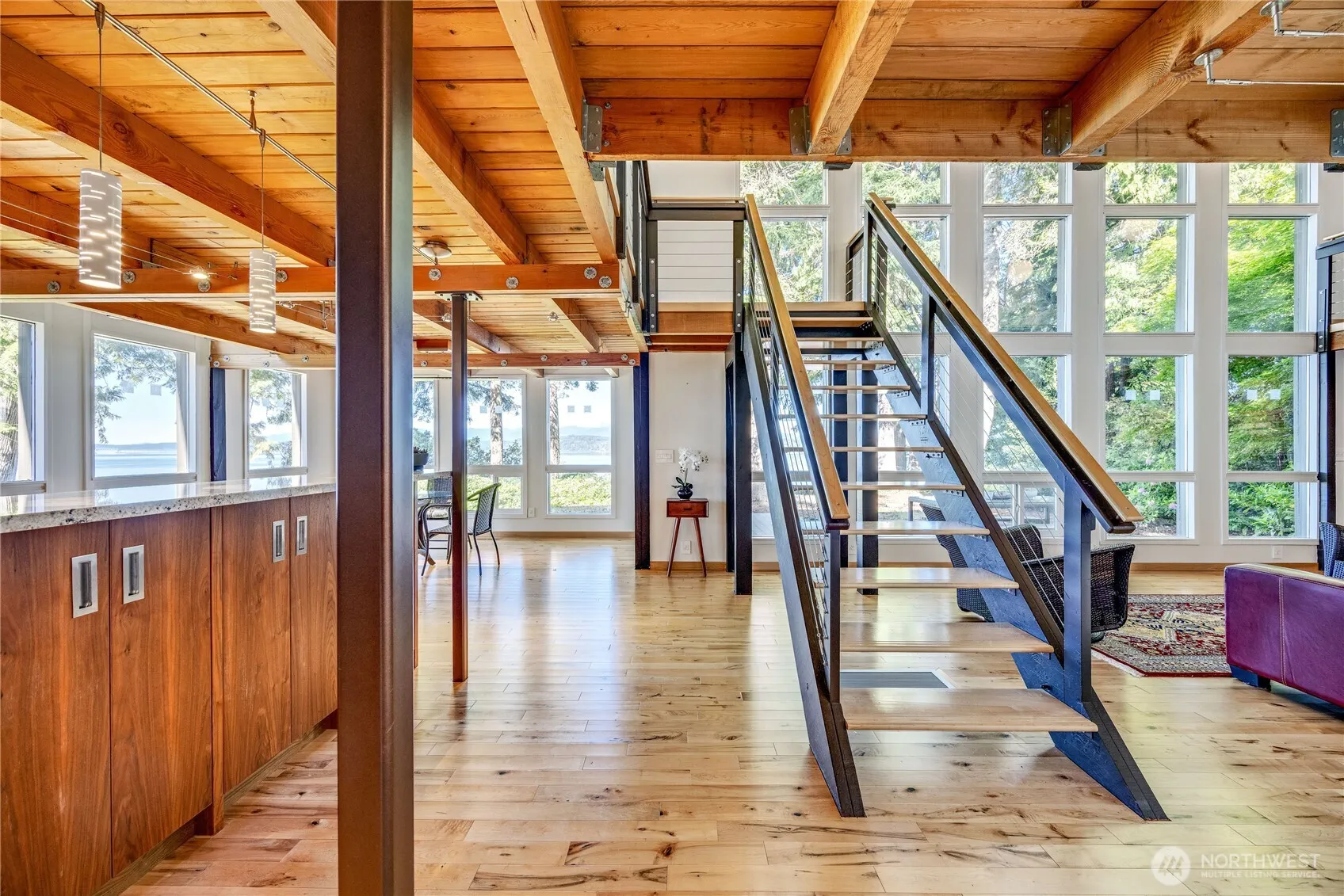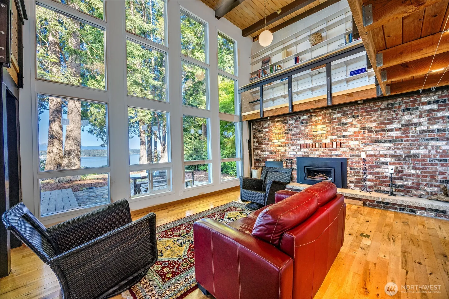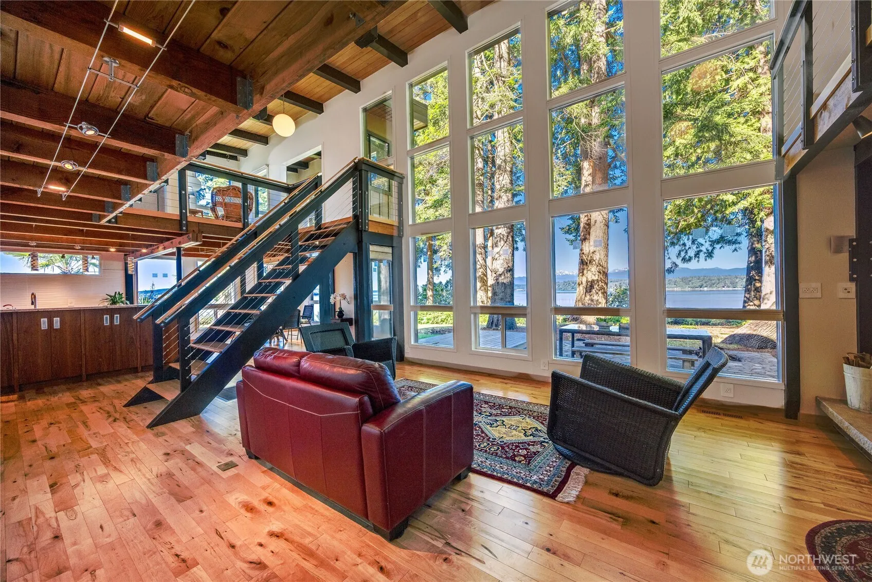 Stunning Hood Canal waterfront w/uncompromising sunsets over the Olympics & unbelievable 180 water views that include both Pt Gamble and the Hood Canal Bridge! This breathtaking one of a kind home was designed to maximize the view from every room! No expense was spared in the meticulous updating of this beautiful home from the gorgeous wood floors, modern kitchen & baths, & ultra cool space age lighting. This 2 bdr, 2 bath home has a great open floor plan, living room with expansive wall of windows, warm brick fireplace, den and guest bath on main floor. Very cool cat walk and bedrooms on upper floor! Add’l 432 sq. ft. cottage, detached 2-car garage, 2 shops, & greenhouses. Private winding DW and quiet setting. Property includes tidelands.