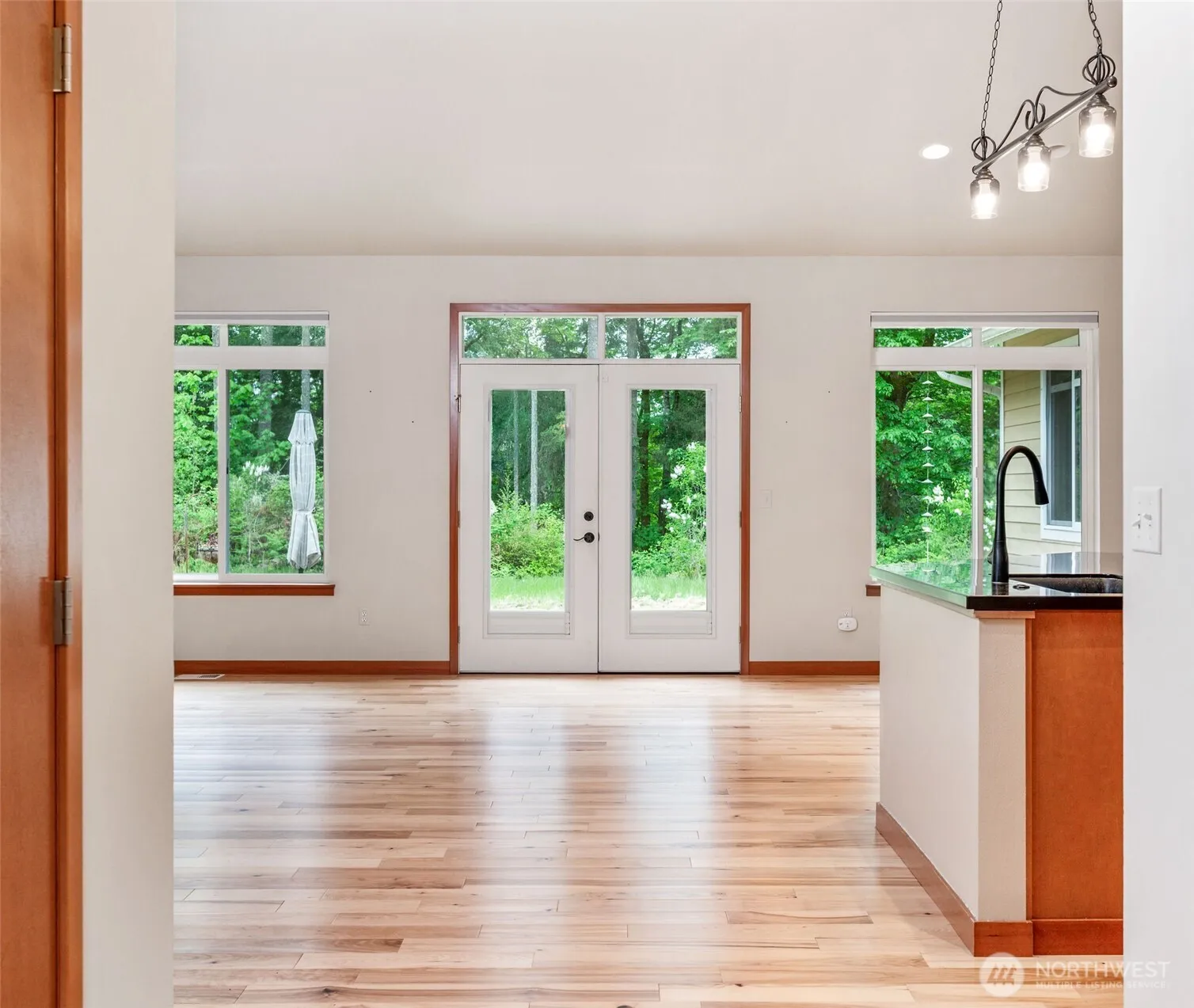Experience single-level living on a picturesque and private 5-acre property in Chimacum, situated on a serene dead-end street. This beautiful home, accessed through a gated driveway, offers 3 bedrooms plus 2 versatile extra rooms ideal for an office, den, or study. The primary bathroom boasts a shower and a soaking tub. Enjoy luxurious countertops and Hickory hardwood floors throughout. A 624-square-foot attached garage provides ample space for vehicles and storage. Outside, a fenced orchard awaits, featuring raspberries and apple trees.