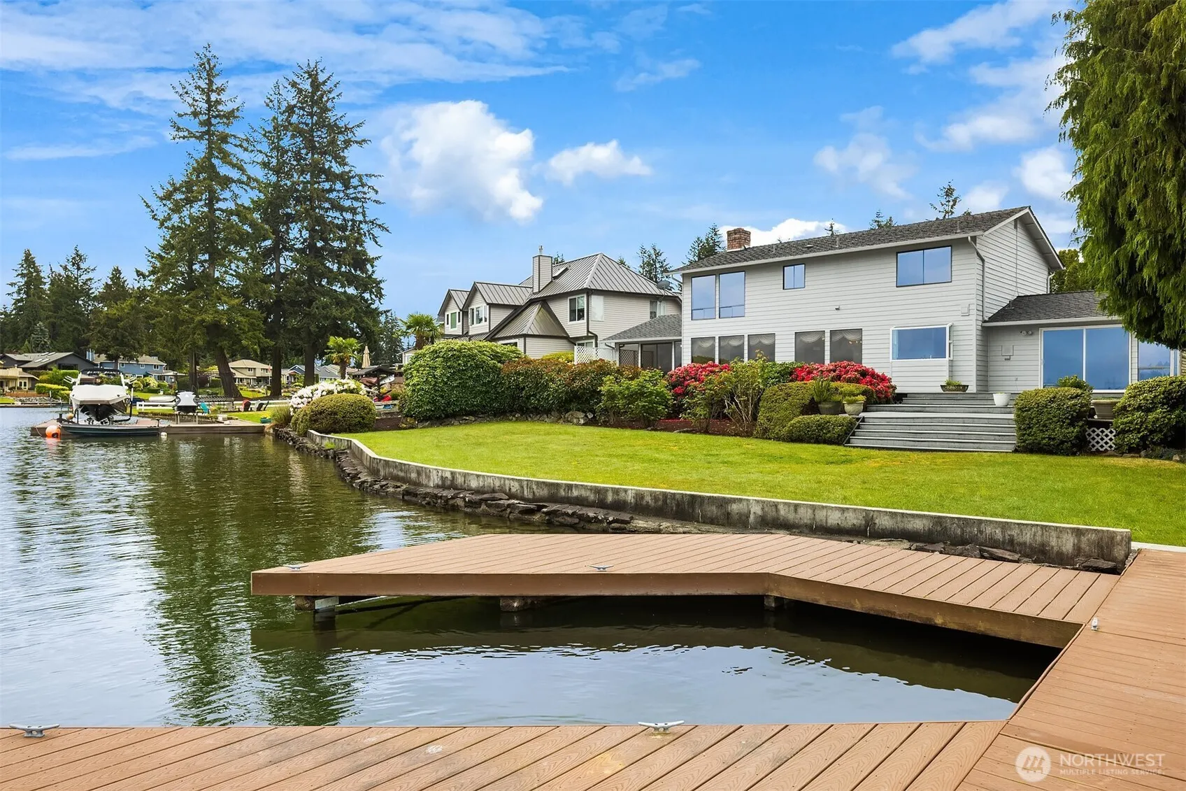 Prominently poised at the tip of a coveted point on Tapps Island, this sprawling 2-story boasts sweeping up lake views & 110′ of prime beachfront! Brilliantly designed, the 2,676sf 4 bed 2.5 bath floor plan is ideally oriented with breathtaking water views from seemingly every angle. Sunken living room with grand fireplace opens to cascading staircase & formal dining. Updated kitchen with slab counters, garden window & breakfast nook. Huge family with basalt gas fireplace. Main floor primary suite with 3rd fireplace. 1/3 acre dream lot with massive full-length deck, spacious lawns, mature gardens & newer dock with boat slip. A vibrant & secure lakefront community with golf course, clubhouse, restaurant, pool, tennis courts & boat launch!