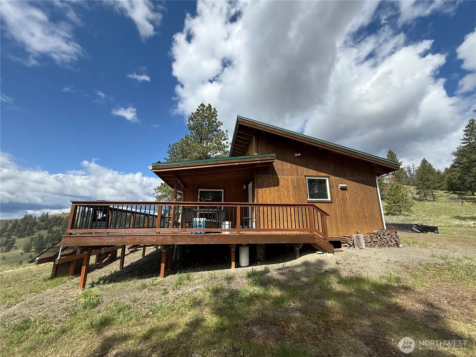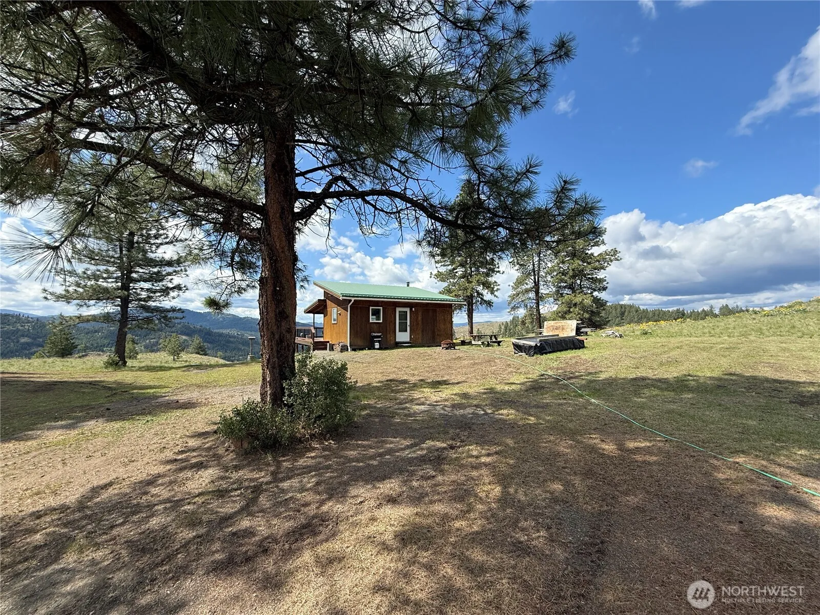 Picture perfect setting for this neat as a pin cabin. Spectacular views from your full length deck or your large front windows. This nicely timbered acreage is completely ”parked out”. Cabin features vaulted ceilings, bamboo floors, custom cabinet, and a perfect sized eat-at kitchen island. Stainless gas range as well as stainless solar refrigerator complete the kitchen. Both the full length deck and indoor trim are made from Batu. Both a drilled well and 2-bedroom septic are already in and just need to be hooked to the cabin. Storage shed with covered front porch. Hay barn in semi-enclosed with storage. Solar system for self sustained, off-grid living. Very pretty, private setting.