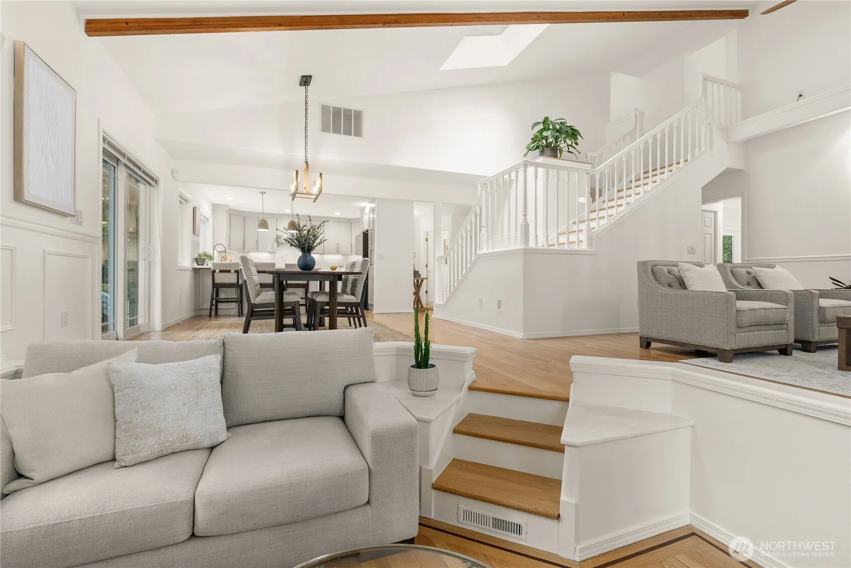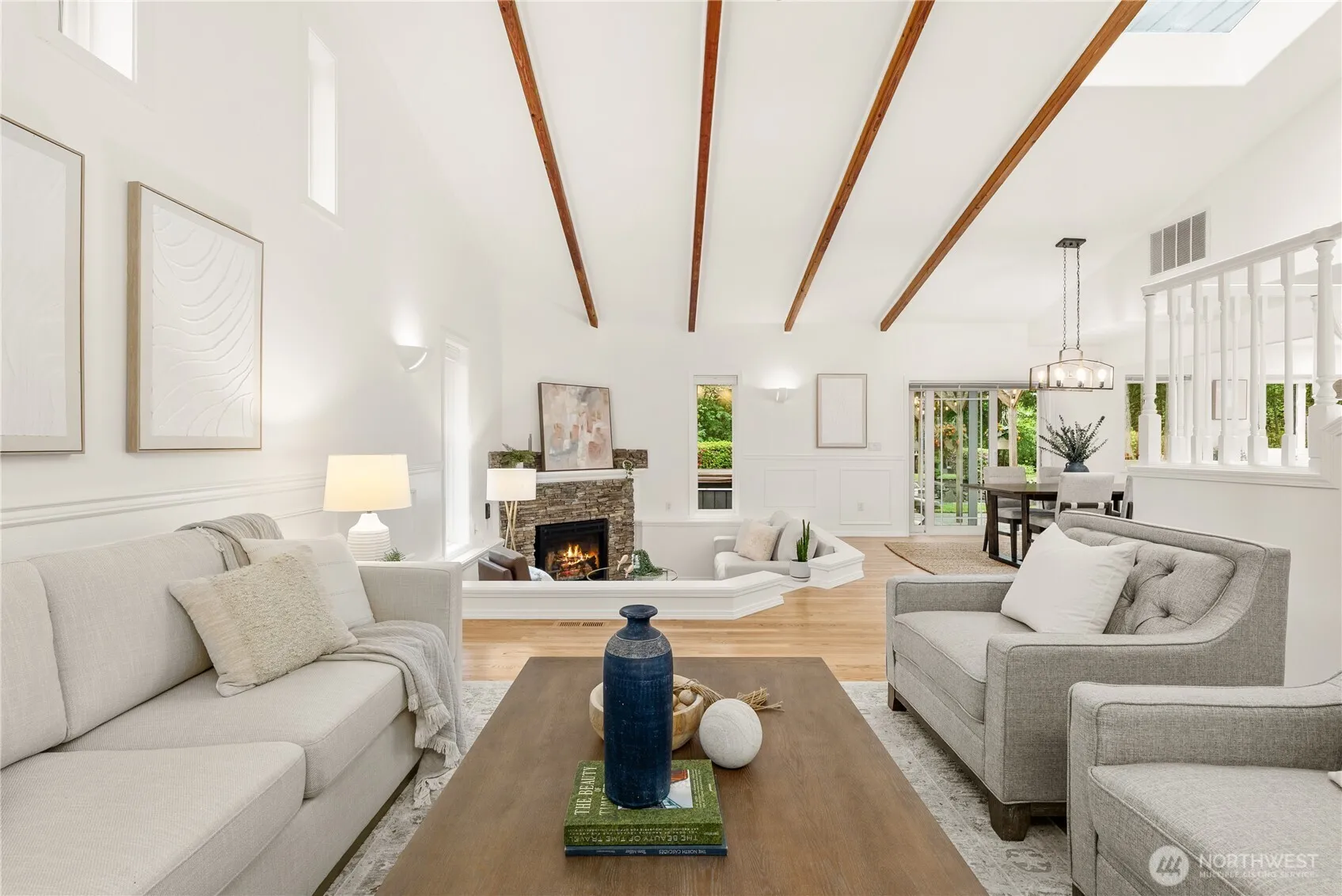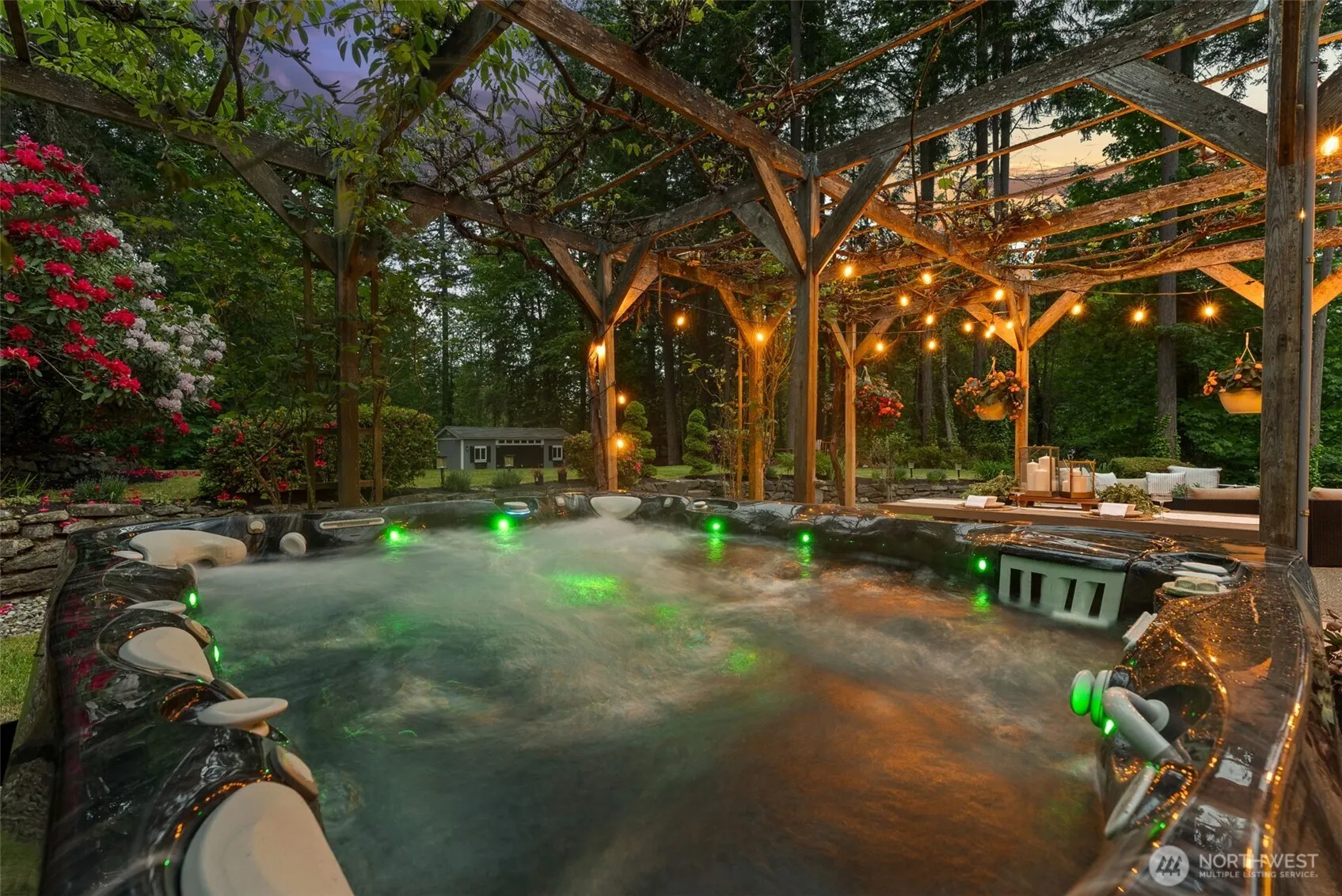 A designer-curated sanctuary on a coveted street on Fox Island w/over an acre of peaceful garden oasis surrounded by majestic trees. The stunning kitchen impresses w/quartz countertops w/bookmatch backsplash, new cabinetry w/rollouts, gas range, farmhouse sink, and a new fridge! Oak hardwoods throughout, soaring beams, grand staircase, sunken fireplace area offer casual luxe living. The vaulted primary wing is a true wellness retreat w/freestanding soaker tub, dual rain shower, sauna & impressive dressing room w/WIC. RV garage w/shop. Relax in the 8-person hot tub or dine beneath a grapevine-draped pergola—where the golden hour light turns everything magical. Too many features & updates to list! The best of Fox Island living. A must see!
