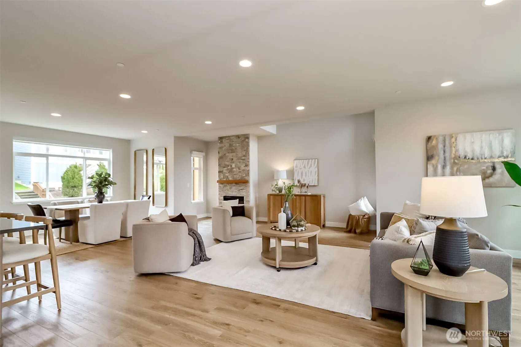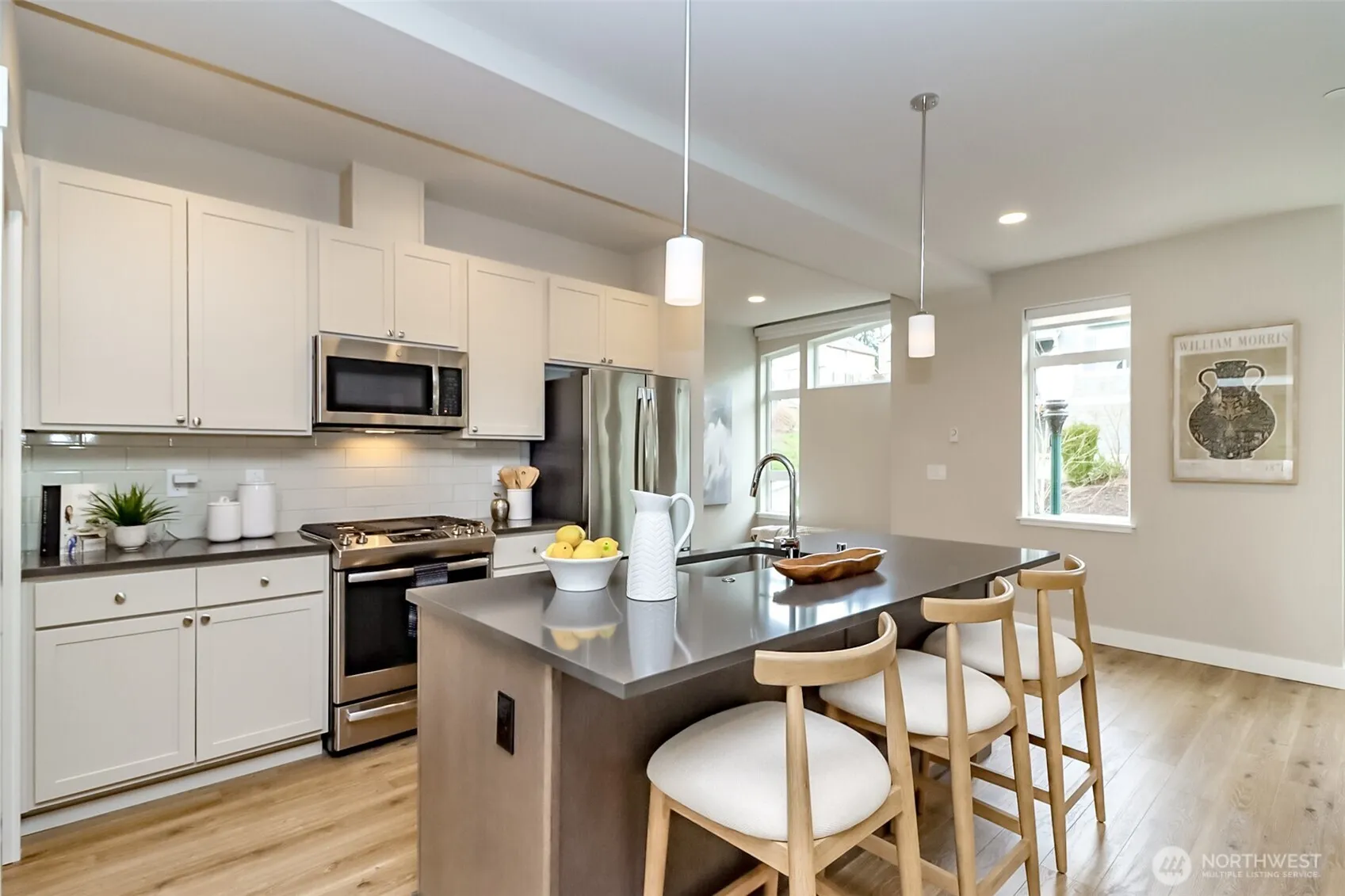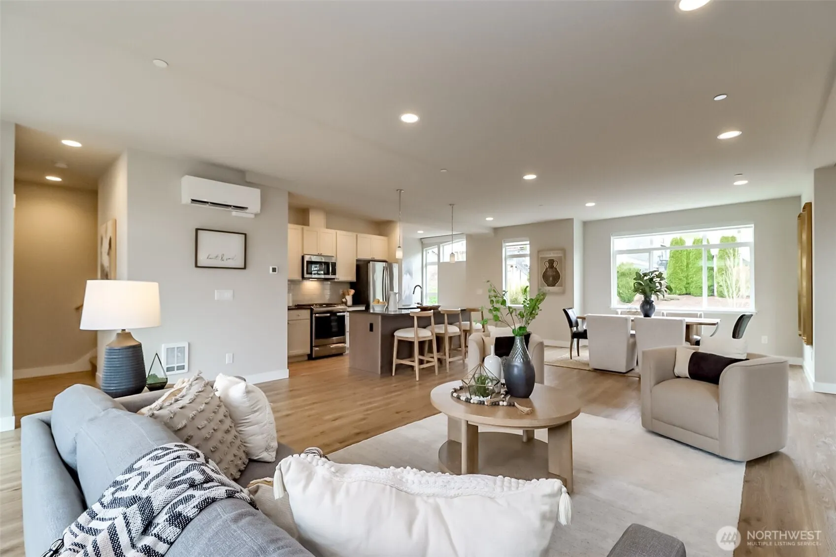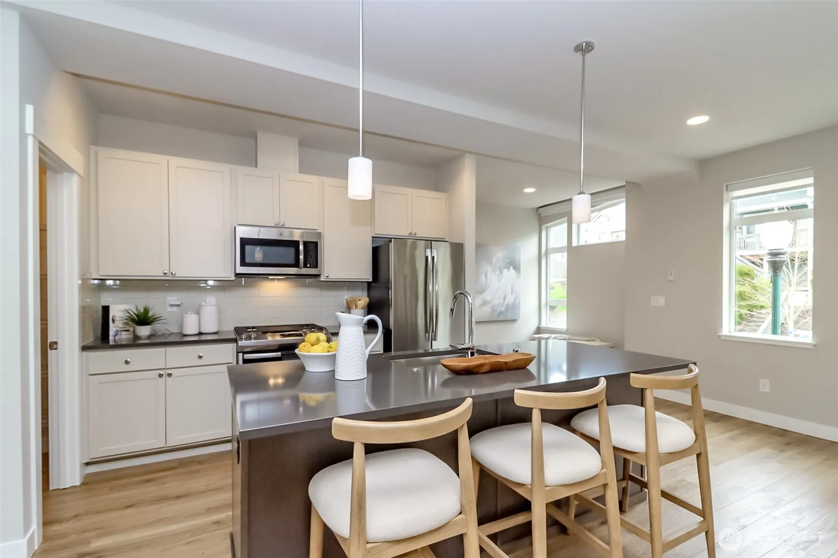 Each of the three bedrooms boasts its own ensuite bath, offering unmatched privacy and luxury. High ceilings, modern finishes, and luxury amenities elevate the space. The open concept great room seamlessly blends the kitchen, featuring granite countertops and high-end touches with the living and dining areas, perfect for entertaining. A cozy gas fireplace adds warmth, while the smart home package enhances convenience. Located in vibrant Duvall, you’re steps from parks, river trail, top schools, and a charming downtown with dining just minutes away. A perfect blend of style, comfort, and technology.