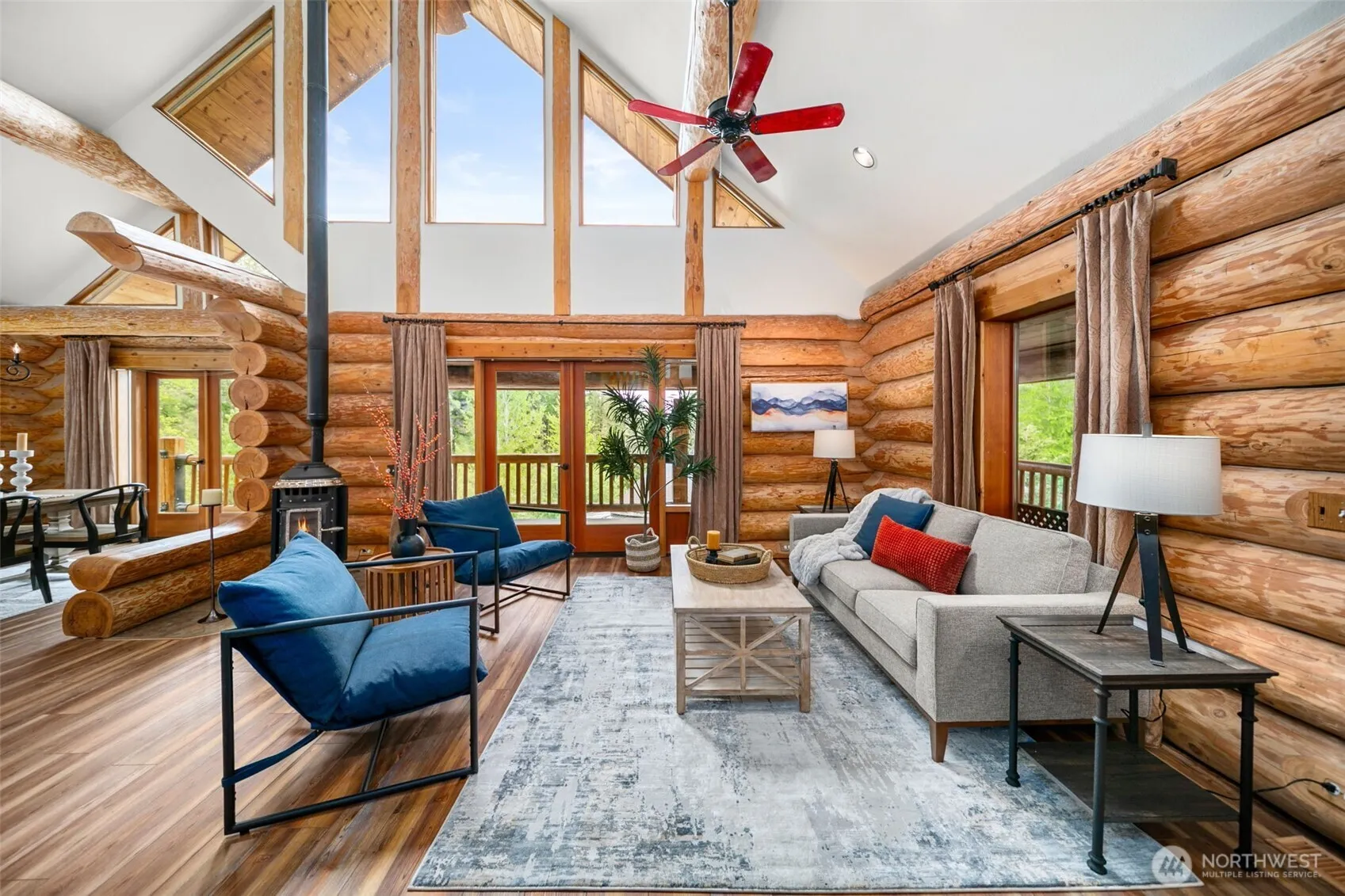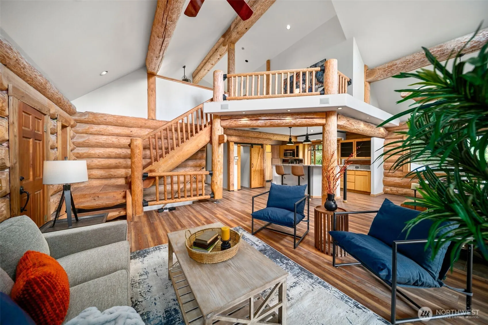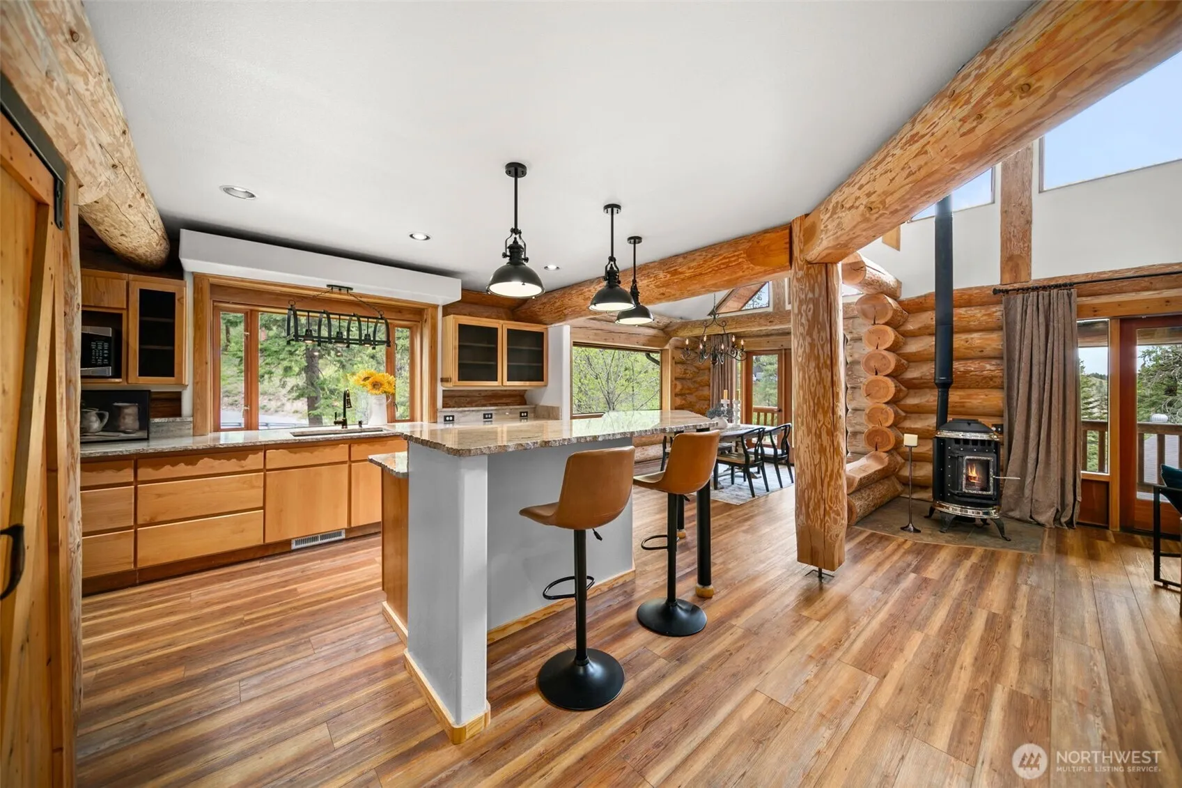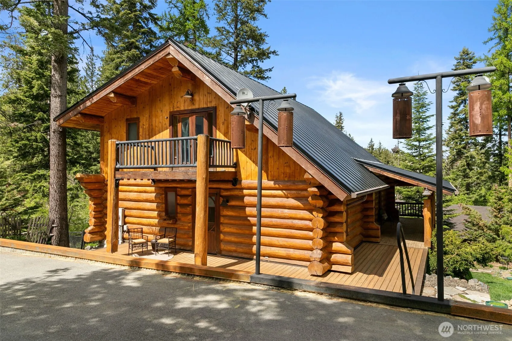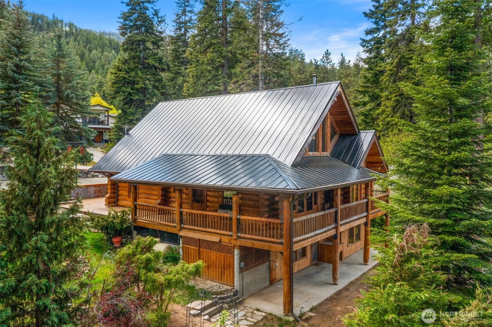Tucked on a private corner lot with sweeping mountain views, this A-frame home is a peaceful escape just 15 minutes from Wenatchee and 10 to Mission Ridge. Crafted as a signed and engineered log home, it blends rustic charm with comfort. The open kitchen offers granite counters, a large island, and walk-in pantry, flowing into a vaulted great room with wood stove and French doors to a wraparound deck—perfect for quiet mornings. The lofted primary suite features a private balcony and extended walk-in closet. Downstairs includes two bedrooms, a full bath, and a cozy family room with gas fireplace. A 1,200+ sq ft shop with lean-tos adds space for storage, hobbies, or all your adventure gear. Ideal for full-time living or seasonal escape