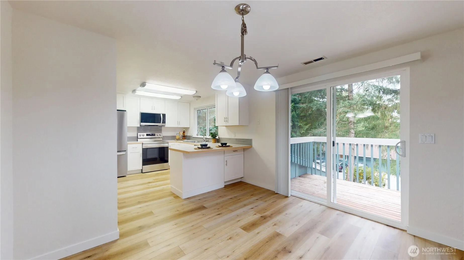 Remodeled 3-bedroom duplex w/vinyl windows, new Floors throughout, Paint, Cabinets and Appliances w/ economical gas forced air heat, gas hot water & gas fireplace w/marble surround. Skylights in baths & kitchen, garage w/opener. Master suite offers en-suite 3/4 bath & triple wide triple door closets/lots of storage. Large entertainment deck off the dining room, country kitchen with breakfast bar. Large living room overlooking expansive deck. Large bedrooms. No pets/No smokers. Only 1 unit is available now, references, credit & background checks are required. Centrally located to all bases, minutes to freeway.