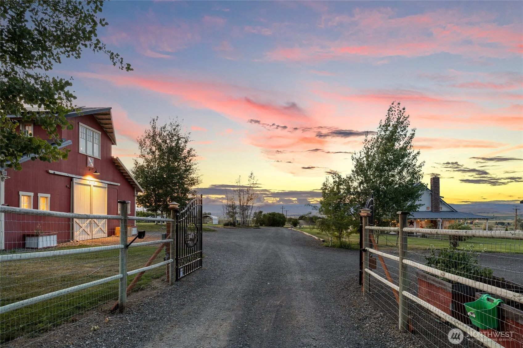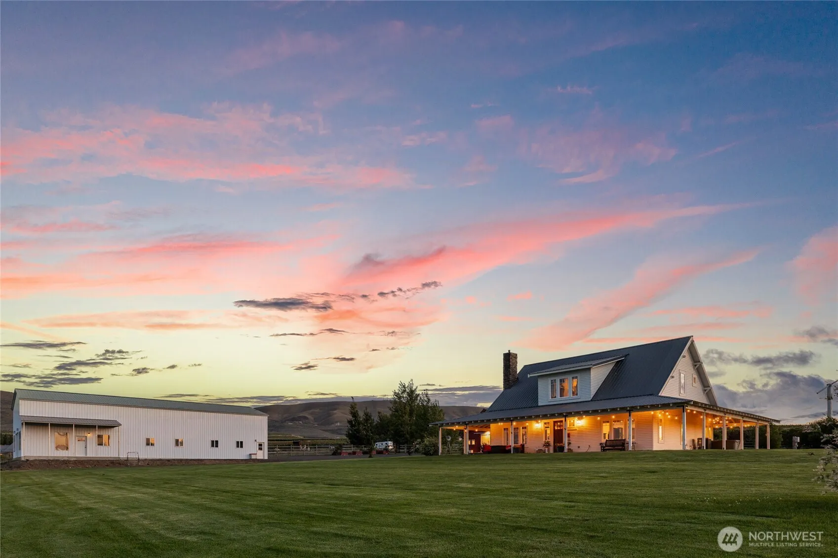 Completely custom, impeccably outfitted modern farmhouse with multiple outbuildings in the perfect country setting. Beauty in the details: rich, reclaimed wood flooring, statuesque river rock fireplace, the natural warmth of exposed beams. Main floor primary with luxurious en suite. Gourmet kitchen centered around a large island, surrounded by marble. Fully-equipped 38×48 workshop with main floor bathroom + laundry; finished addl bed/bath (with living space and w/d) & office on the upper level. New 48×80 shop with room to spare. Fully fenced, with cross fencing; wheel lines and pressurized KRD irrigation. EV charging station; solar panels to offset energy costs. The home of your dreams with space for everything and everyone. Welcome home.
