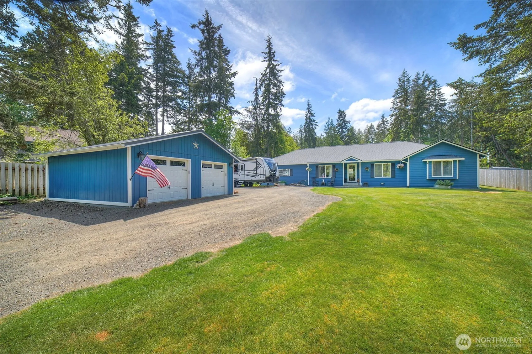 This beautiful 3 bed/2 bath rambler in desirable Misery Point Community in Seabeck is turn-key and pops! New 50-year roof with transferable warranty, new gutters with Leaf Guard, new floors, new Quartz countertops, stainless steel appliances, heat pump, and cozy wood stove. Bonus multi-purpose room off the dining for a secondary living room for movie nights, pool with friends (pool table conveys), a spacious office, or more. The options are endless. The back covered patio is the perfect space to unwind even on a rainy day. 2 car detached garage and a 80×40 shop for a whopping 3,200 sq ft for all the toys. Close to boat launch and historic Seabeck shops. Feel secluded but close to shopping and both bases.