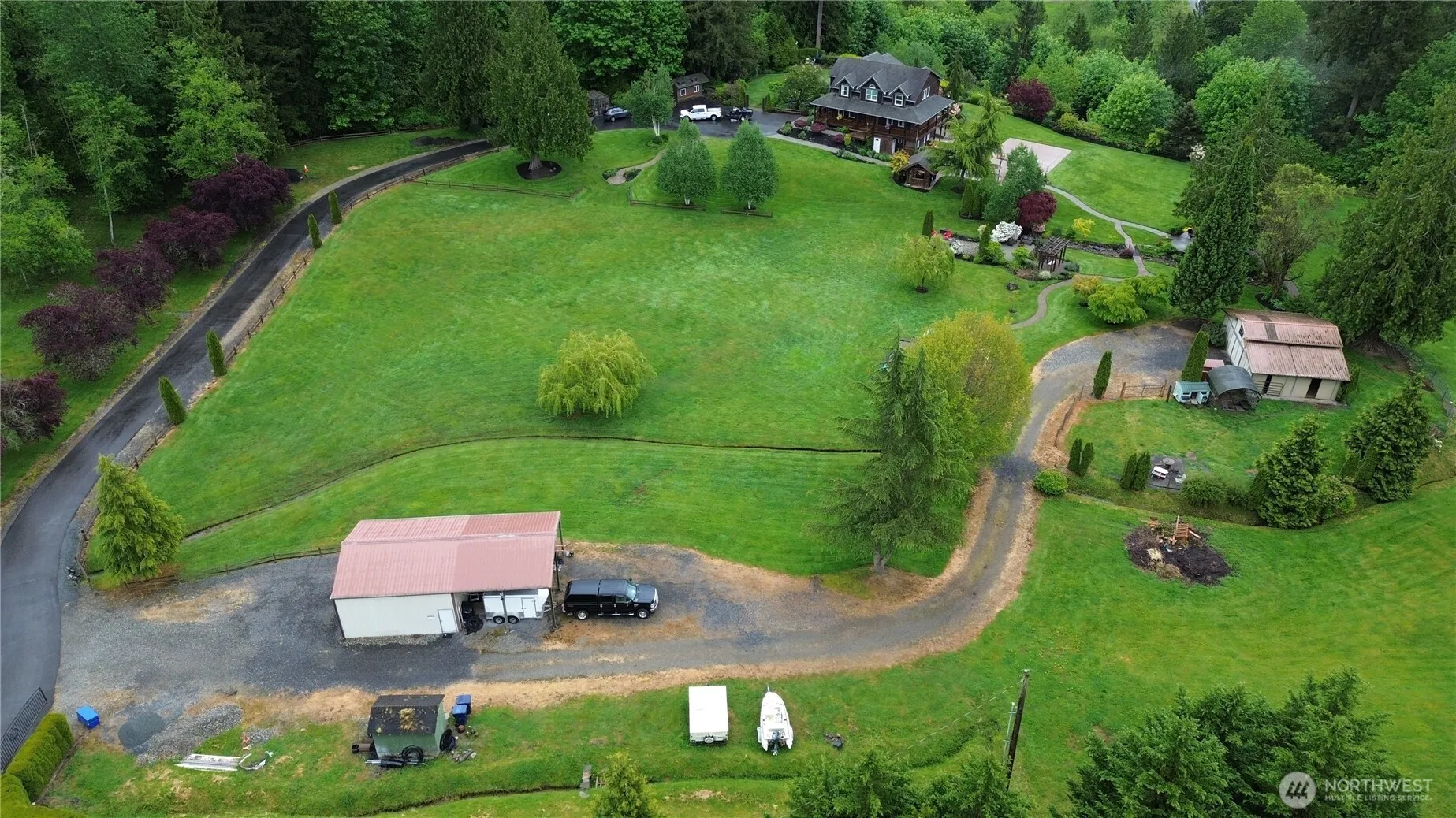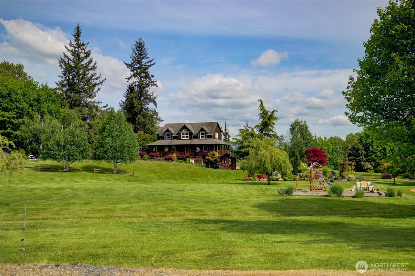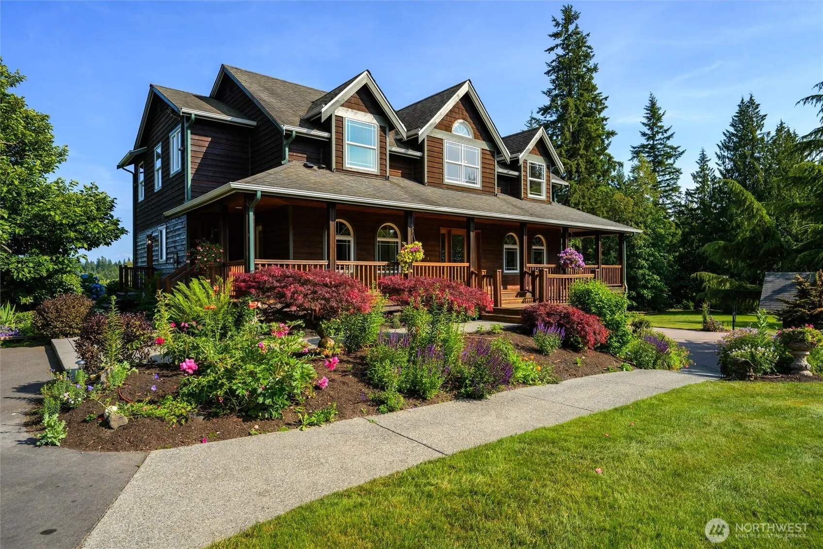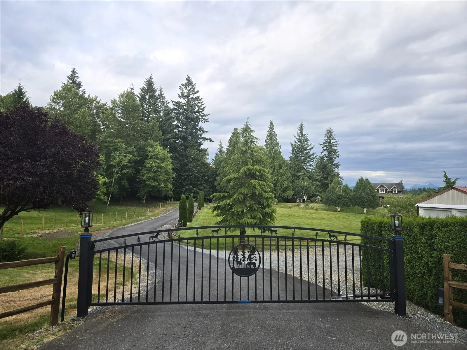 Gated estate, shy 10 acres just minutes to I-5 with sweeping views of the Cascade Mountains from your custom home with all the extras: 48×24 shop, 3 stall barn w/corral, lower-level living space with separate entry or extra family room. Sport court with outdoor bar, poured patios, hot tub and multiple water features. Set up for entertaining large groups (prior wedding venue). Large master suite with private deck and 5-piece bath. Open concept main floor with optional one level living if needed. Updated kitchen w/ walk-in pantry, granite and new appliances. Refinished hardwoods, new carpet and interior paint, move-in ready. 400 amp service, 180ft. well pumps 20 gallons per minute. First time on the market. Second build site. Quality build.