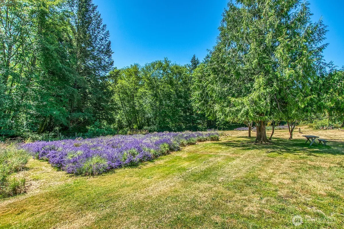 Lavender Farm on five bucolic acres in Olga with turn-key 7 bedroom, 7 bath, farm house. Stroll the five-plus acres of pastures, forest and ponds and harvest the bounty from the mature fruit trees & lavender fields. This classic home has southern exposure from a sunny porch and wrap around decks on two levels. Recently updated with interior and exterior paint, refinished wood floors and other upgrades. Large country kitchen was just remodeled, including new oven/stove. Three bedrooms on the main floor and two suites upstairs in the main house plus additional bedrooms and living spaces on the lower level. Sunny decks, potting shed and forest to explore. Enjoy nearby Obstruction Pass State Park trails and waterfront.