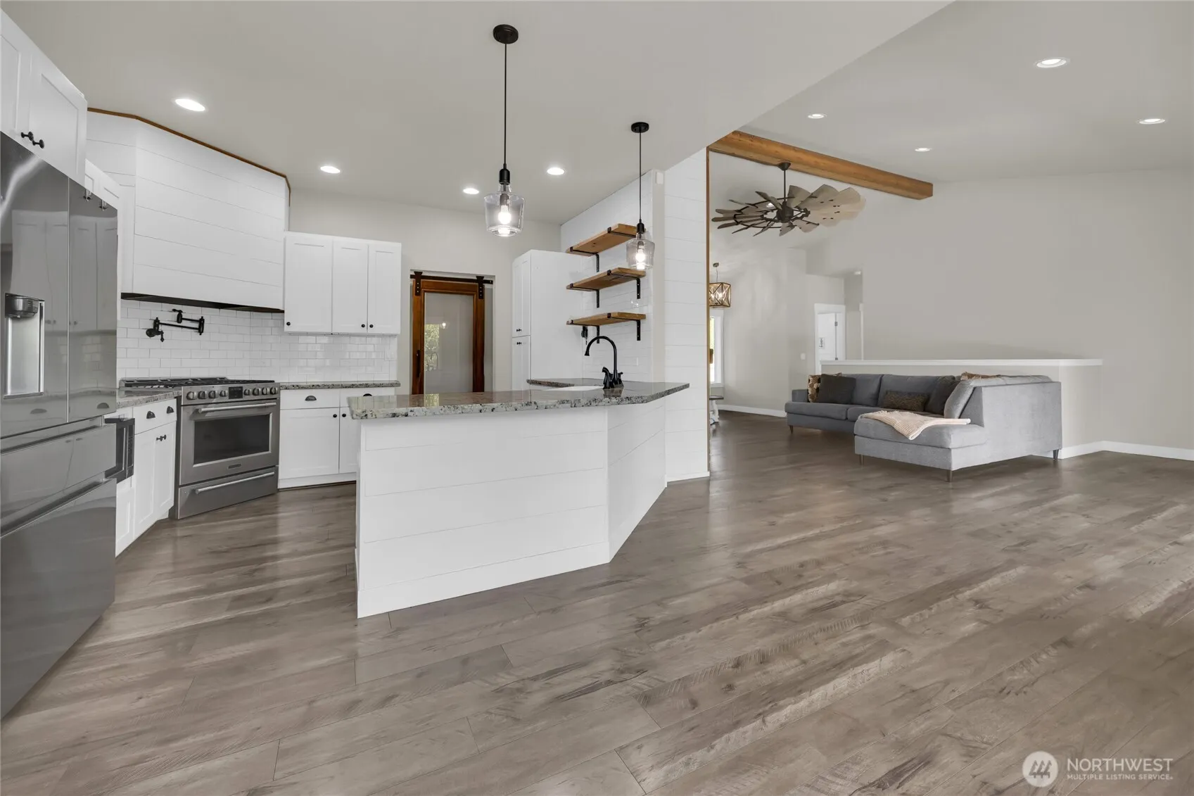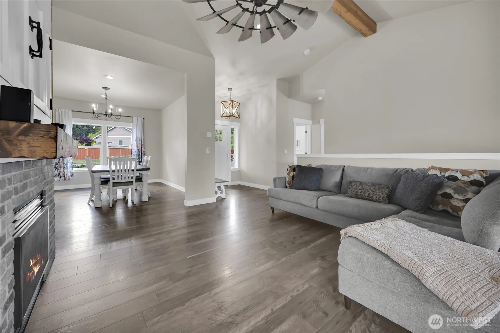 Sprawling Rambler w/ Basement in desirable gated community of Whispering Firs at Firetrail. This home is a must see! Vaulted ceilings, hardwoods & an open concept living room centered around the gas fireplace. Chef’s Kitchen w quartz counters, SS apps, bar for seating + separate dining room for hosting. Primary suite w/ walk-in-closet, HUGE ensuite 5 piece bath w/ double vanity. Three additional bedrooms on main level. Enjoy A/C on those hot days. Large basement w/ small kitchenette + 3/4 bath offering plenty of additional living space. Covered deck for year round enjoyment overlooking your fully fenced lawn w/ fruit trees. Minutes to I-5, the outlet mall, shopping and restaurants.