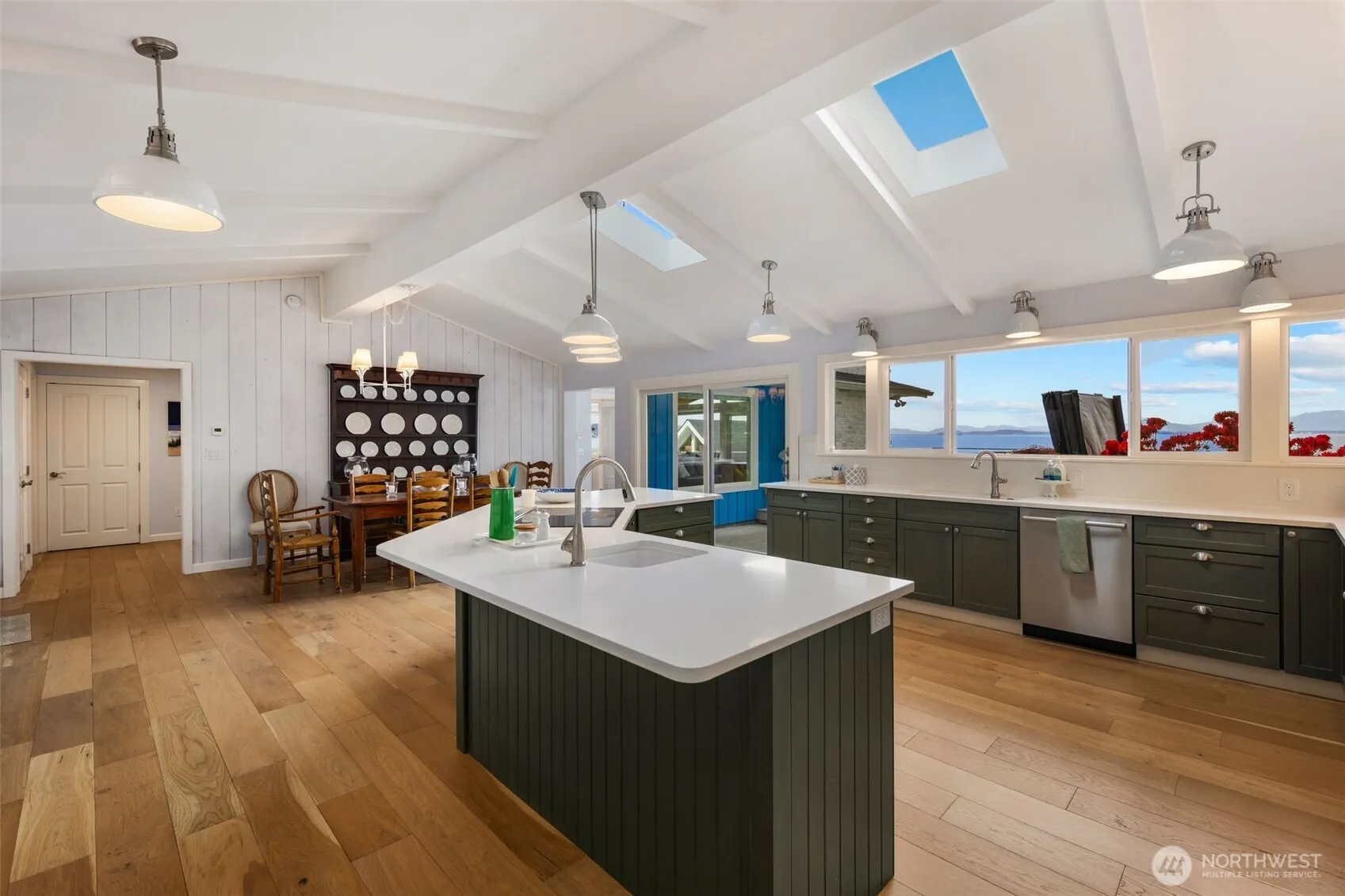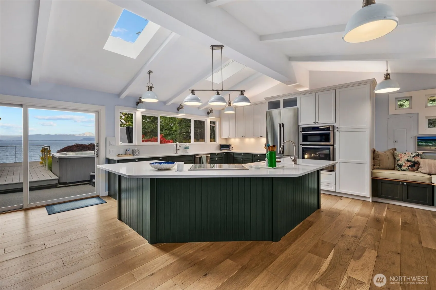 Stunning Waterfront Home on Utsalady Bay’s Coveted Sandy Beaches with Bulkhead & Boathouse Below! This Premier Home has been thoroughly updated inside and out. Giant VIEW kitchen w/ quartz slabs, high-end appliances and cabinets. Open-beam fireside family room. Main-floor primary view suite, office space with high-speed broadband. Lower Theater/Bonus room, + large guest bedrooms/bathrooms. Detached garage + loads guest paved guest parking. Entertaining-sized deck w/ hot tub to soak in the solitude + views. Landscaped and fenced yard leads down to your concrete bulkhead/shoreline deck w/ boat davit, mooring buoy & storage shed. Unique covered boat parking, ready for crabbing, paddling, and beachcombing. Your Patience Paid-Off…Welcome Home!