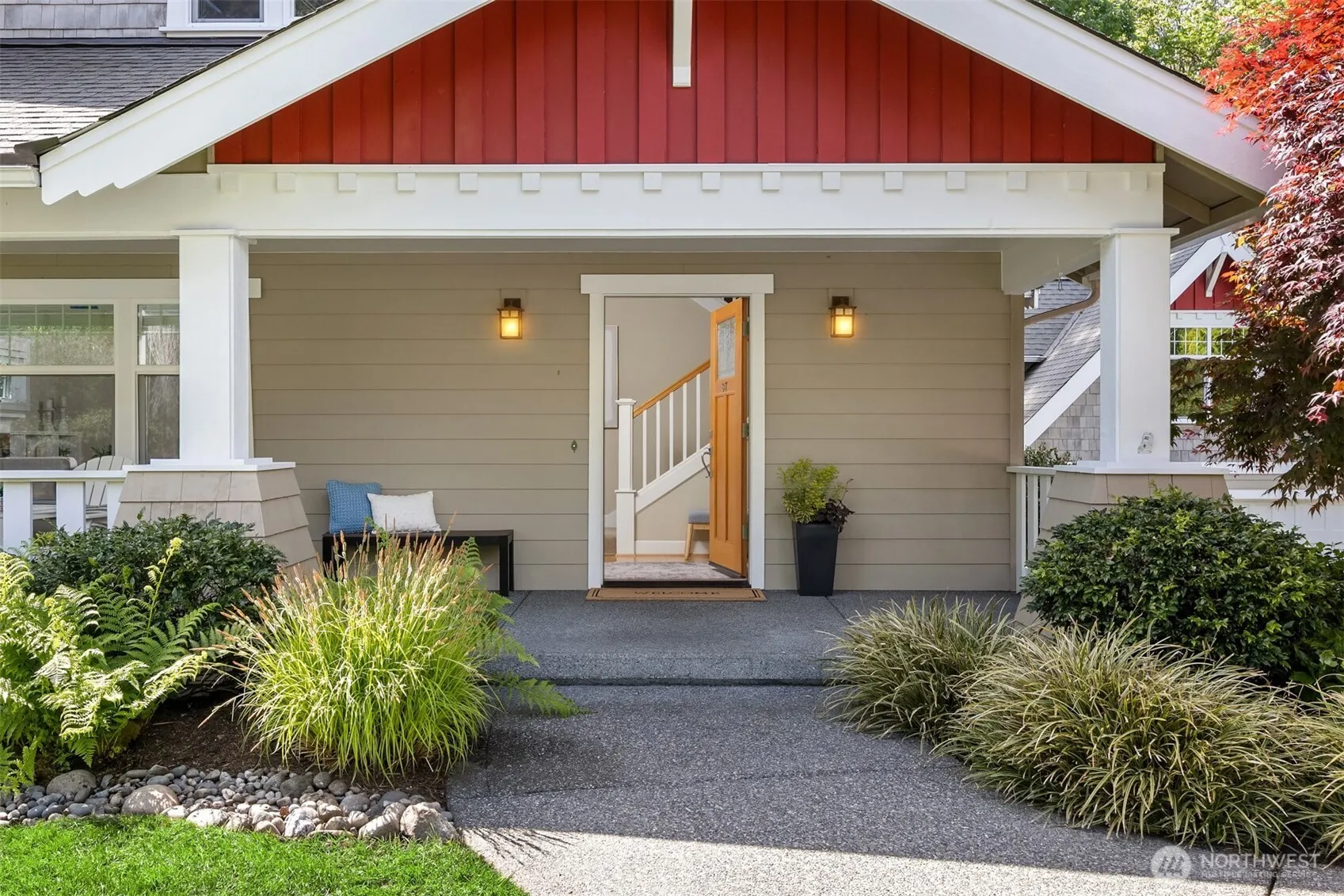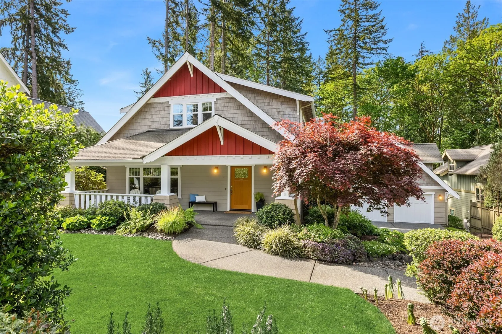 Classic Bainbridge charm meets in-town convenience in this beautifully maintained Craftsman, tucked on a quiet cul-de-sac just minutes from top-rated schools, Rotary Park, the ferry, and all the amenities of downtown. Thoughtful design, rich millwork, and timeless style define the home, with a spacious main-floor primary suite offering comfort and accessibility. Upstairs features three additional bedrooms, a full bath, and a generous landing perfect for movie nights, play, or creative pursuits. The detached two-car garage offers potential for an upper-level guest suite, office, or studio. Surrounded by gorgeous, architecturally designed landscaping, this immaculate home is move-in ready – refined Island living in an unbeatable location.