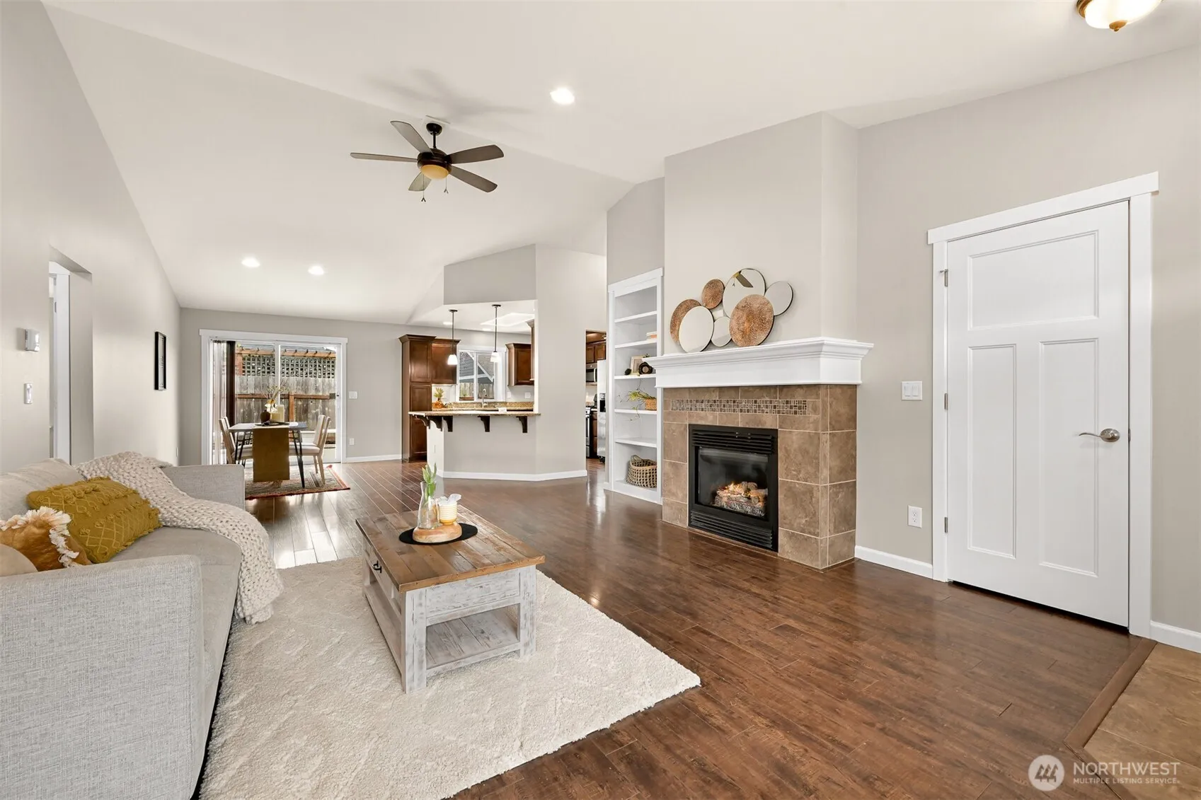 Beautiful single-level Craftsman tucked at the end of a quiet cul-de-sac on the best lot in the neighborhood. Large front porch welcomes you into a spacious open-concept layout w/vaulted ceilings, cozy gas fireplace, & custom built-in shelving. Kitchen features granite counters, SS appliances & an eat-up breakfast bar, ideal for casual dining and gatherings. Private primary thoughtfully separated from the other two bedrooms w/ its own en-suite. Enjoy outdoor living w/ an incredible, fully fenced yard with a custom walkway and fire pit—perfect for entertaining. Enjoy peaceful evenings outdoors in your private oasis. In-floor radiant heat throughout adds year-round comfort. Built in 2013, this home blends modern amenities with timeless charm.