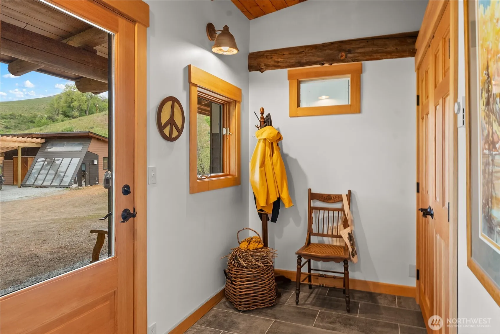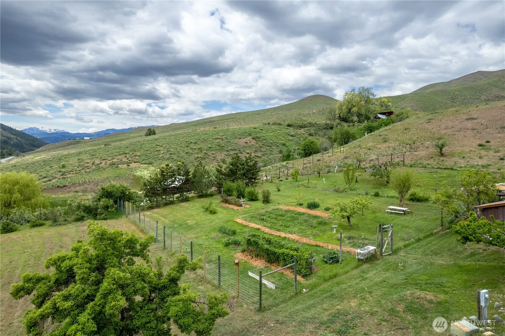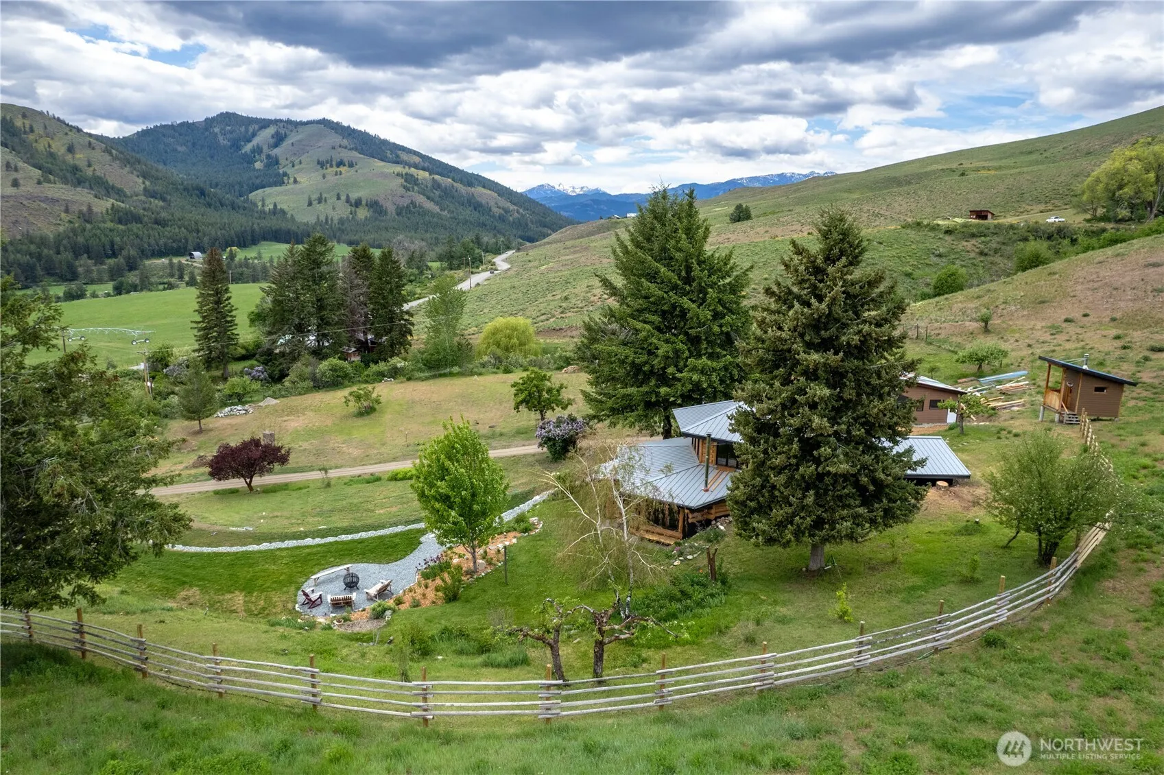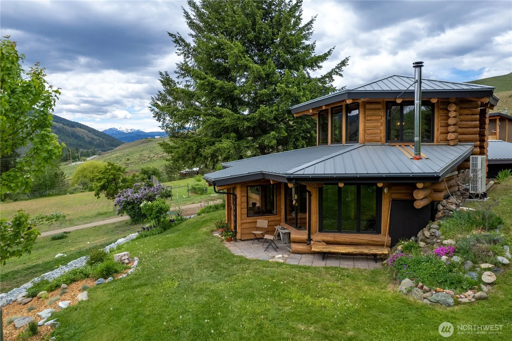 Stunning mountain views and desirable Twisp River Rd location 3.5 miles from Twisp. Charming 2 bedroom, 1 full bath, log home updated for modern living in 2024. Updates include new roof, mini split heat pump, hickory floors, appliances, and complete log renovation with new chinking inside and out. The property has 8+ acres of prime garden and grazing land set on a south-facing slope, landscaped with rock walls and patios, berries and flowers, mature fruit trees and adjacent public land for easy hiking. 2 car garage, green house, sauna, great storage/shop complex, PLUS adorable 1/1 guest cabin. Private well, shared well and irrigation ditch rights keep this property green and firewise.
