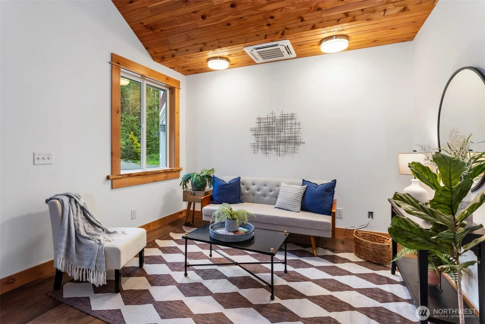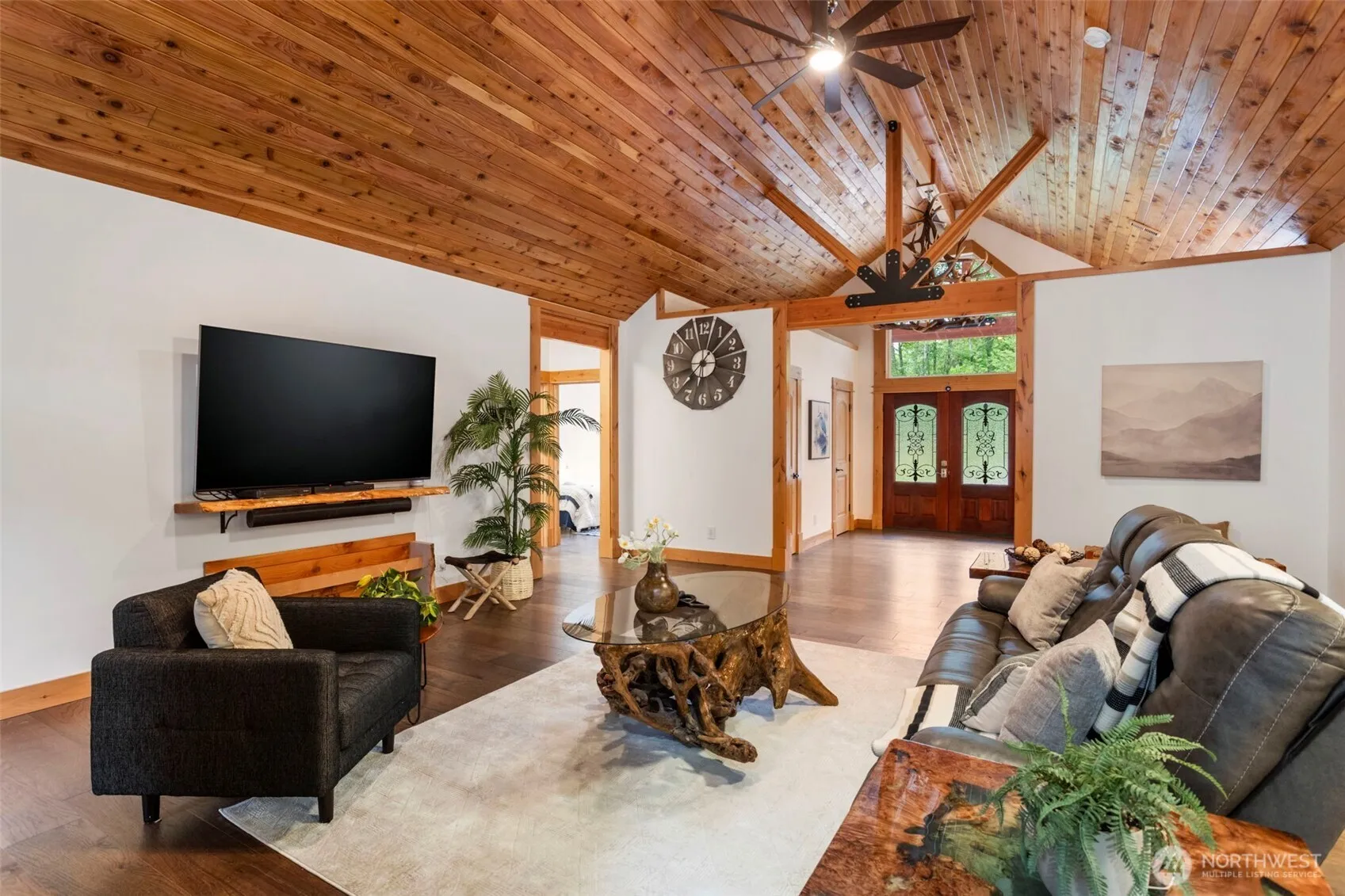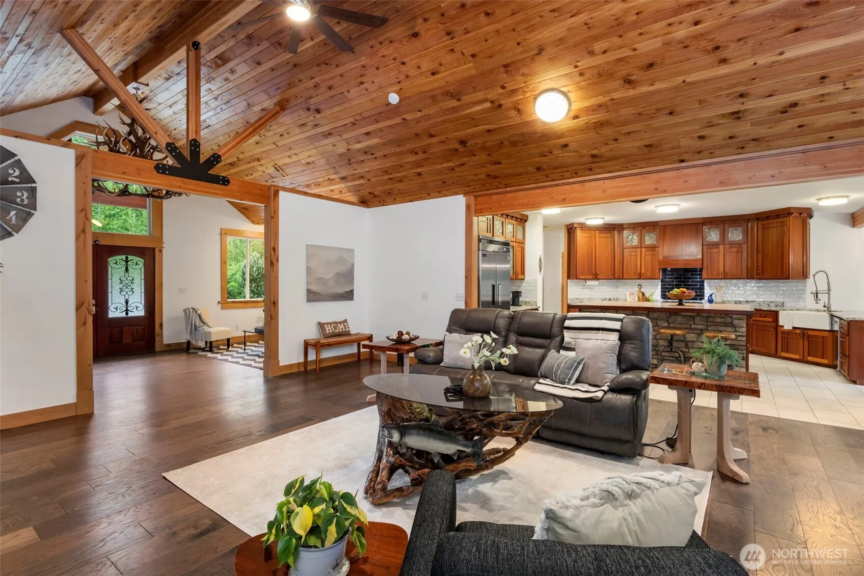 Experience refined Northwest living in this stunning 3,643 sqft rambler, privately sited on 5 peaceful acres. Enter through double doors into a grand room with soaring 14′ cedar tongue & groove ceilings, maple hardwood floors & a cozy propane fireplace. The kitchen is a showstopper—leathered granite countertops, a massive island, gas range & custom Sapele Mahogany cabinetry with locally crafted glass inserts. Solid alder doors, live-edge window sills & artful finishes add warmth throughout. The spacious primary suite includes a sauna for ultimate relaxation. Additional room/bath above garage—2nd primary, extended living, Media room? Solar panels offer energy efficiency. Just minutes to Kingston ferries, beaches, restaurants & more!
