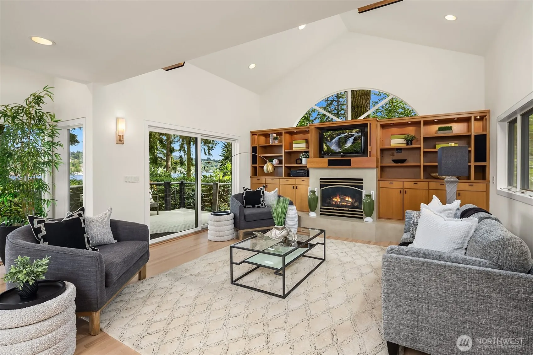 You can have it all…commanding lake views & the coveted lifestyle of lakeside living. Park your boat & relax on 40 ft of shared no-bank beachfront. Watch the sunrise & eagles soar from this striking architectural masterpiece w/ park-like grounds & an 8-car auto court. Dramatic Great Room Concept w/walls of windows showcasing sweeping 180-degree views. At center stage, a brand-new kitchen where everyone wants to gather. Stylish loft den with an outlook that inspires. Serene main floor primary w/ spa style wet room. Playful “walk out” lower level features a heatilator style gas frplc. The investment has already been made here! Everything is fresh & new even the roof! Be in by summer, park your boat and start living the resort style dream!