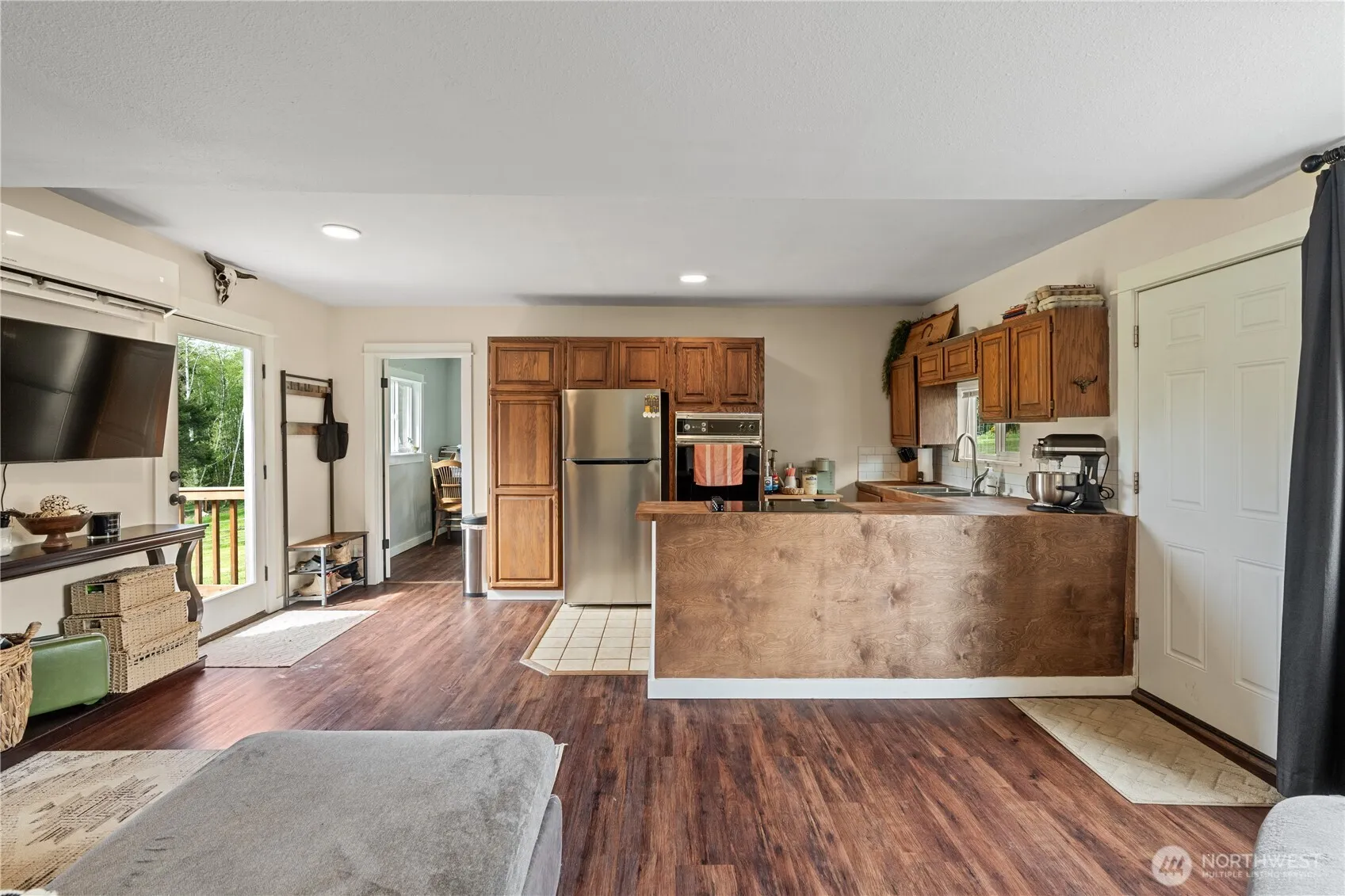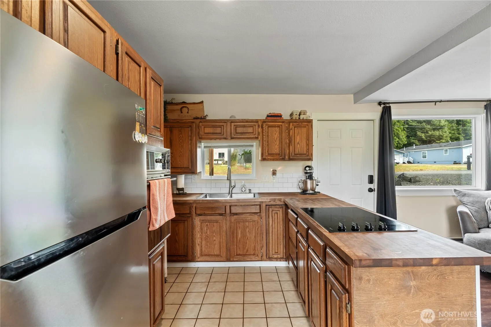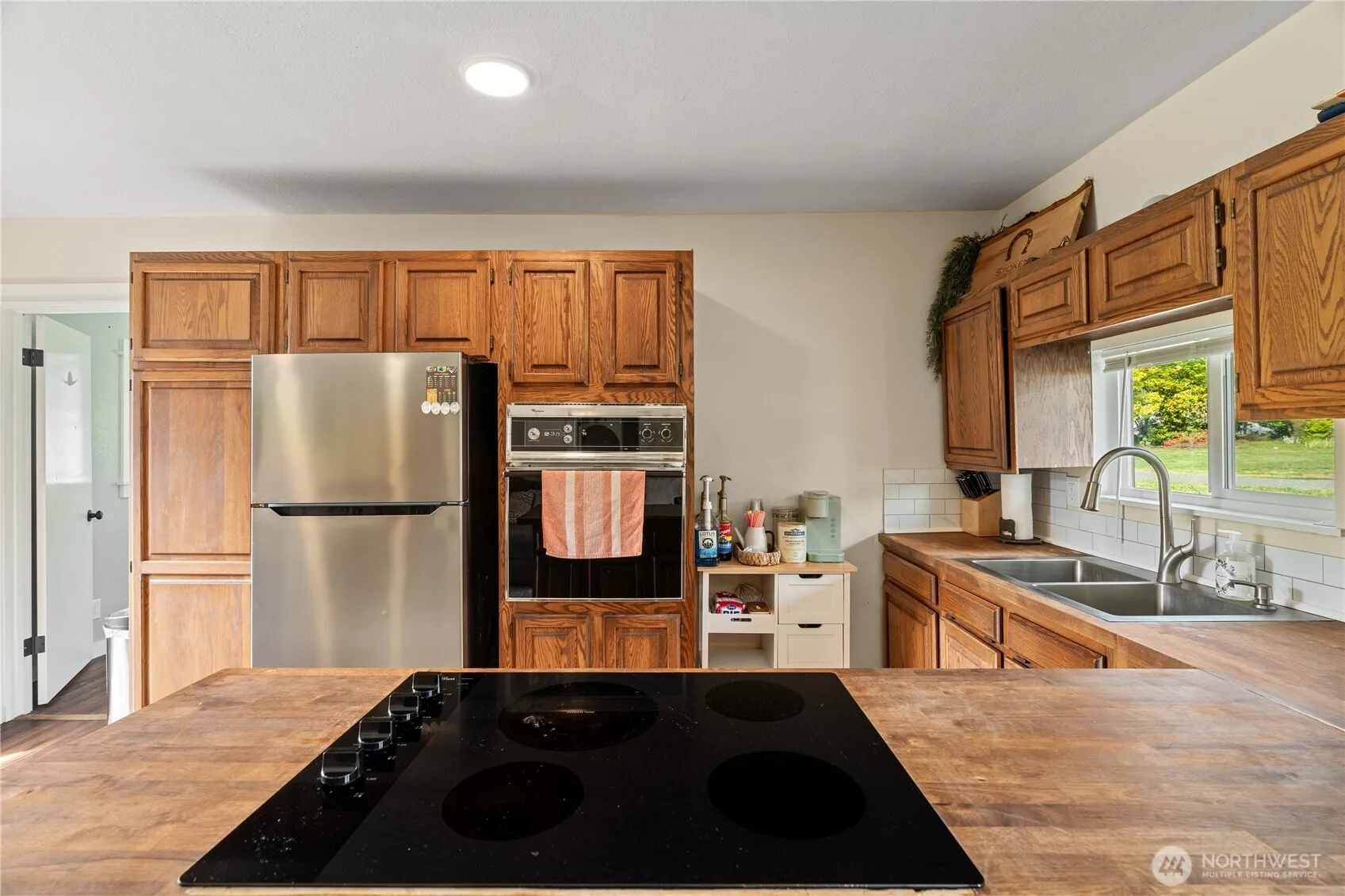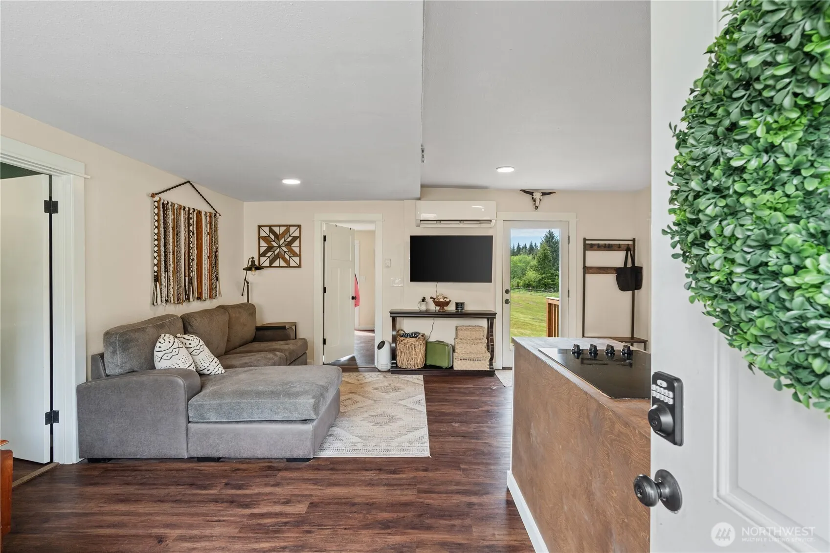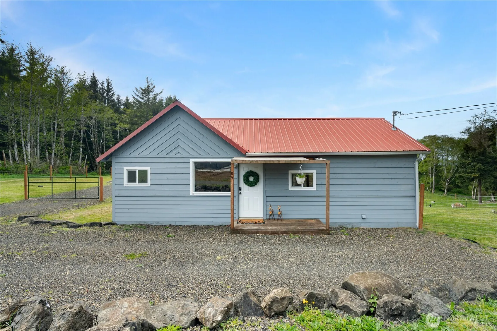 This inviting cabin-style home features a 2-bedroom, 1-bath layout sitting on just over 2 acres of fully fenced equestrian property w/ peekaboo bay views. Interior highlights include laminate flooring throughout, butcher block countertops, ductless mini-split system, fully remodeled bathroom w/ ceramic tiled bathtub, granite countertop vanity, and a spacious back deck—perfect for entertaining or simply enjoying the outdoors. Ideal for equestrian use, hobby farming, or wide-open space to roam, the property features an on-site water system and multiple outbuildings including a versatile 2-bay detached garage w/ wood burning fireplace —perfect for vehicles, tools, or workshop space.