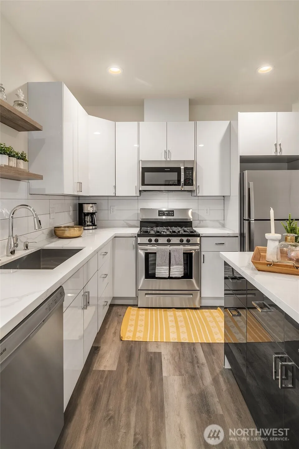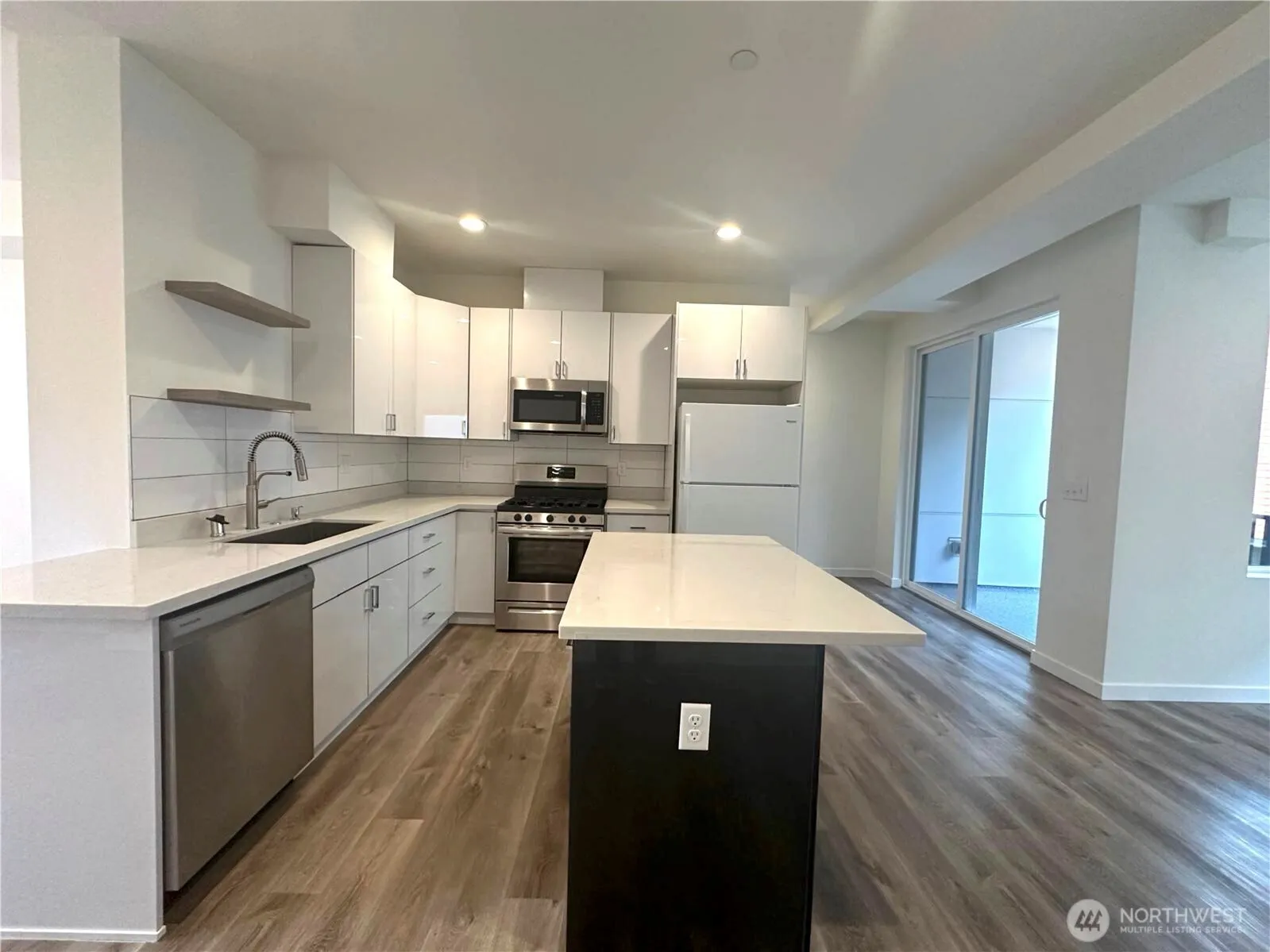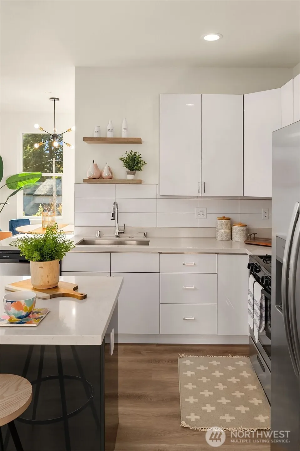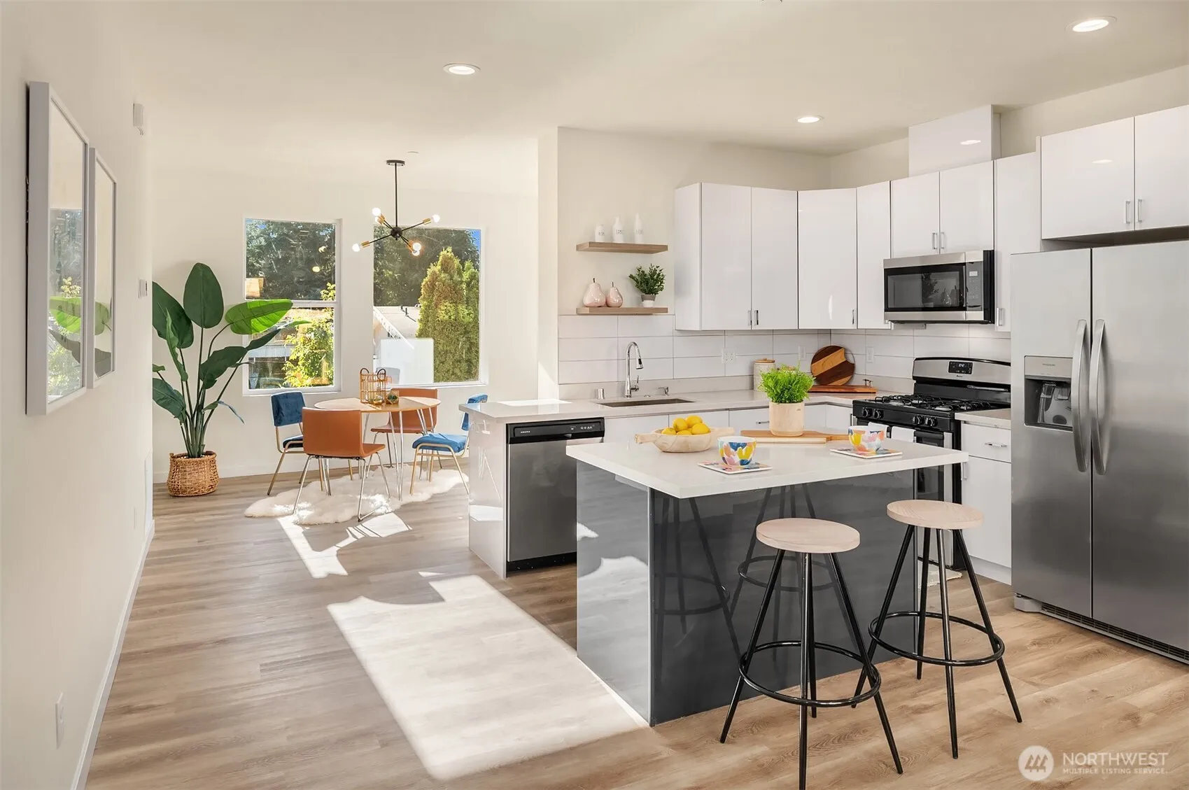 Exceptional open floor plan filled with natural light from large windows, soaring 9’ ceilings, and stylish LVP floors. Chef’s kitchen boasts quartz countertops, full-height backsplash, soft-close cabinets, stainless steel appliances, and a center island with built-in trash cabinet. Relax in the primary suite with private bath or entertain year-round on the covered balcony. Enjoy community amenities: playground, picnic tables, basketball court, BBQ, and guest parking. Quick access to freeways, SeaTac Airport, schools, Burien, Southcenter Mall, Seattle, and Bellevue.