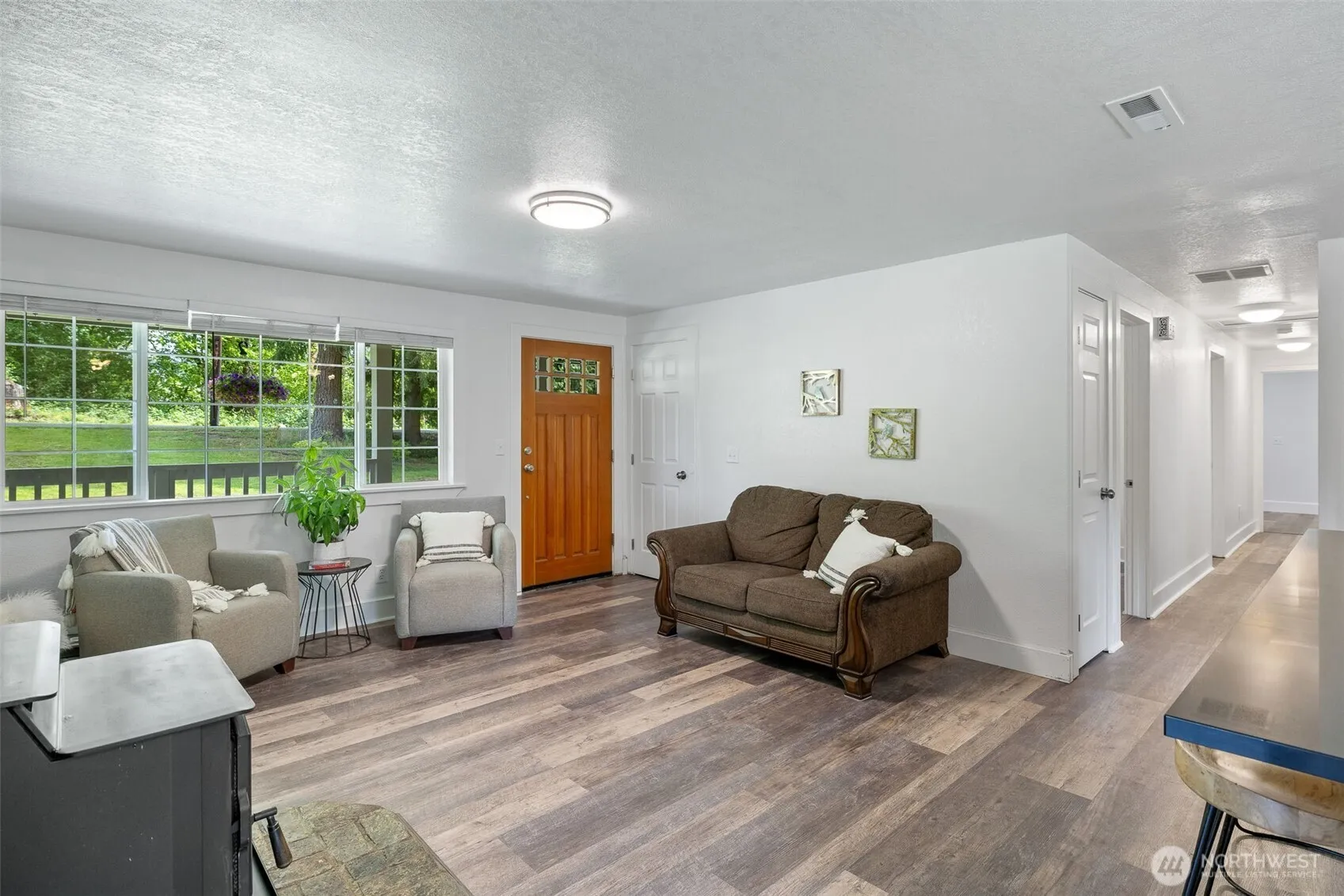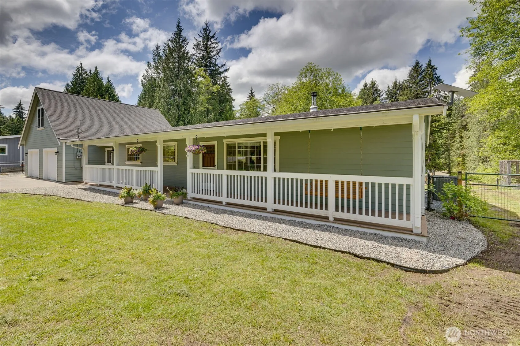 Delightful 3bed, 2.5bath + Large 2nd Floor Bonus on 1.25 Acres. Remodeled kitchen features Denver cabinets w/pullouts, island w/quartz counters & seating, new appliances & generous workspace. Updated bathrooms including large vaulted primary ensuite w/tile floor, dual-sink vanity, glass walk-in shower & luxurious jetted tub. New vinyl flooring throughout, new carpet in versatile bonus/4th bedroom & new interior paint. Recently installed central air furnace w/efficient heat pump, A/C + on-demand Generac generator. Huge 2 car garage w/rear garage door + ample room for shop area. Additional covered parking out back for RV/toys. Fun property w/open grass area, cozy gazebo on concrete pad, utility shed, chicken coop and creek in the far back!