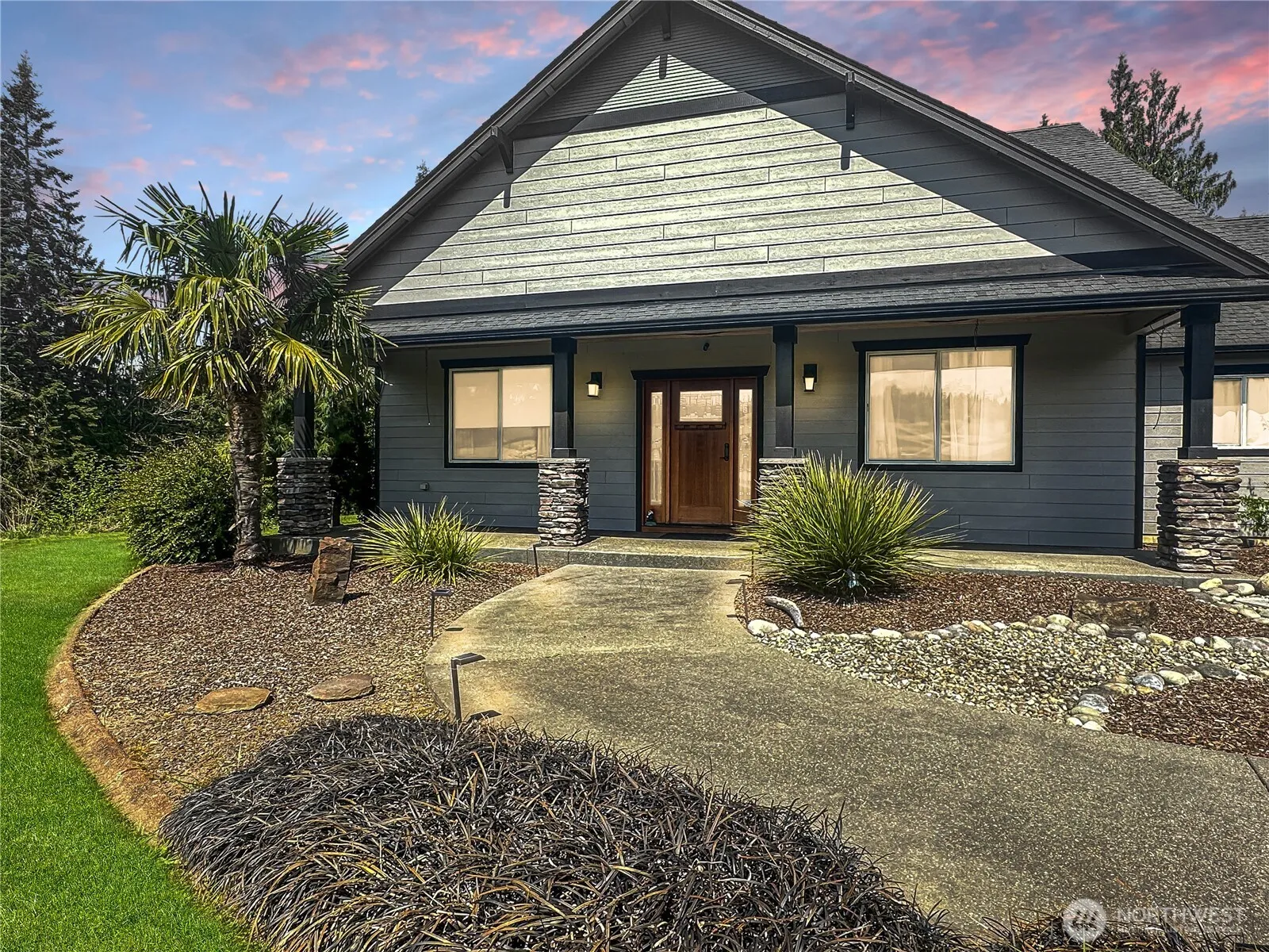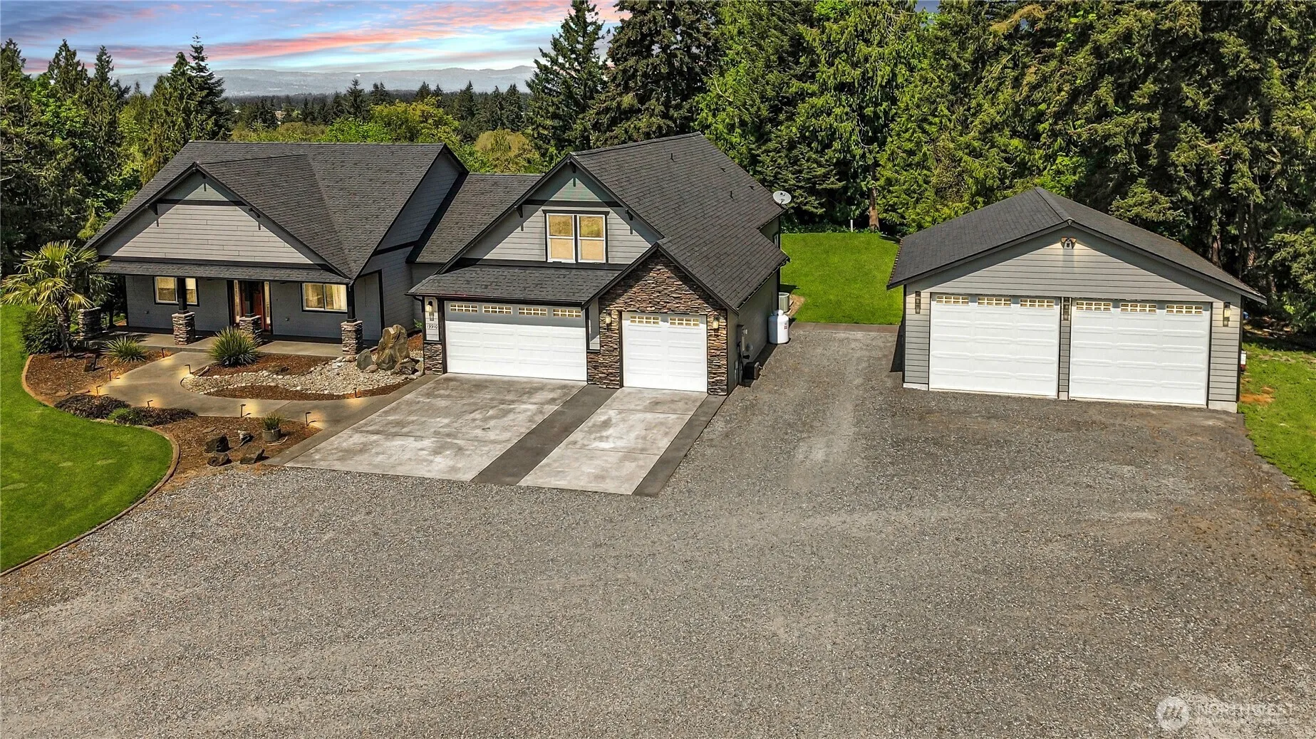 Dream country retreat just minutes from I-5! Nestled on a private 5-acre estate, this high-end home offers 2,825 sq ft of cozy yet luxurious living space. Features 3 bedrooms, a large office, and 2.5 bathrooms. Most of the living space is on the main level, ideal for entertaining, vaulted ceilings, indoor/outdoor fireplace, and French doors leading to a peaceful patio. The chef’s kitchen includes high-end finishes, a double oven, and a walk-in pantry. The primary suite is a true sanctuary with a double-head shower, jetted tub, sauna, and elegant details throughout. Upstairs media room. Attached 3-car garage + 900 sqft detached. RV parking w/ power, and dual heat pump to stay cool. Sprinkler system & private well. 1-year home warranty incl.