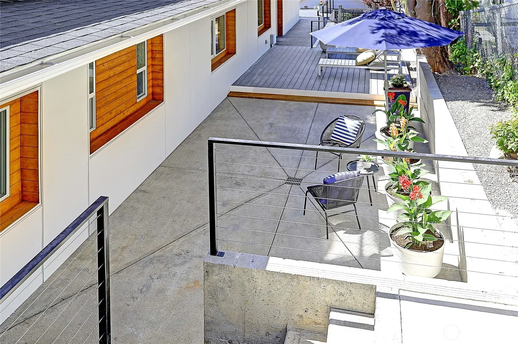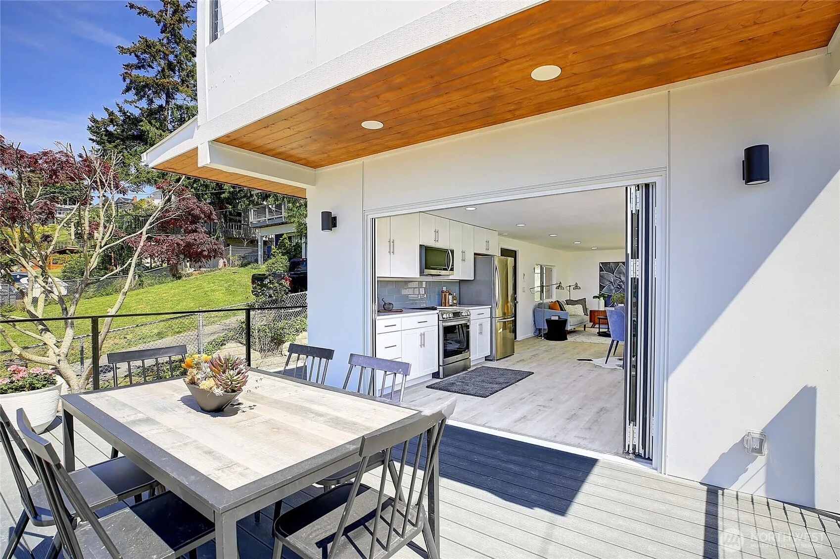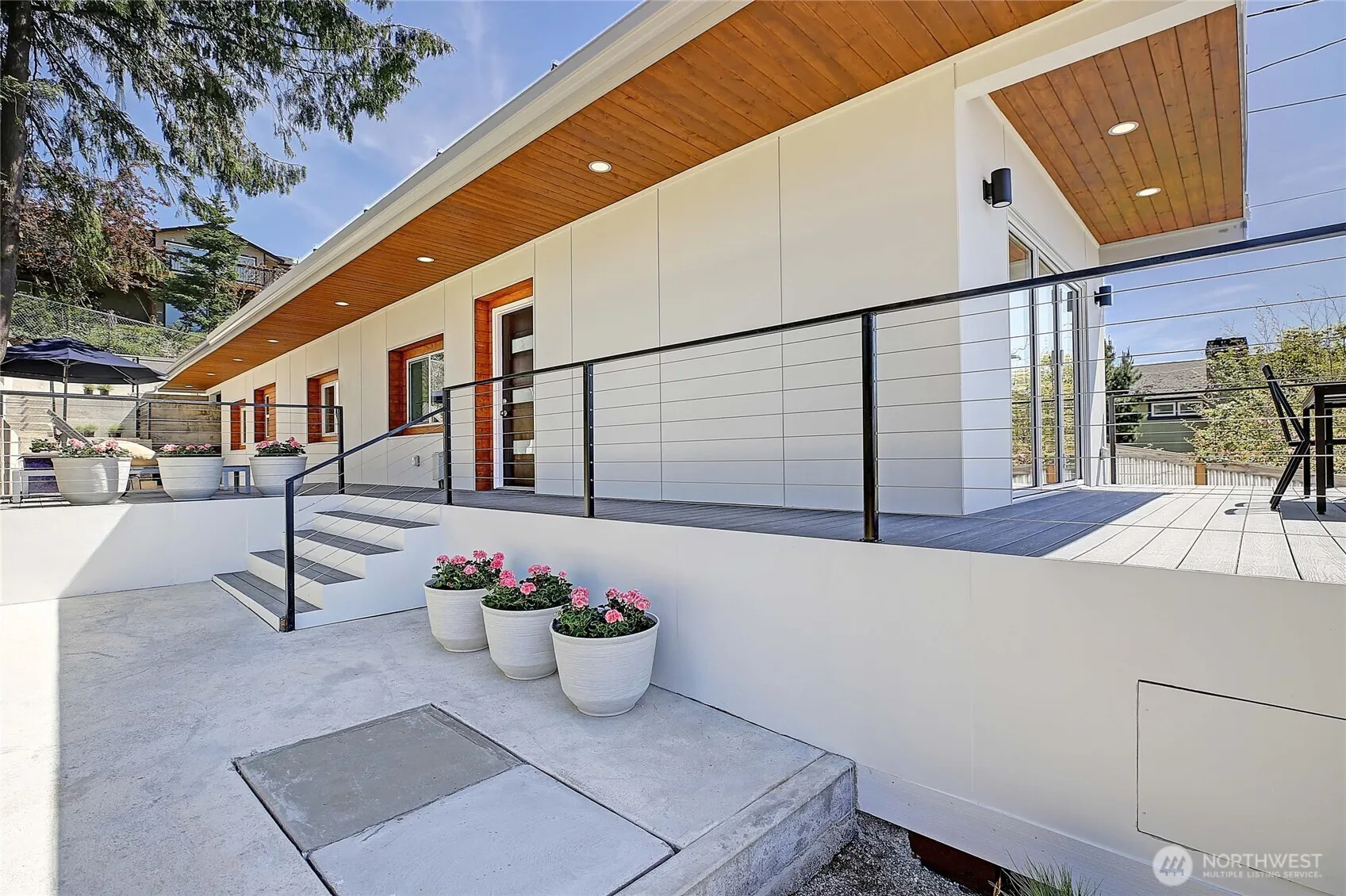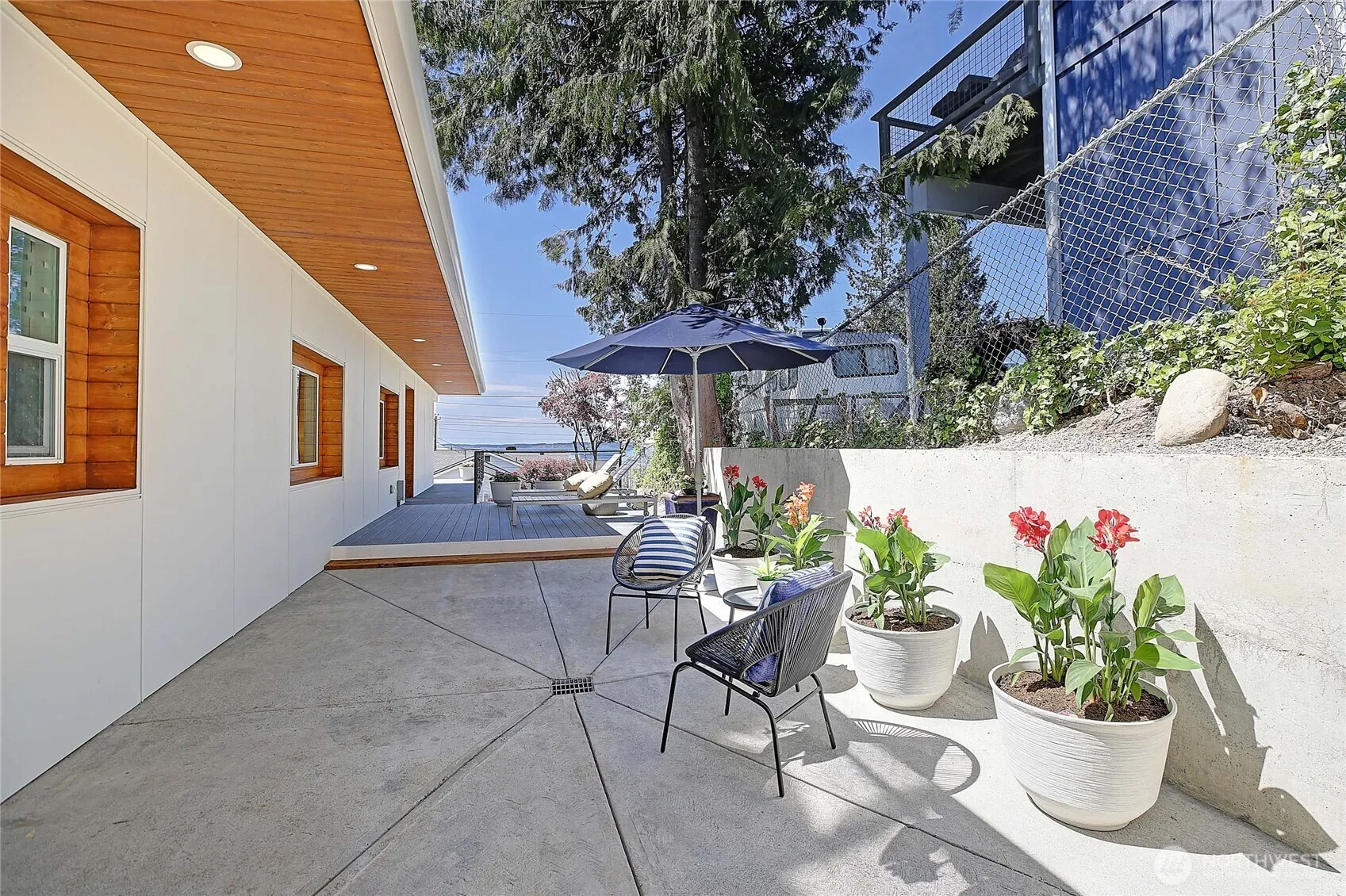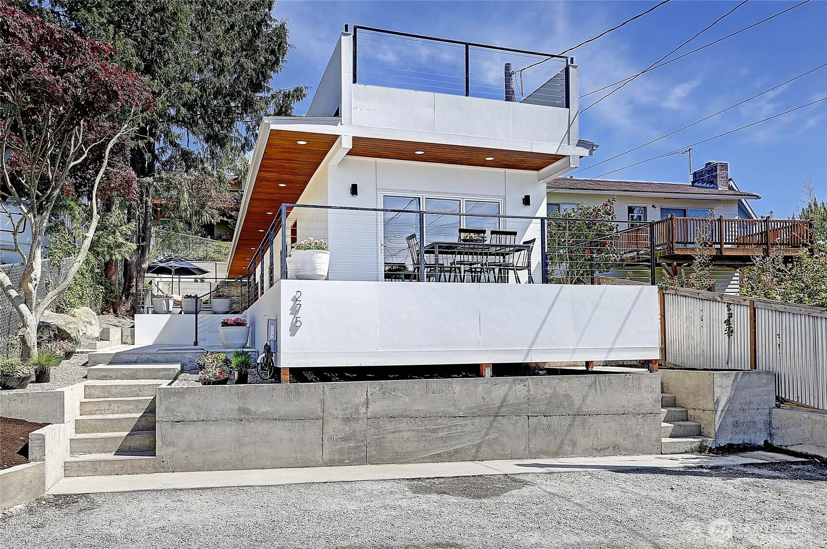 Modern Camano beach house with endless water views in the coveted Madrona Beach neighborhood — a once-in-a-generation find at this price! The home is crowned with a 1,000 sq ft rooftop deck for soaking up island life. Lot is fully hardscaped from corner to corner for easy, low-maintenance living. A dramatic floor-to-ceiling glass doorway across the front of the home blurs the line between indoors and out, flooding the space with natural light. The sleek galley kitchen features quartz countertops, & the home is appointed with state-of-the-art appliances. The open-concept layout is ideal for entertaining. Newly refreshed, includes air conditioning and an EV charger! Just a block from the community beach—perfect for crabbing and beachcombing.