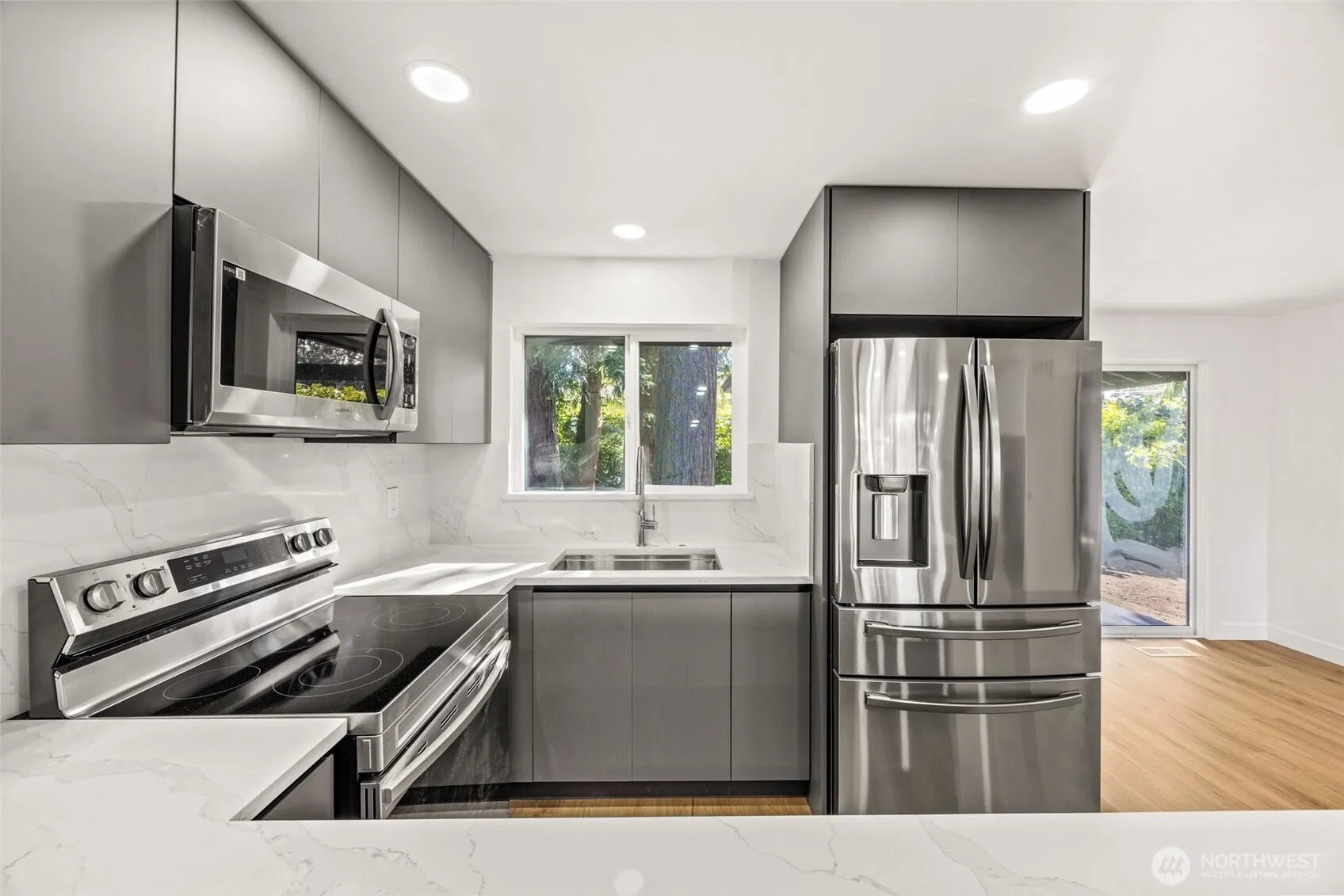 Beautifully remodeled home in Mountlake Terrace, situated on a spacious and quiet corner lot! Thoughtfully designed with a brand-new roof, a stylish modern kitchen featuring quartz countertops & SS appliances, updated bathroom & new flooring. Fresh interior & exterior paint, new fixtures, doors & trim. Conveniently located near the freeway, schools, parks and downtown MLT. Fully permitted. Zoned business commercial.