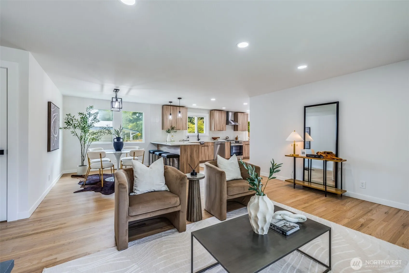 Remodeled 5-bed, 3-bath home with ADU/MIL potential. Main level features open-concept living, refinished hardwoods, quartz counters, stainless appliances, and a spacious island. Primary suite includes private ¾ bath. Lower level has separate entrance, two bedrooms, full bath, living area, and wet bar—ideal for extended living, rental income, or Airbnb use. Flexible layout works well for house hacking, multi-gen living, or guest quarters. Located on a quiet dead-end street near parks, schools, transit, and the Des Moines Marina. Fresh paint and modern updates throughout. Move-in ready with strong income potential.