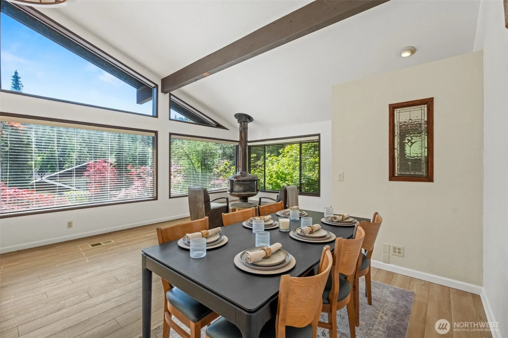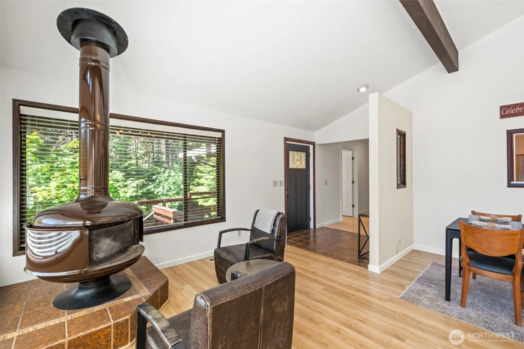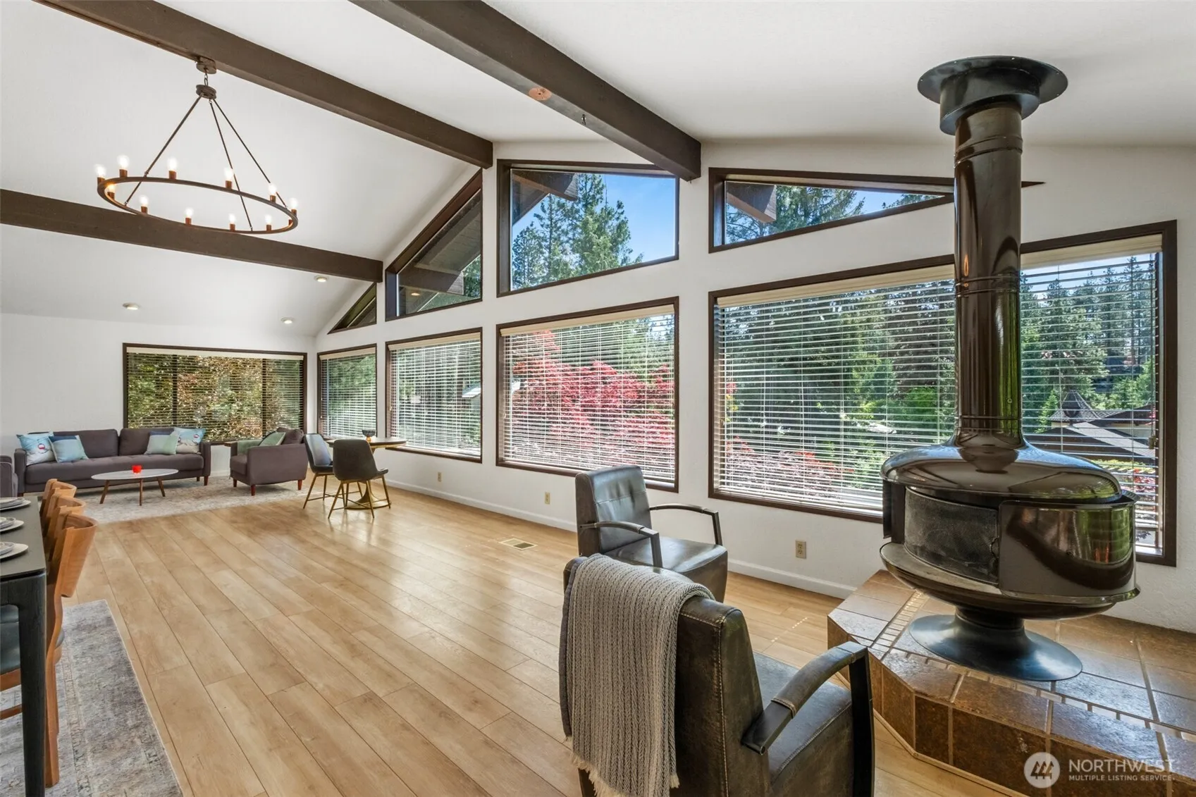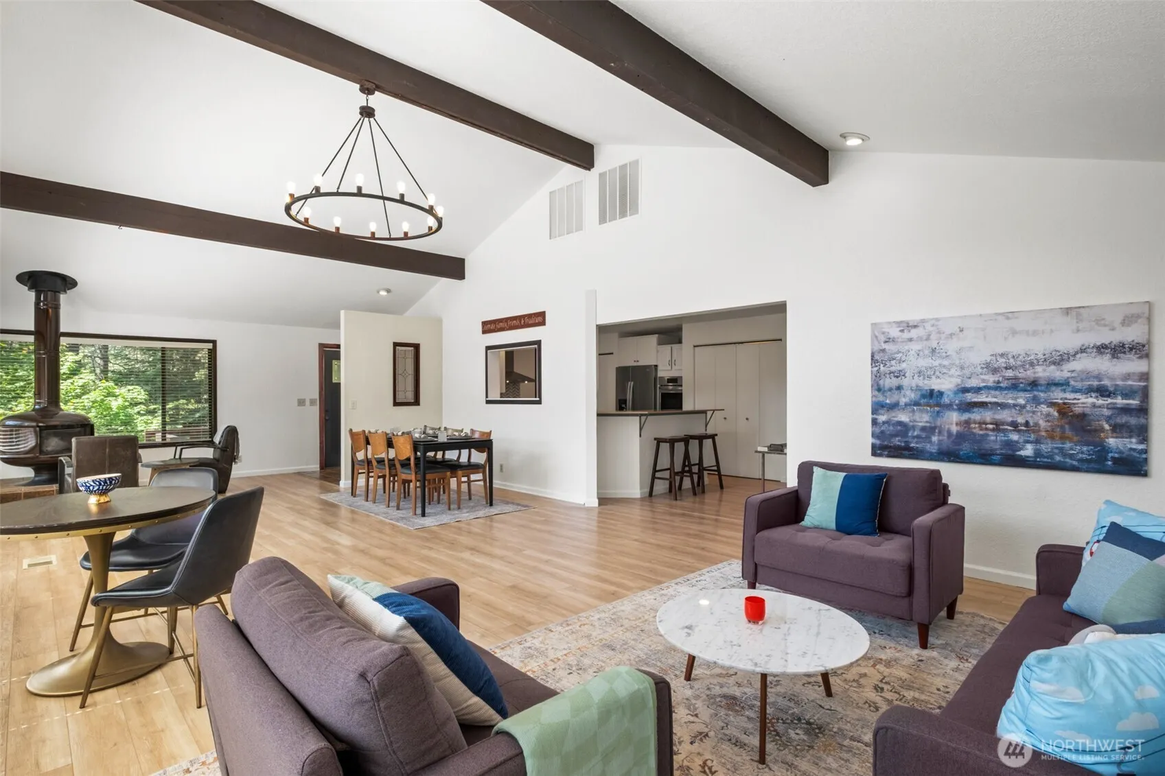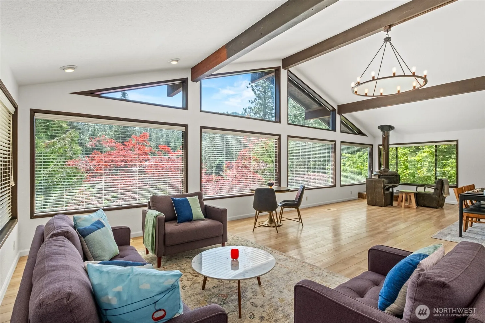 Experience modern luxury in this remastered 3-bed, 2-bath Leavenworth home. Steps from downtown, it offers an open-concept living space with vaulted ceilings and abundant natural light from expansive windows. Each bedroom accesses cedar decks, perfect for relaxation. An oversized 2-car garage with extra storage and a versatile bonus room (office/gym) adds convenience. Nestled on a private, wooded lot on a no-through access street with mature landscaping. Enjoy community river access just steps away. Walk to shops, restaurants, and schools. A rare opportunity for ultimate relaxation and effortless entertaining.