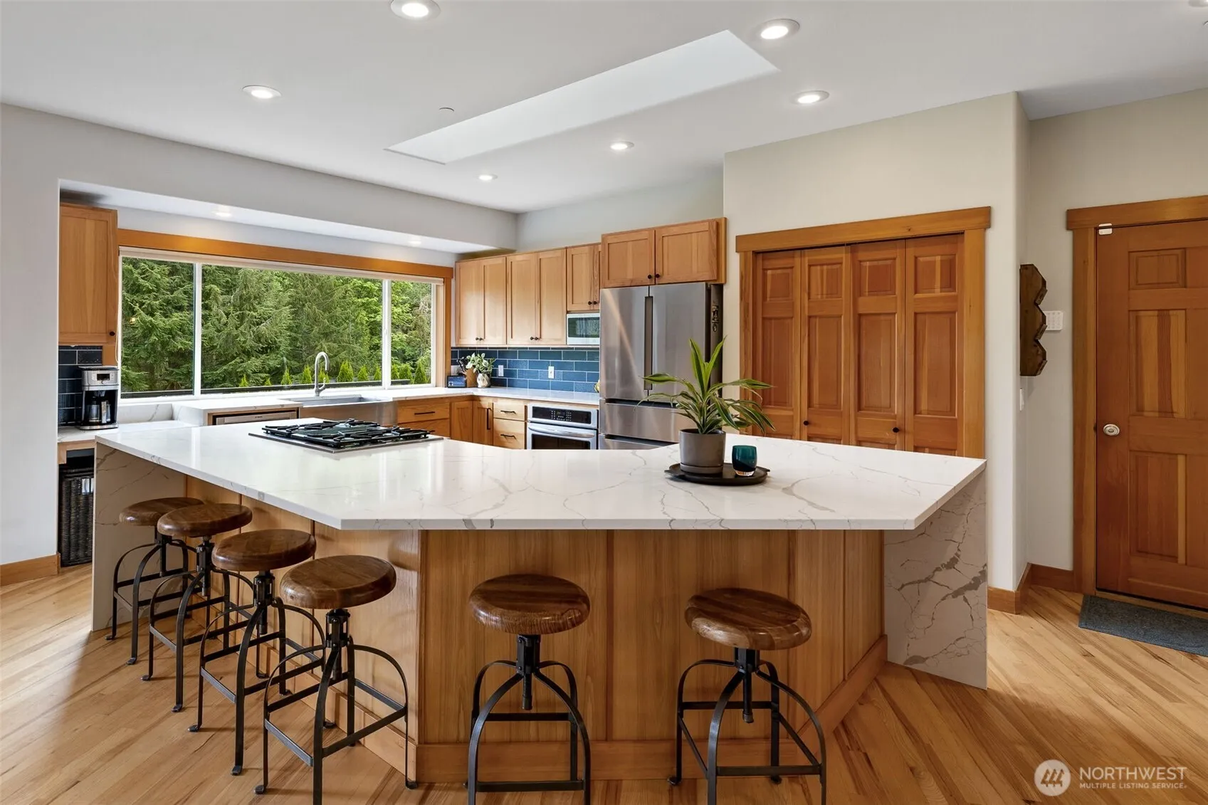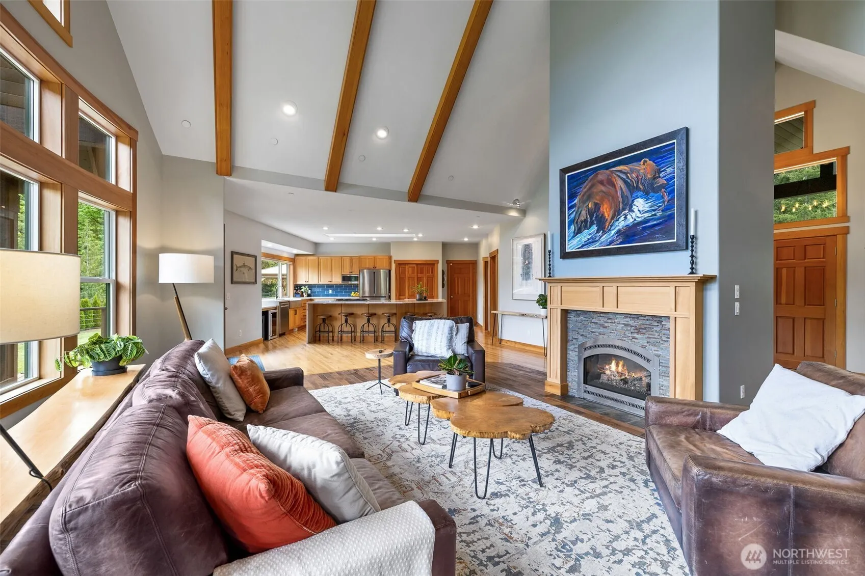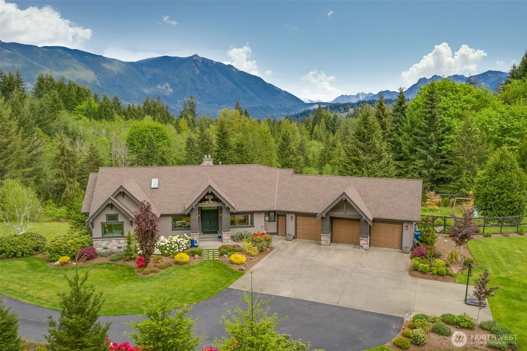Experience luxury living with unmatched views in the coveted Snoqualmie Uplands community. This stunning 3,600 sqft residence offers 4 beds/4.5 baths, perfectly blending modern elegance with rustic charm. Enjoy views of Mt. Si and Mount Tenerife from nearly every room, on a tranquil private lot where elk often roam through your backyard, with HOA approved batting cage plans. Inside, the gourmet kitchen features striking waterfall quartz countertops, premium finishes, and open-concept living ideal for entertaining. Downstairs, two private bedroom suites flank a spacious game room and wet bar—ideal for guests or multi-gen living. Just minutes from downtown North Bend, this one-of-a-kind retreat offers both peaceful seclusion and convenience.
