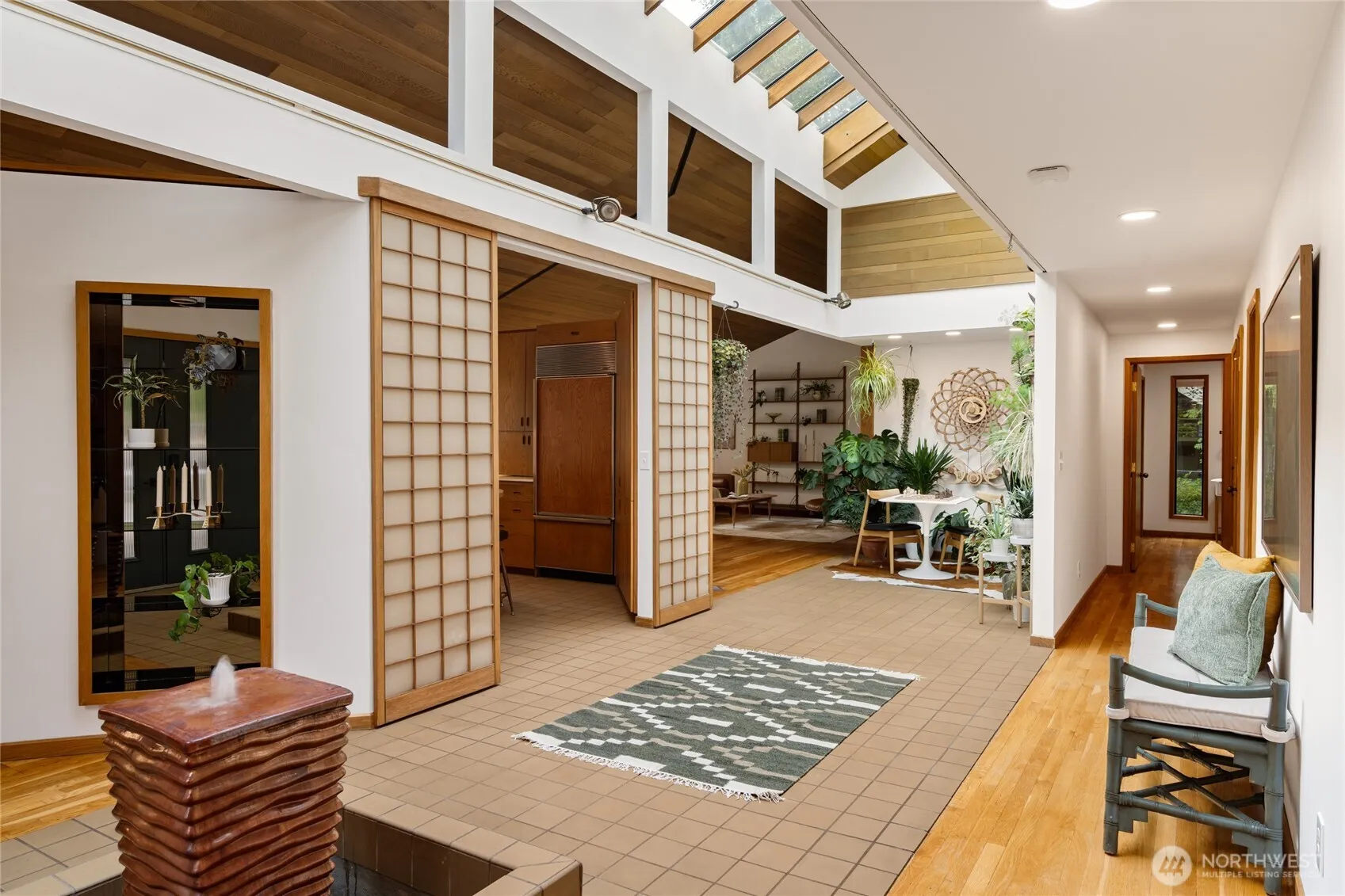 Truly one of a kind! Step into the dramatic skylight atrium & experience a home that perfectly blends iconic mid-century design w/ modern upgrades. Thoughtfully rebuilt, the owners refinished original cabinets & hardwood floors, preserved vaulted wood ceilings, and chose new fixtures to complement the MCM style—like black floor-to-ceiling windows & a chic Malm fireplace. Major system updates include electric, plumbing, furnace, foundation, windows, new exterior paint, EV charging & a long-life metal roof. Fantastic layout w/ 4 beds, 4 baths, family room, flex spaces & tons of storage. Set on nearly half an acre surrounded by trees, this exceptionally private sanctuary features sitting areas, garden beds, a greenhouse, lawn & huge Trex deck.