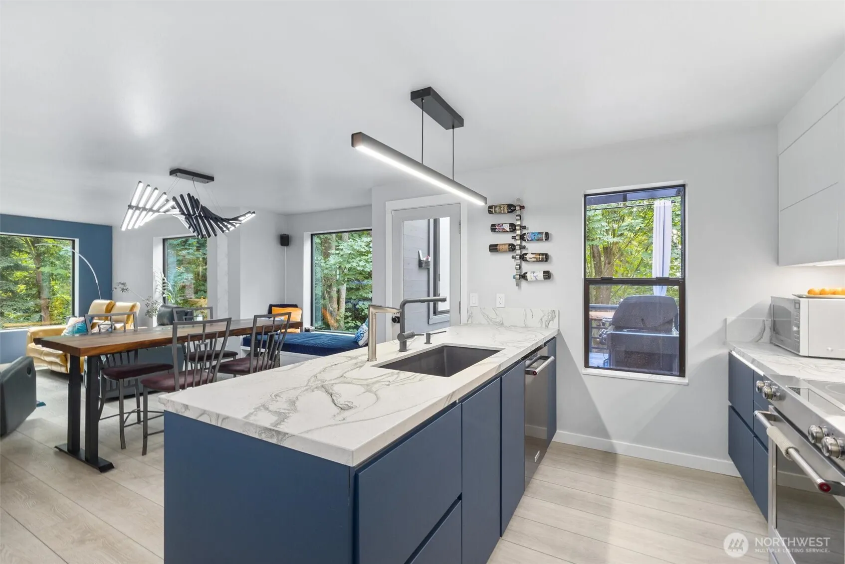 Modern Luxury Meets Outdoor Serenity. Experience elevated living in this reimagined modern retreat, where smart technology, high-end design, and tranquil outdoor spaces come together. This fully remodeled 2-bed, 1-bath home showcases motion-lit stairs, a stunning kitchen with custom cabinetry, premium Dekton countertops, radiant heated floors, and customizable LED lighting. Step out to a spacious covered deck with infrared heaters and ravine views. Enjoy a detached studio, tiki bar, fire pit, sheds, and more—offering a private resort vibe in Mukilteo, walking distance to the beach and minutes from the Sounder, waterfront, Boeing, and Paine Field. And the cherry on top: No HOA!
