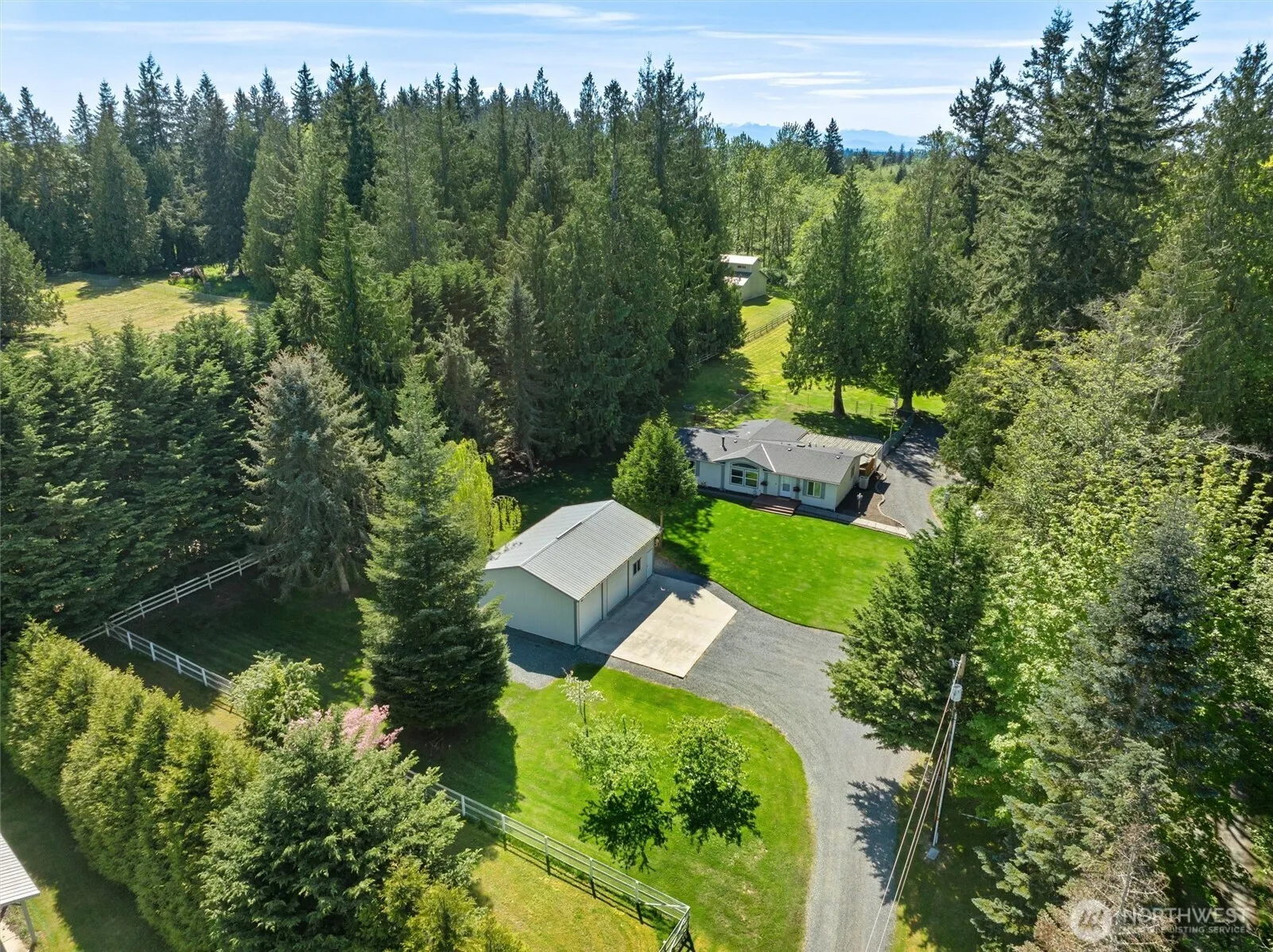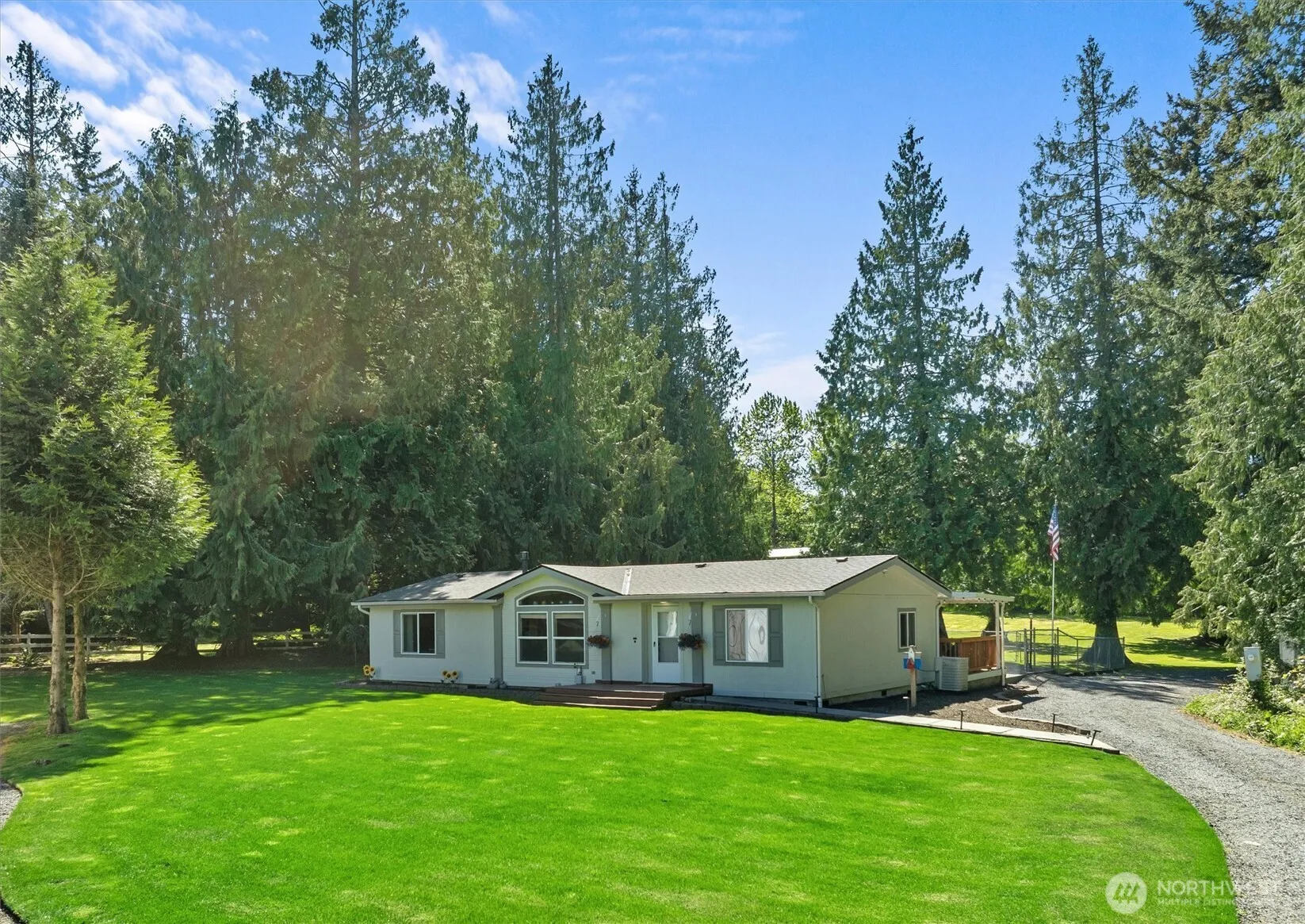 Immaculate home and SHOP on almost 2 park-like ACRES in the Seven Lakes Community! Move-in ready 1670 sq ft, 3-bedroom, 2-bathroom home is situated down a long, private driveway minutes to Lake Ki. One level, open concept floor plan with vaulted ceilings, neutral paint, wood laminate floors and desirable split floor plan. Covered back deck, extra-large patio and fenced off area, perfect for pets. Heat pump and wired for a generator too! Impressive 24×36 SHOP with 10 ft doors, perfect for all your toys! Additional storage shed, fire pit, RV parking and no HOA! Dry, flat, useable property! Tranquil setting, yet minutes to amenities and I-5!