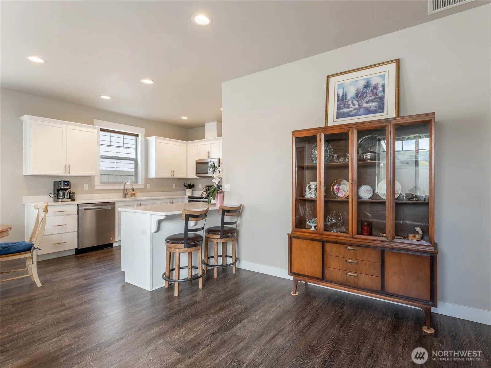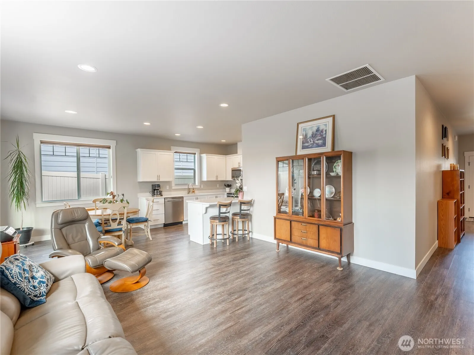 This one level home is turn-key and centrally located! This over 55 community does allow for 20% of owners to be under 55 with approval from the HOA. This home welcomes you with LVP flooring throughout living areas and a gorgeous kitchen with white cabinetry, quartz counters and both peninsula and dining room for eating spaces. Step outside to a covered back patio when entertaining. 3 spacious bdr’s with a primary suite showcasing a tiled shower and a walk-in closet. The utility room is off the garage. Easy living with front yard landscaping maintenance included (mowing, edging and fertilizing) in HOA fee as well as snow removal in front.