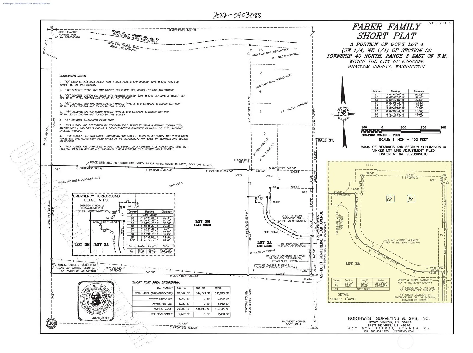 Build your dream home! Enjoy amazing farmland sunsets on this fully serviced lot in Everson city limits. This 2+ acre parcel sits at the end of the sweeping driveway and a build site far enough away from the road. The best location to build is noted based on recent soil test and will require pin pile or helical piers in the foundation, prelim estimate at 18-25k. Finish floor to be 2′ above BFE per City of Everson code or approx 3-4′ above current grade. We did all the hard work (city water, city sewer, Nat Gas, PSE, Comcast on the lot), so you can do all the fun work and build a barndominium, spec or dream home.