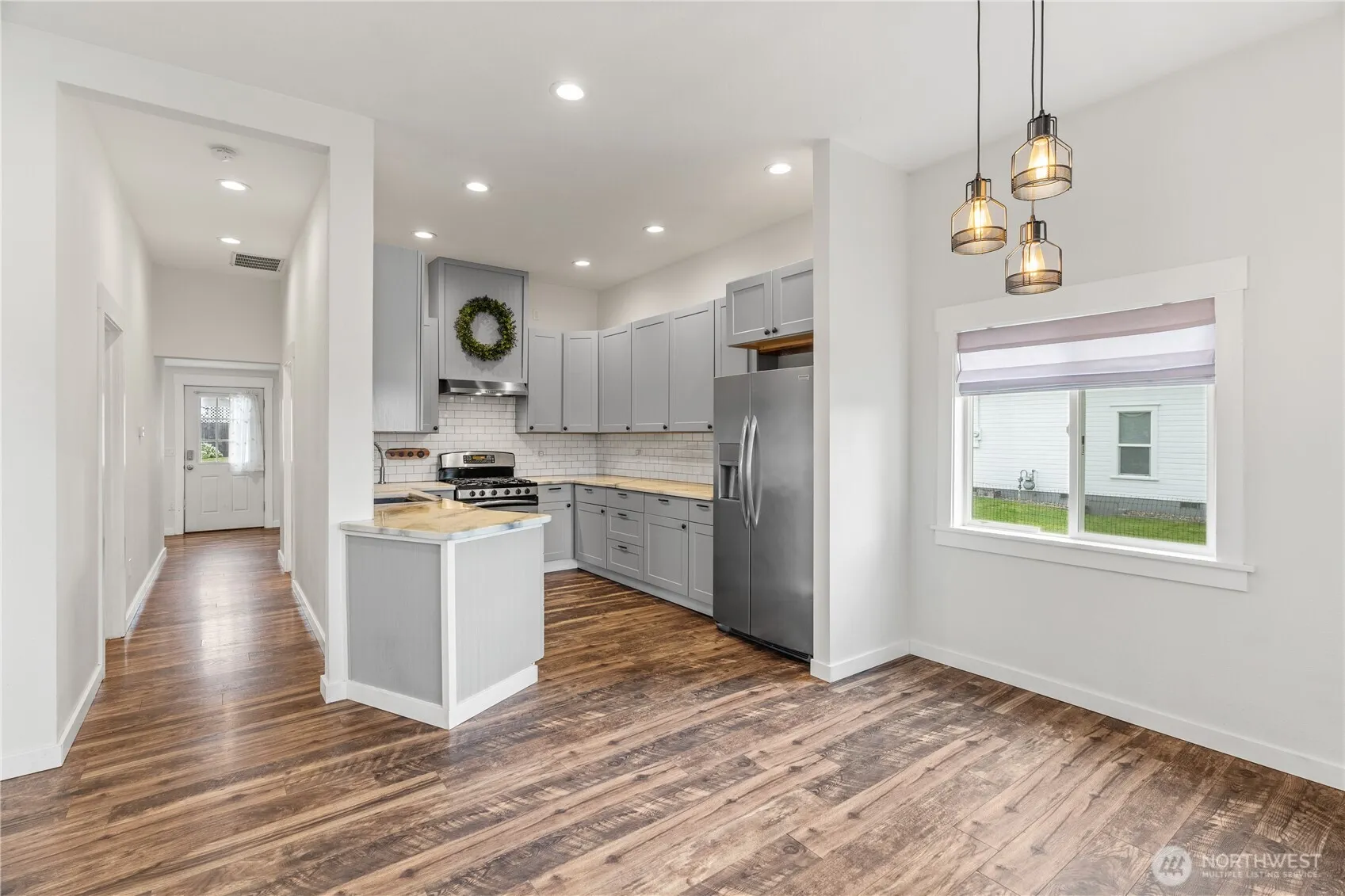 Charming and newly remodeled home located in downtown Elma on an oversized corner lot with a shop! RV Parking, large covered front porch with beautiful tongue and groove wooden ceiling. Inside the home you will find a beautiful kitchen complete with gray cabinets and all stainless steel appliances. Primary bedroom has attached three quarter bath. Large living room with tall ceilings, utility room, second bedroom and full bathroom also located on the main floor. Upstairs has a 3rd bedroom that is absolutely picturesque with a quaint nook and a great street view. Newer windows, siding and ductless heat pump for those warm summer days coming! Don’t miss this one.