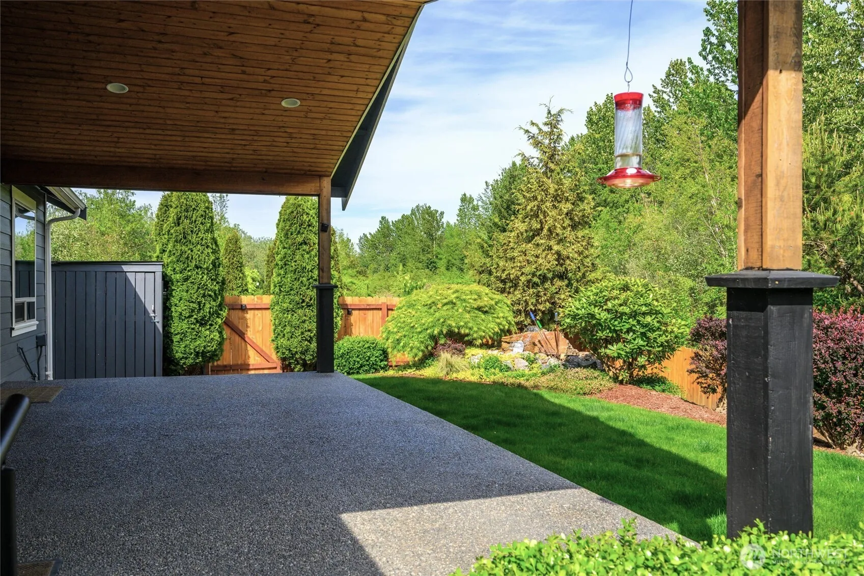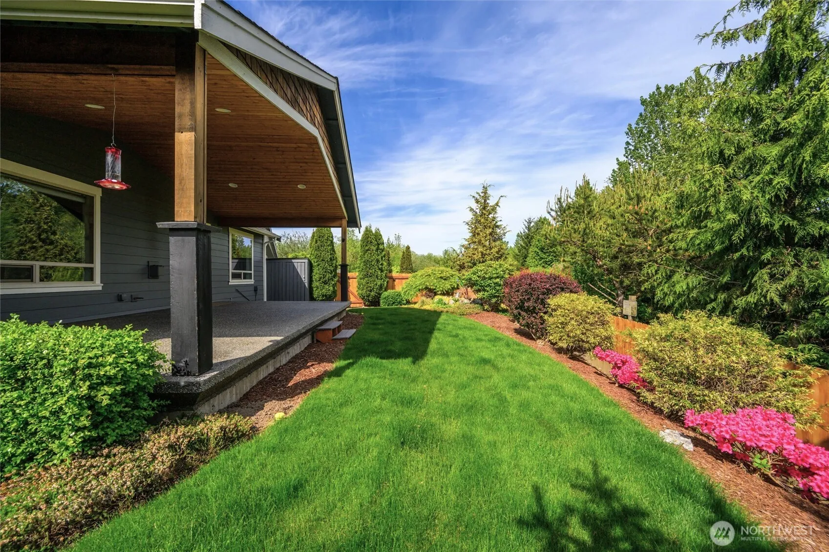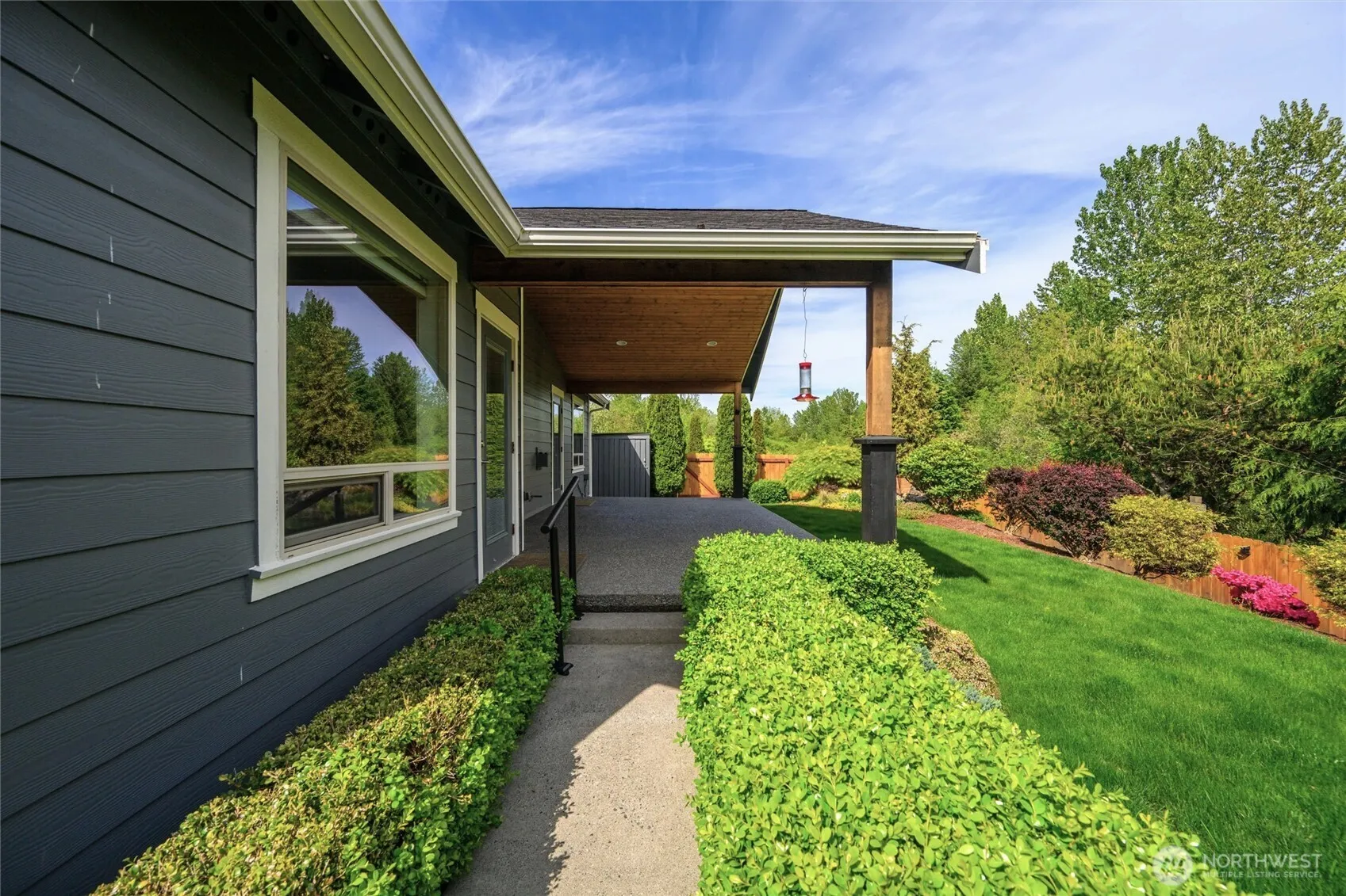 PRISTINE RAMBLER nestled in the quiet Skyview neighborhood, where pride of ownership abounds. 3 bed/2 bath open plan features airy vaulted ceilings, a gas fireplace & luxury vinyl plank flooring. Extensive windows throughout welcome the natural light. Bright & functional kitchen with walk-in pantry & breakfast bar. Primary ensuite bath & generous walk-in closet. Cordless window shades, 2 ceiling fans & many accessibility/safety features like a garage entry ramp. Glass doors open to a huge covered patio with gas BBQ connection. Delightful fenced backyard with manicured gardens & a striking water/rock feature. It backs onto a 15-acre green space & wildlife sanctuary. Meticulously maintained, with many upgrades, it’s your perfect forever home.