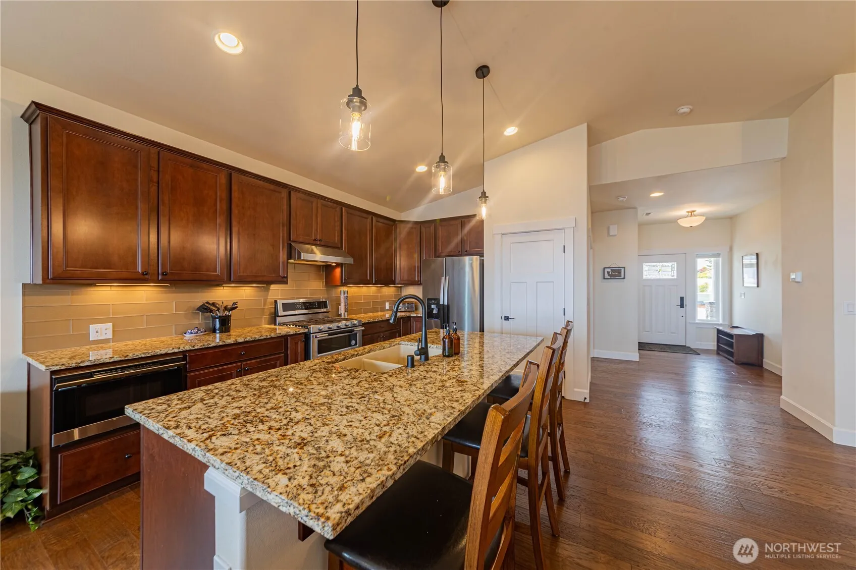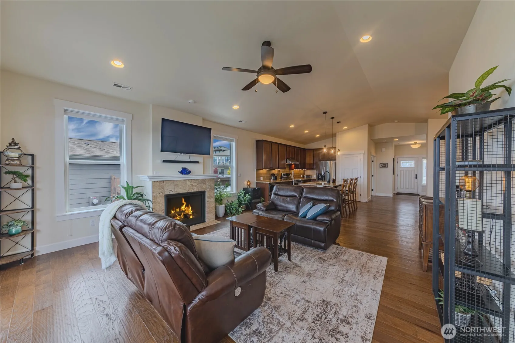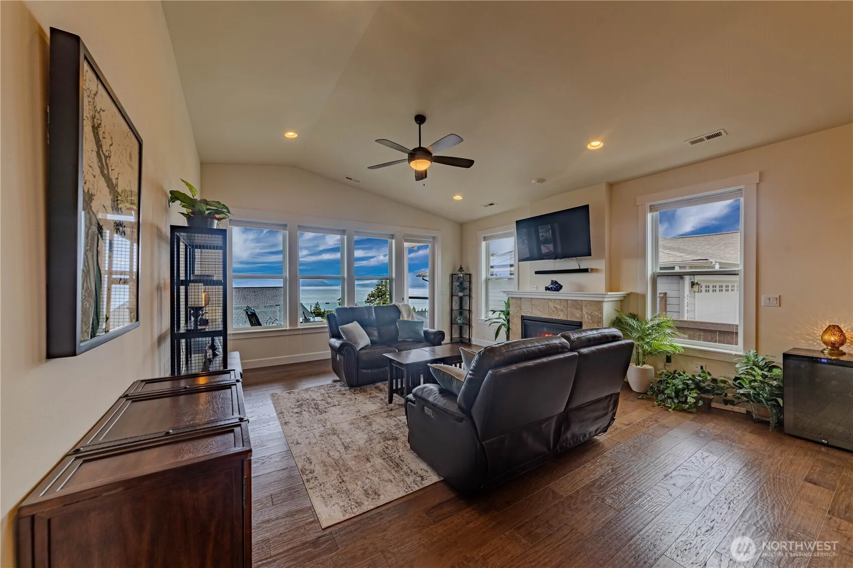 Breathtaking views of mountains & sparkling waters of the Puget Sound, transform daily life into an endless getaway. Open-concept design is complete with wide-plank hardwoods, AC, tankless H20 htr, 23 solar panels, EV outlet & more. Main level: gourmet kitchen, center island, dining, living, covered deck with infinity glass, primary suite, bed/office, 3/4 bath, laundry & 2 car garage. Downstairs: discover flexibility with 2nd living room, covered patio + views, 2nd kitchen, media/office, 2 add’l bedrooms, large 2nd laundry & full bath —ideal for multi-gen living, guests or possible rental (Buyer to verify). Plenty of storage. Enjoy the landscaped, irrigated & fully fenced yard. Moments away from vibrant local amenities, ferry & lush parks.