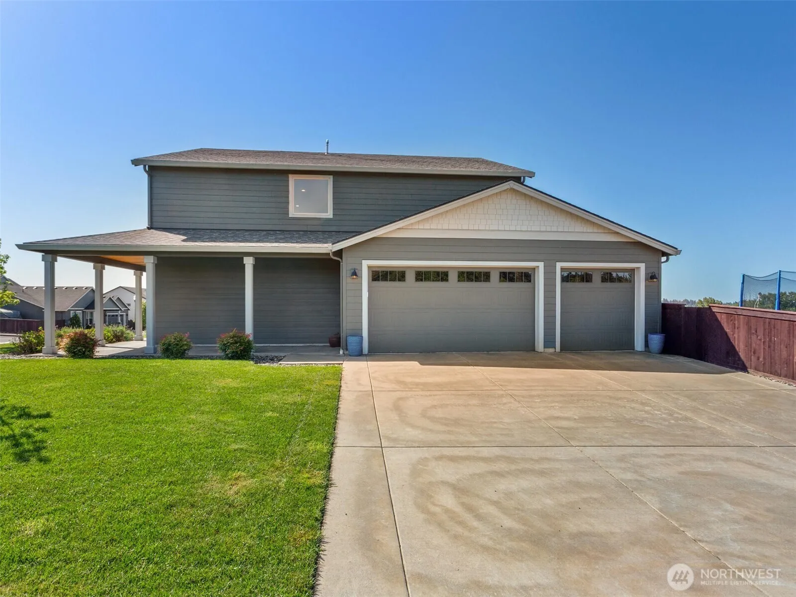 Tucked away on a prime corner lot in La Center, this 2019-built masterpiece offering 2,719 square feet of modern living on a 9,200-square-foot corner lot with territorial views.The property is framed by a wraparound covered porch and includes a three-car garage for ample parking and storage. Step through the front door, where gleaming luxury vinyl floors lead into a spacious, open living and dining area. A dedicated office room, tucked just off the main area, provides a quiet space for work or projects.The kitchen connects effortlessly to the dining and living areas, creating a cohesive and functional space. Preferred lender offering special financing.