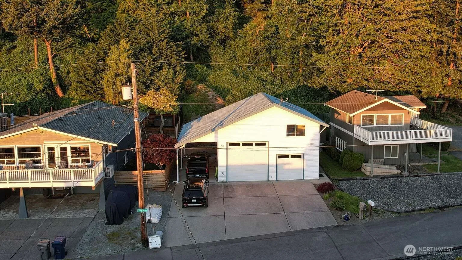 Waterfront property is at McKee’s Beach on Port Susan Bay, about 45 miles north of Seattle, no ferries. This offering includes two lots: a waterfront home and a large detached garage with workshop and flex room. This 3-bedroom, 1.5-bath home has two bedrooms, baths, laundry, kitchen, living room on main level with radiant floor heat. Kitchen has quartz countertops, pantry, and eating space. Main bath has cultured marble and jetted tub. 2nd level has a third bedroom with walk-in closet. Across the lane, is a 1,350 sq ft garage/shop with 7,000 lb car lift and carport fitting a Class C RV, upstairs is a room with pool and card table. Comes with 12’x12′ garden shed, kayaks, 2 buoys. Parking for 11 cars. Community has private boat launch.