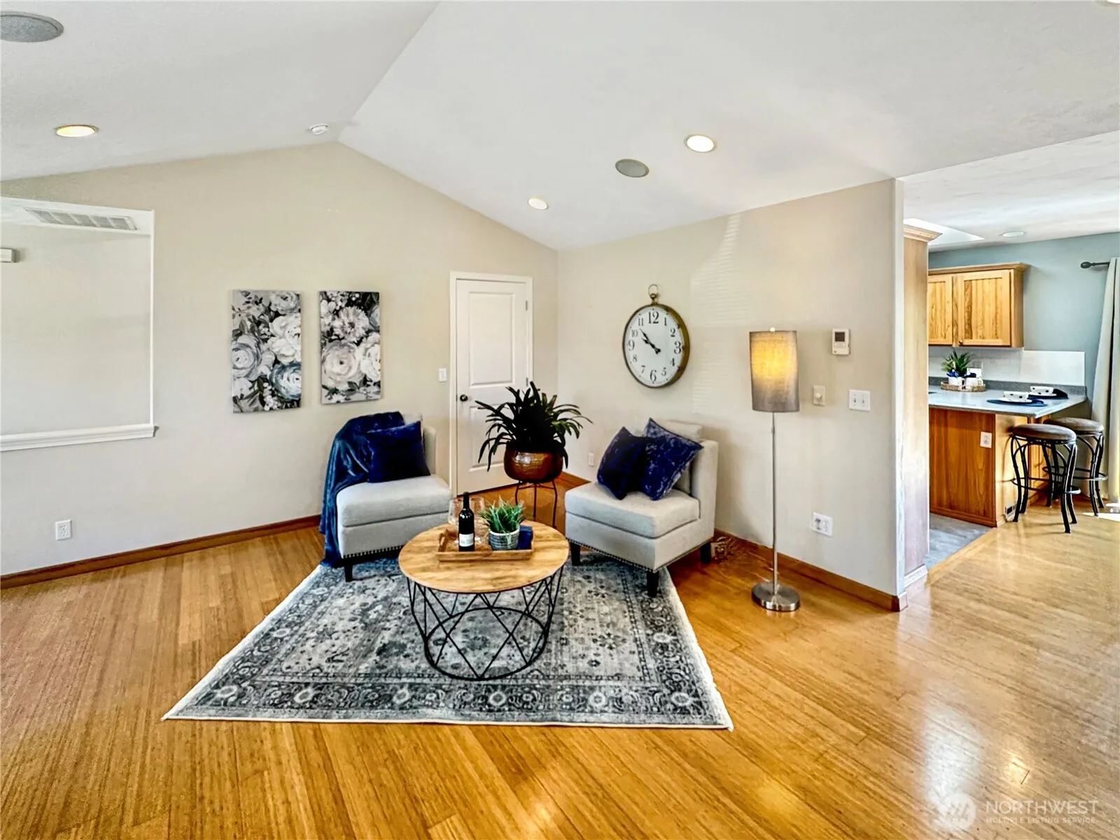 Charming home on .76-acre lot offering serene views and thoughtful landscape. Main floor offers vaulted, open great room design with sweet gas fireplace, generous dining area & big kitchen with hickory cabinets & solid surface counters. Large laundry room too, extensive bamboo hardwood flooring, large deck with territorial views off dining area. Main floor master with walk-in and private bath newer laminate flooring. Lower-level features large family room, 2 additional bedrooms & office. Slider leads to patio/rear yard. Yard is fully fenced with firepit, garden beds & chicken coop. Additional garage storage bay ideal for lawn equipment & lawn furniture.