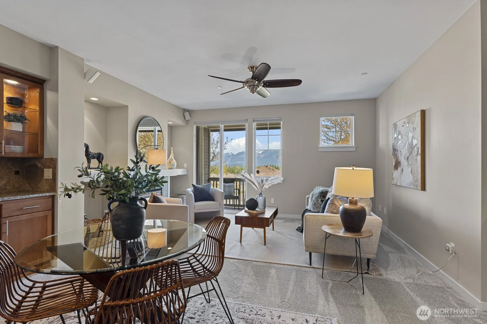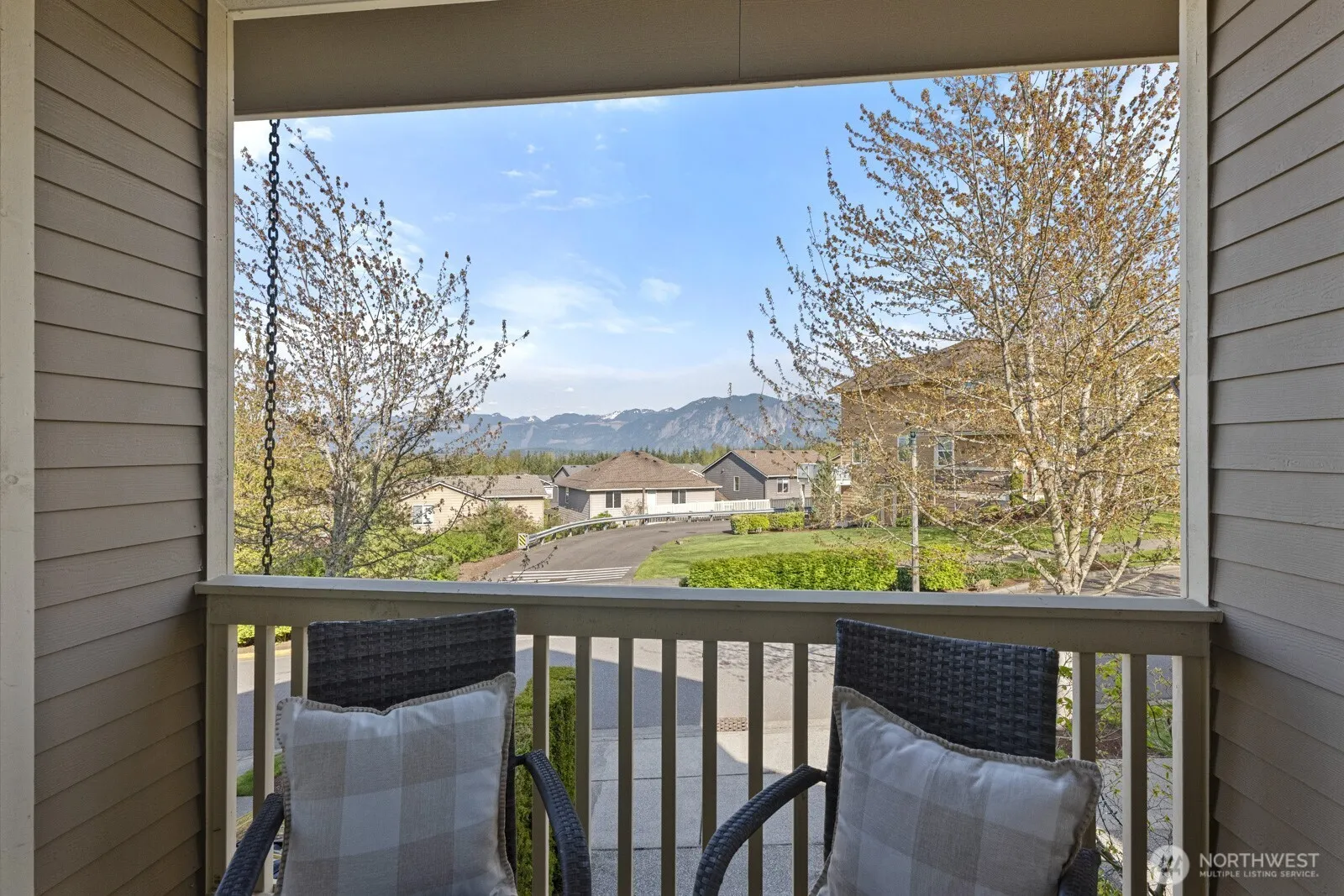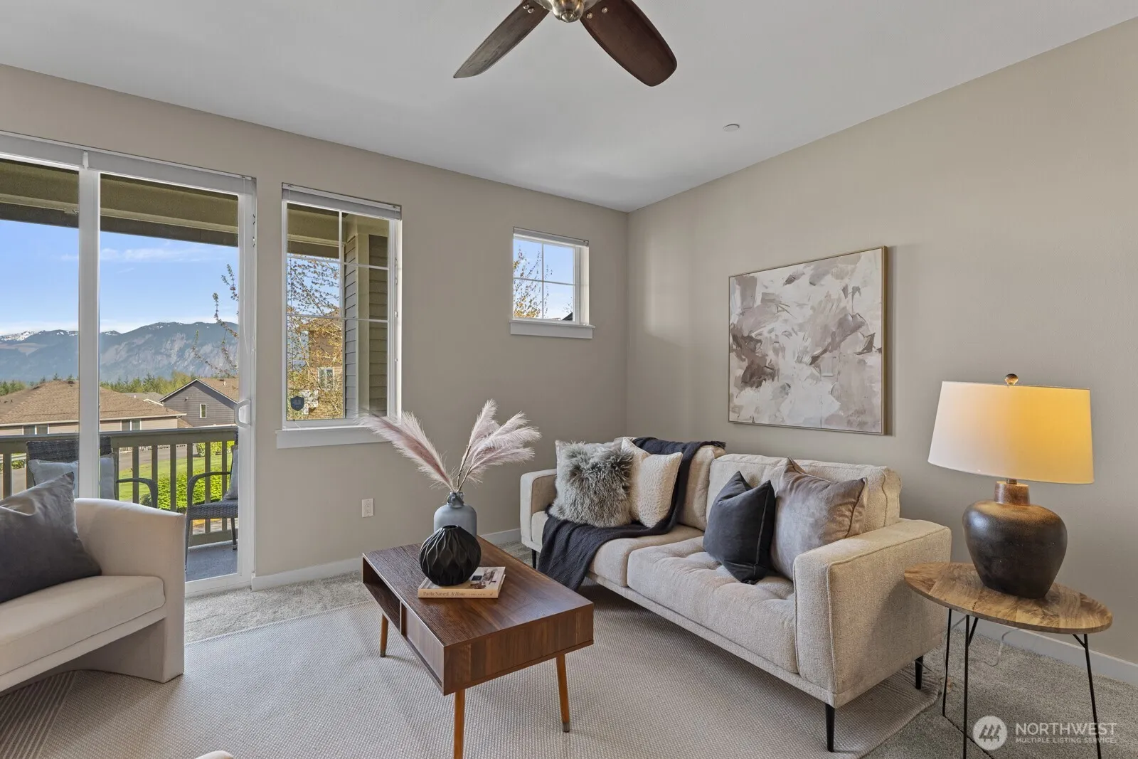 Wake up to stunning views of the incredible Cascades from this spacious home at The Ridgestone in Snoqualmie Ridge. Delightful single-family townhome. Light-filled end unit. Soaring ceilings create an airy feel, and the kitchen/great room is perfect for entertaining. Relax on the view deck or the private patio. The main level offers a bedroom/office and 3/4 bath. Open kitchen with spacious island. Cozy gas fireplace, separate family room. Upstairs, both bedrooms feature ensuite baths; the primary suite highlights beautiful mountain views. New carpet throughout. Huge 2-car tandem garage with extra storage/workshop space. Easy access to I-90, top-rated schools, parks, dining, and shopping. Low dues include yard care. Pre-inspected. Welcome!