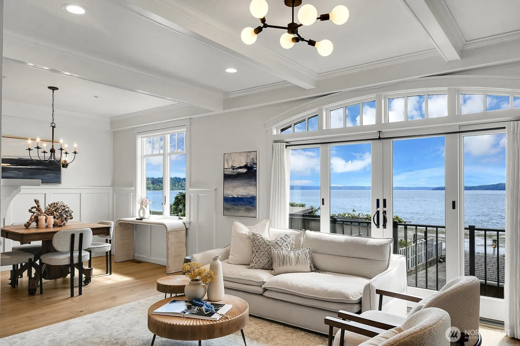 Three Tree Point waterfront. Set along iconic & lively 172nd street, reminiscent of Southern California coastline, the custom 2006 home allies functionality & charm w/its newly updated breach style. Designed to maximize views & privacy, the house allows for a no-stairs access (elevator-ready) & versatile uses: main residence min to airport or “lock & go” vacation retreat. A surprisingly spacious foyer & ground floor bedroom welcome guests. Warm elegance & striking water views for the main level w/its beamed ceilings, artful millwork & soothing palette. The sanctuary upper floor enjoys double primary en-suites. Den/office can be 4th bed. On the water’s edge: charming cabana, mooring buoy, entertaining area & rare RV parking + boat launch.