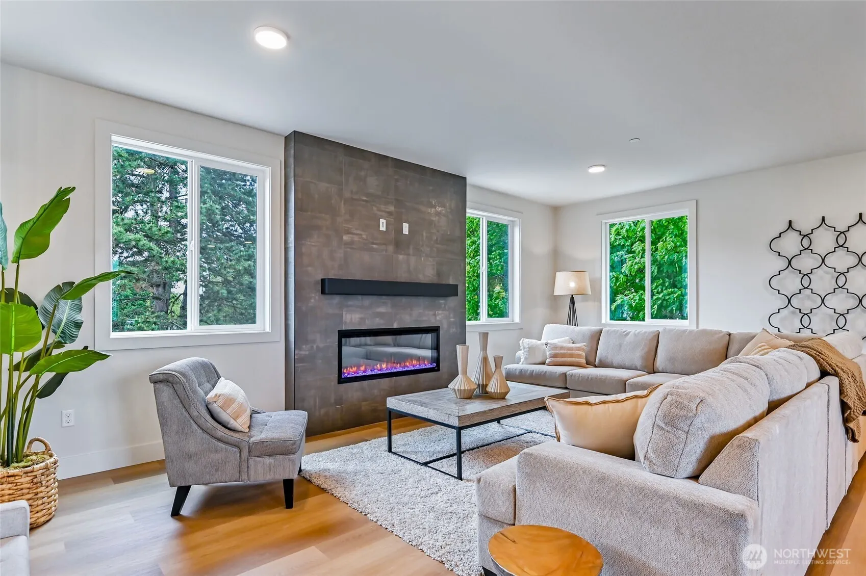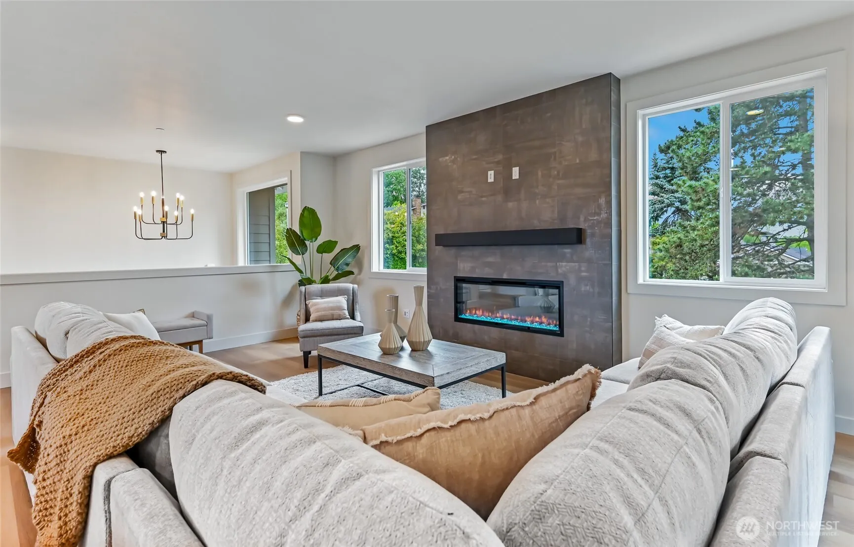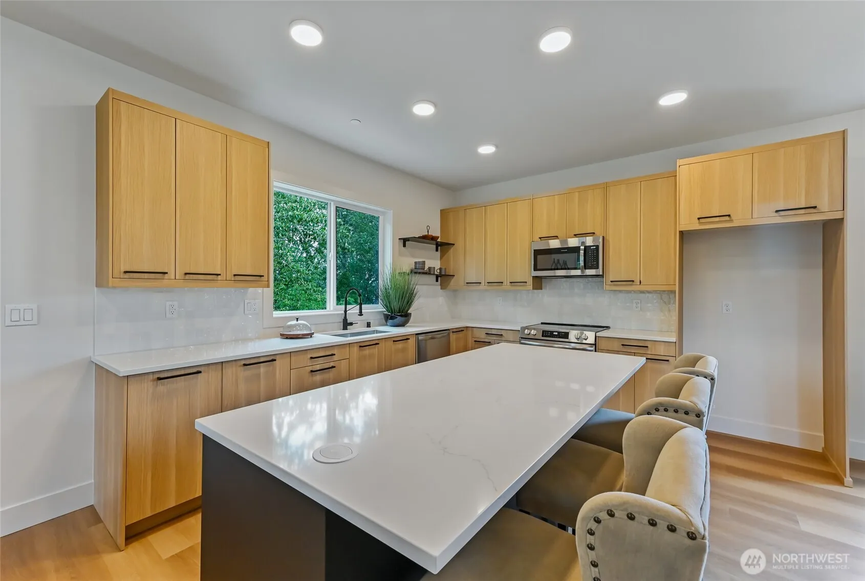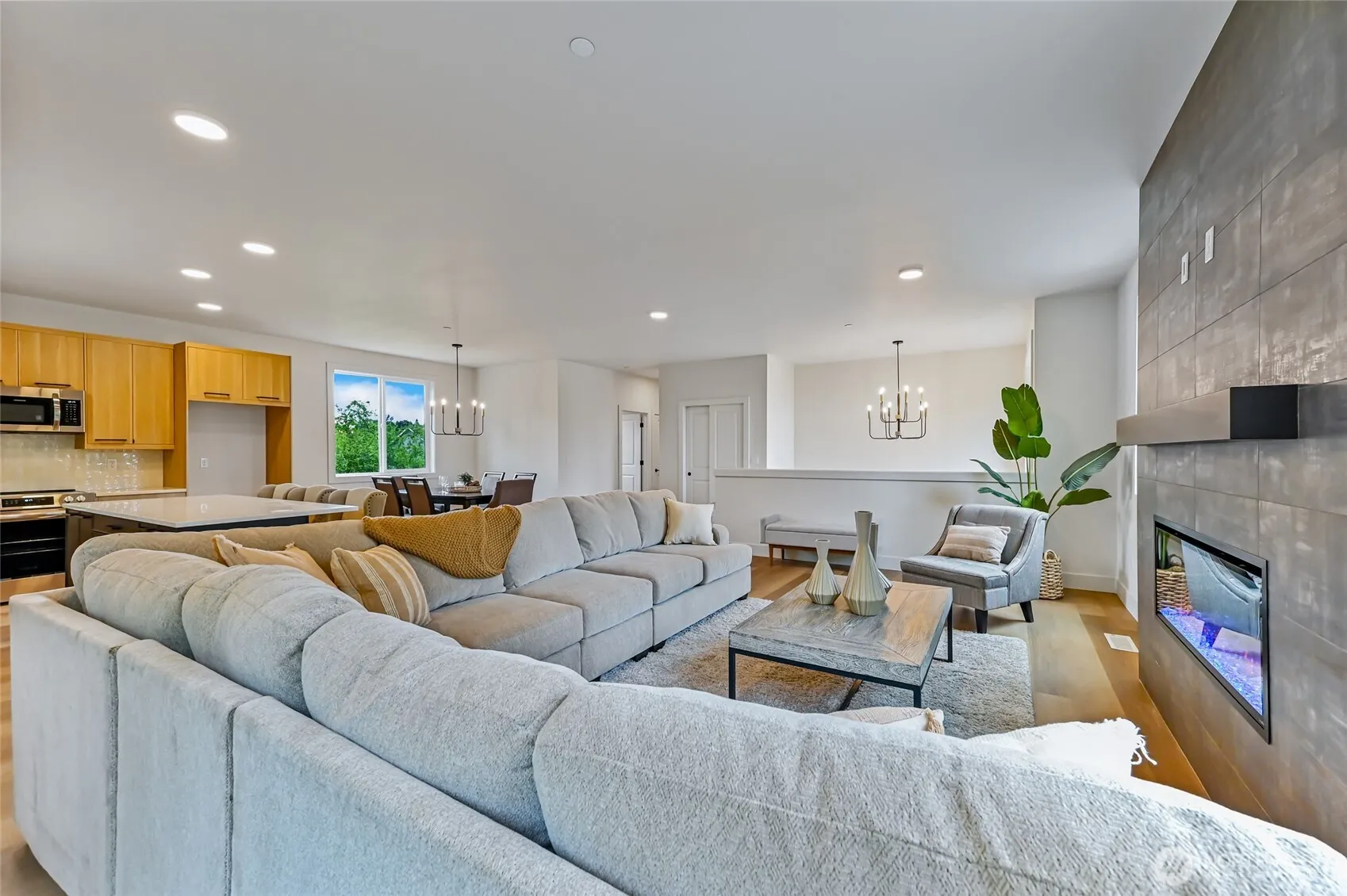 A warm welcome awaits; vp wood floors greet you at entry & continue thru main living area. Great room w generous eating area opens to expansive quartz kitchen; convenient island; tons of cabinetry. Classy tile work, ss appliances, finishes on both levels. Main level you’ll find primary suite, 2 other large bedrooms, a big great room w/fireplace & another bath. Giant sized closet spaces, Abundant windows to let all the light in, oversized two car garage w/auxiliary parking too. Lower level has it’s own entry; 2 good sized bdrms, gathering area, & spot to cook, entertain; dine. A/c, charging station, professionally landscaped. Living possibilities galore. No ccrs; Minutes to amenities, lite rail & arterials. Seattle Conveniences w/o hassles