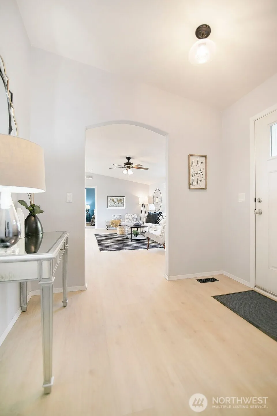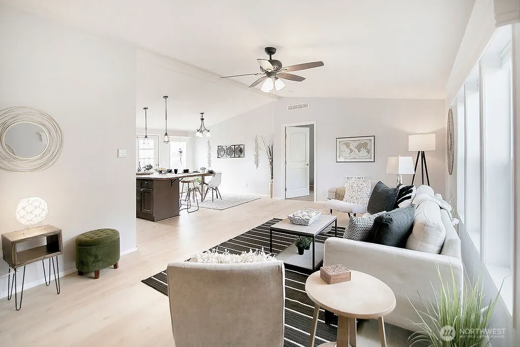 KALAMA — 1 Level — Large Corner Lot — 1512 Sqft — 3 Bedrooms / 2 Bathrooms — Living Room — Kitchen w/ Island & Eating Counter / Pantry — Plus Dining Room — Great Room Concept — Primary Bedroom w/ Walk-in Closet & Bathroom — Laundry Room — Vaulted — New Laminate Flooring — Heat Pump & A/C — Vinyl Windows — Ceiling Fans — Attached Double Garage — RV Parking — Fenced Yard — Garden Space — Patio — Tool Shed — 30 Minutes to Vancouver / Portland Area — Minutes to Kalama — Minutes to I-5