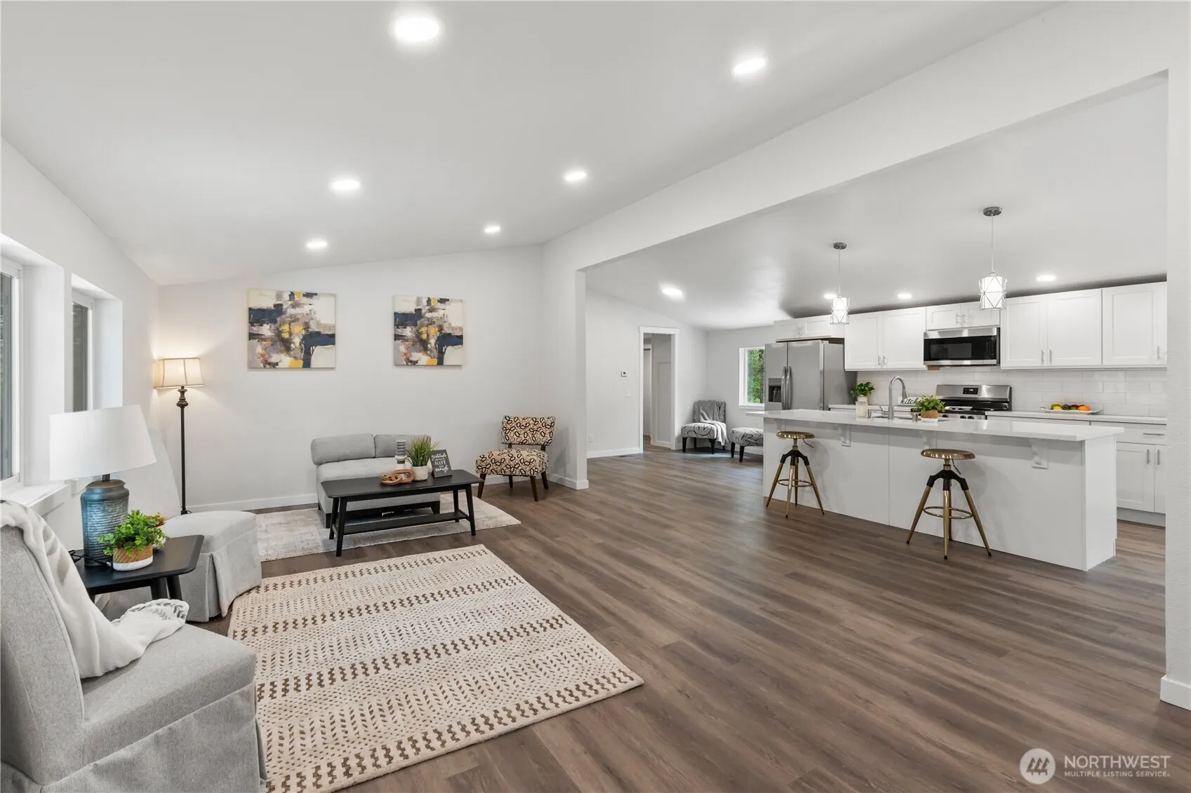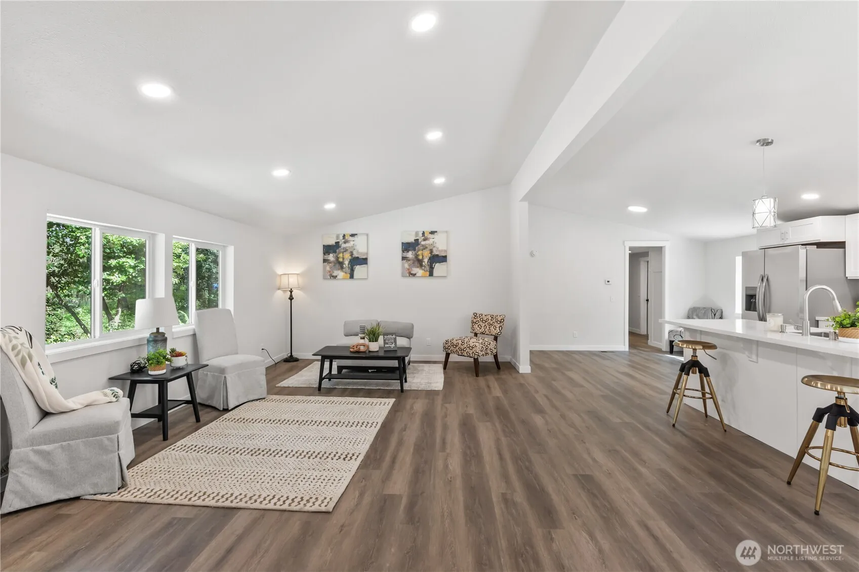 Don’t miss this charming 3-bedroom, 2-bathroom rambler on a private 4.65-acre parcel in Graham! This beautifully updated home features a spacious living room with vaulted ceilings and an open-concept kitchen boasting quartz countertops, all-new stainless steel appliances, and a large island with bar seating—perfect for entertaining. Enjoy all-new flooring throughout, spacious bedrooms, and a separate office/bonus room for added flexibility. The primary suite offers a walk-in closet and a modern ensuite bath. Fresh interior and exterior paint, new 30-year architectural roof, large back patio, and cozy firepit complete this peaceful retreat. The level 4.65-acre lot offers both privacy and potential for future development!