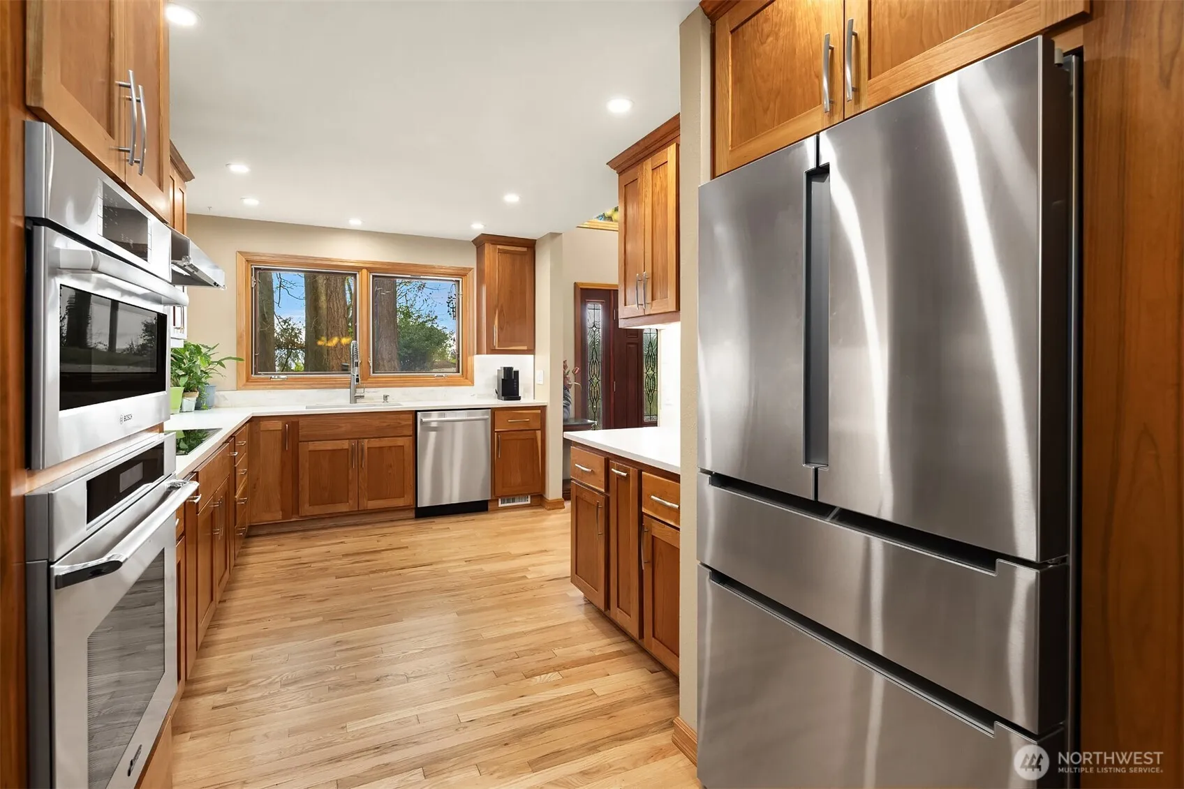 NEW PRICE! Very Private & Cozy home with views of Lake & Mt Rainier. Large, level yard. Dream kitchen with solid cherry cabinets, under-cabinet lighting & quartz counters. Main floor includes dining, living & office, all w/ hardwood floors, triple pane windows w/ integrated blinds & lots of woodwork. Upstairs find 3 beds including Primary with bath, walk-in closet, Rainier views & vaulted ceilings. Downstairs is a Family Room, 2 more beds & kitchenette making for a perfect MIL or rental with separate entry & bath. Home is fully smart-wired. Large lot has level play space, privacy, its own trail system, a hillside full of flowers & view deck. Beach Club right across the street. Follow trails to QFC & Lakeridge Elementary. Fun & adventurous!
